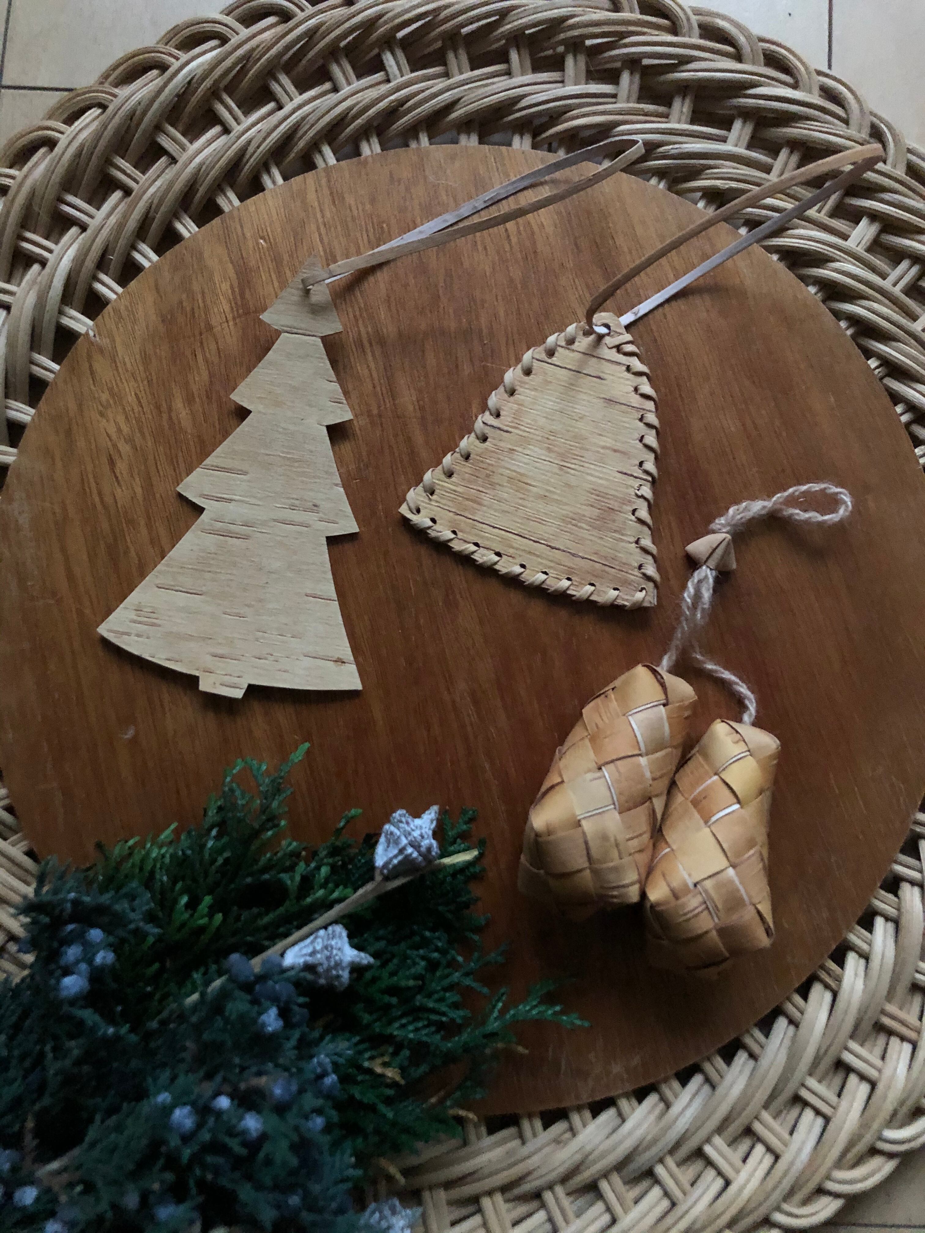 ロシアの白樺職人さん作の、白樺の樹皮をカットして細工したツリーと、ベル、白樺編みの靴型のオーナメントの3点セットです。