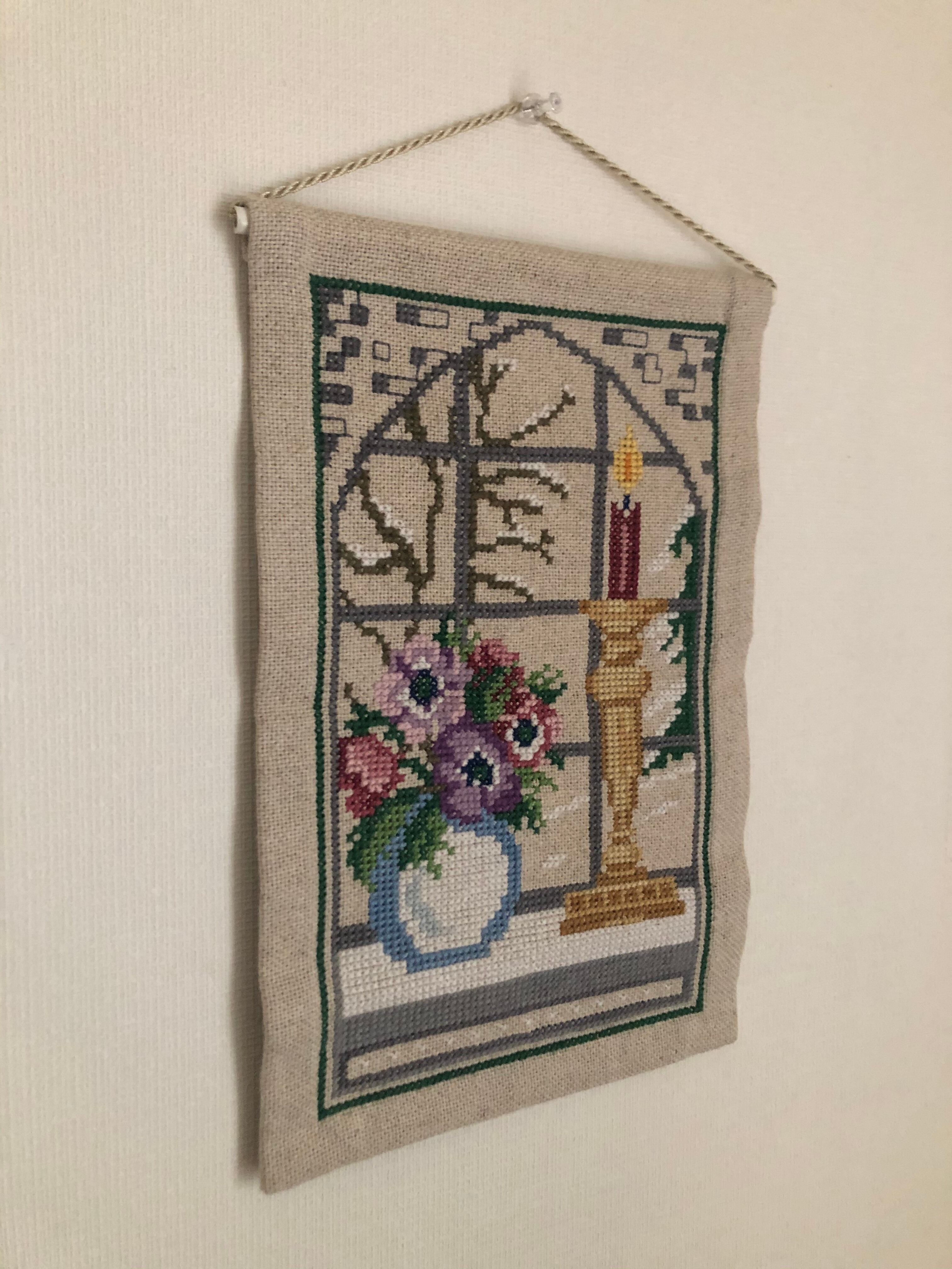 キャンドルと花瓶が置いてある、雪景色の窓辺の風景の刺繍が素敵なタペストリーです。
