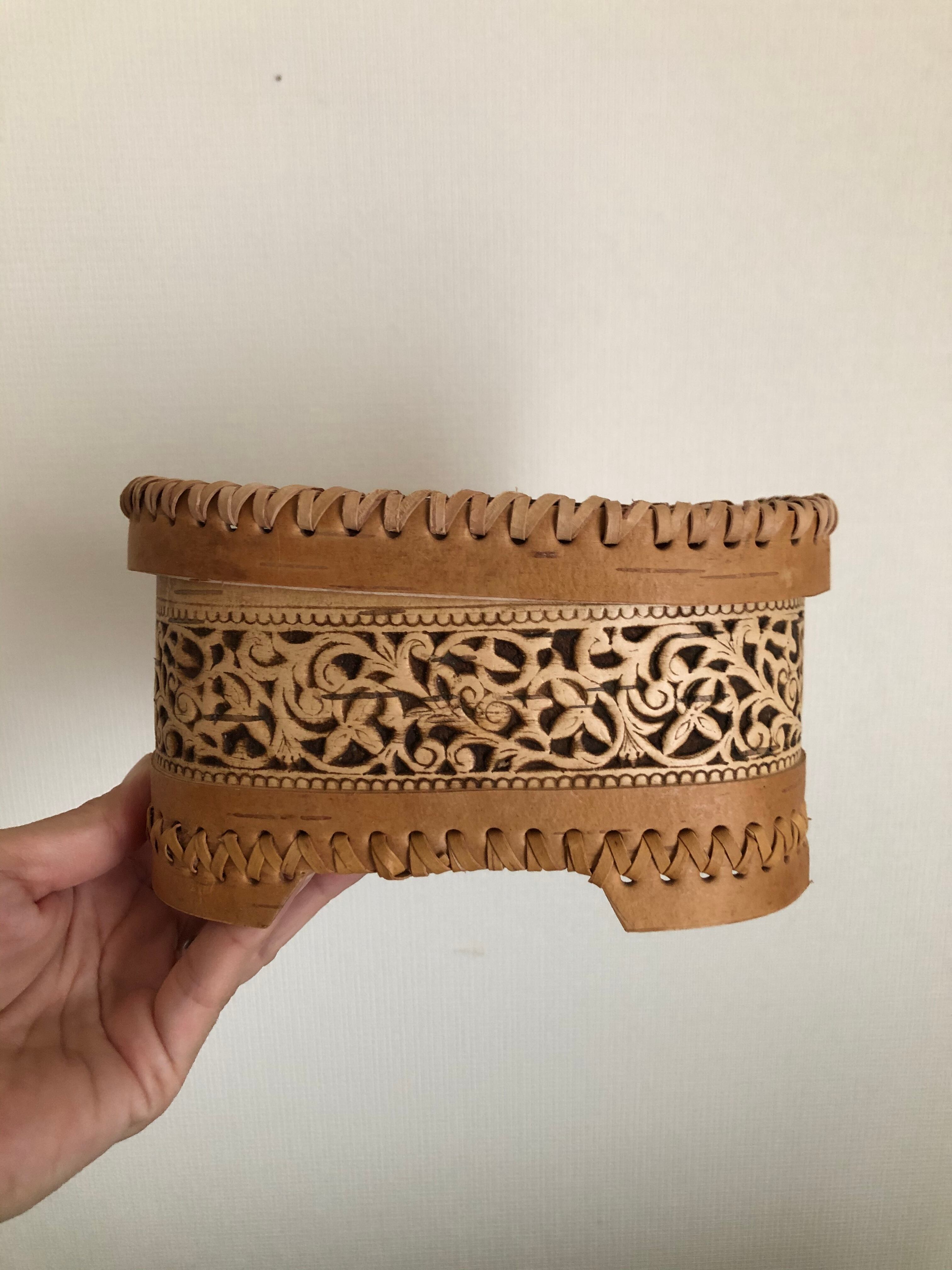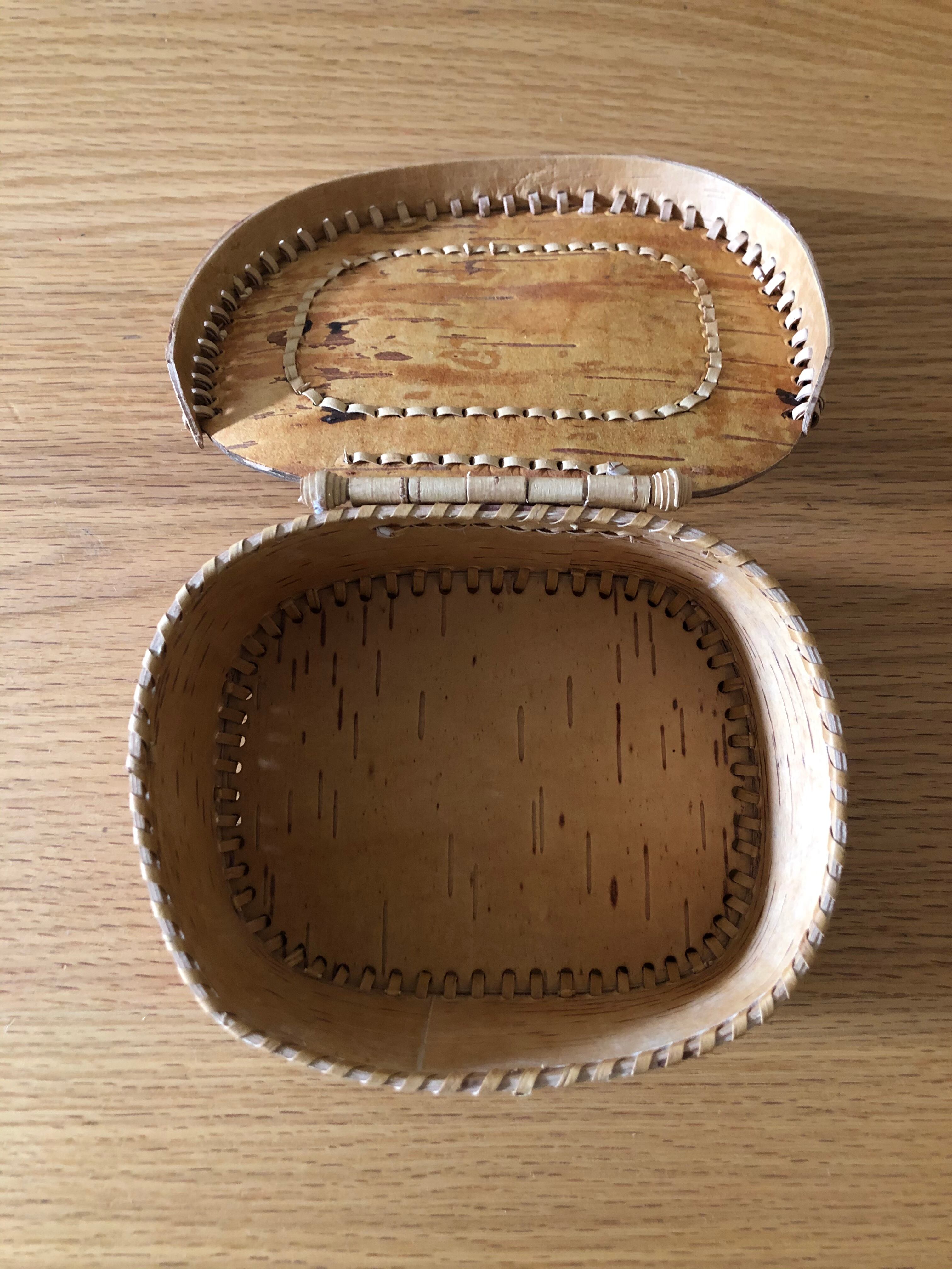 ロシアの白樺細工、ベレスタの型押しの蝶つがい型の蓋つきキャニスターになります。
