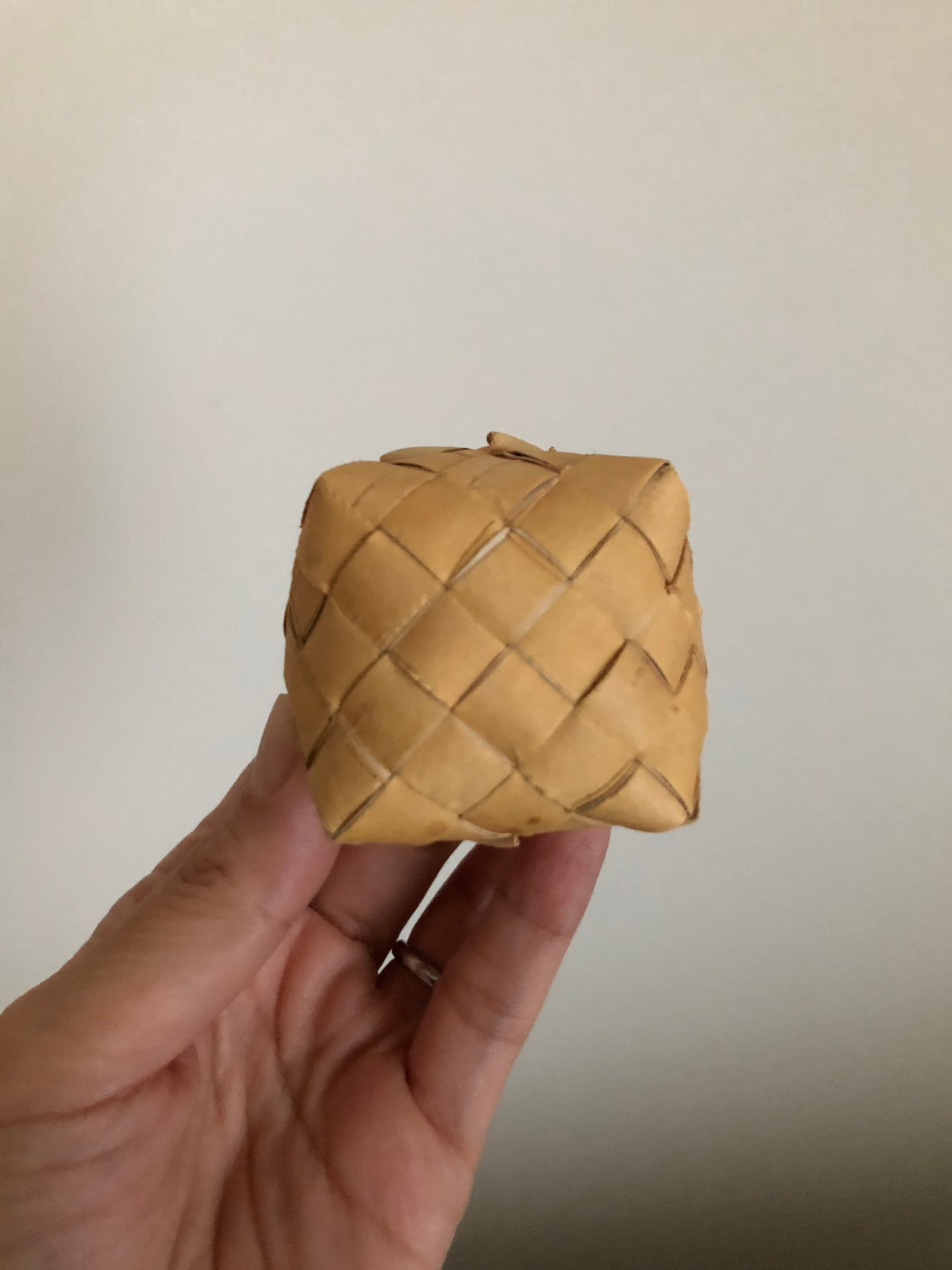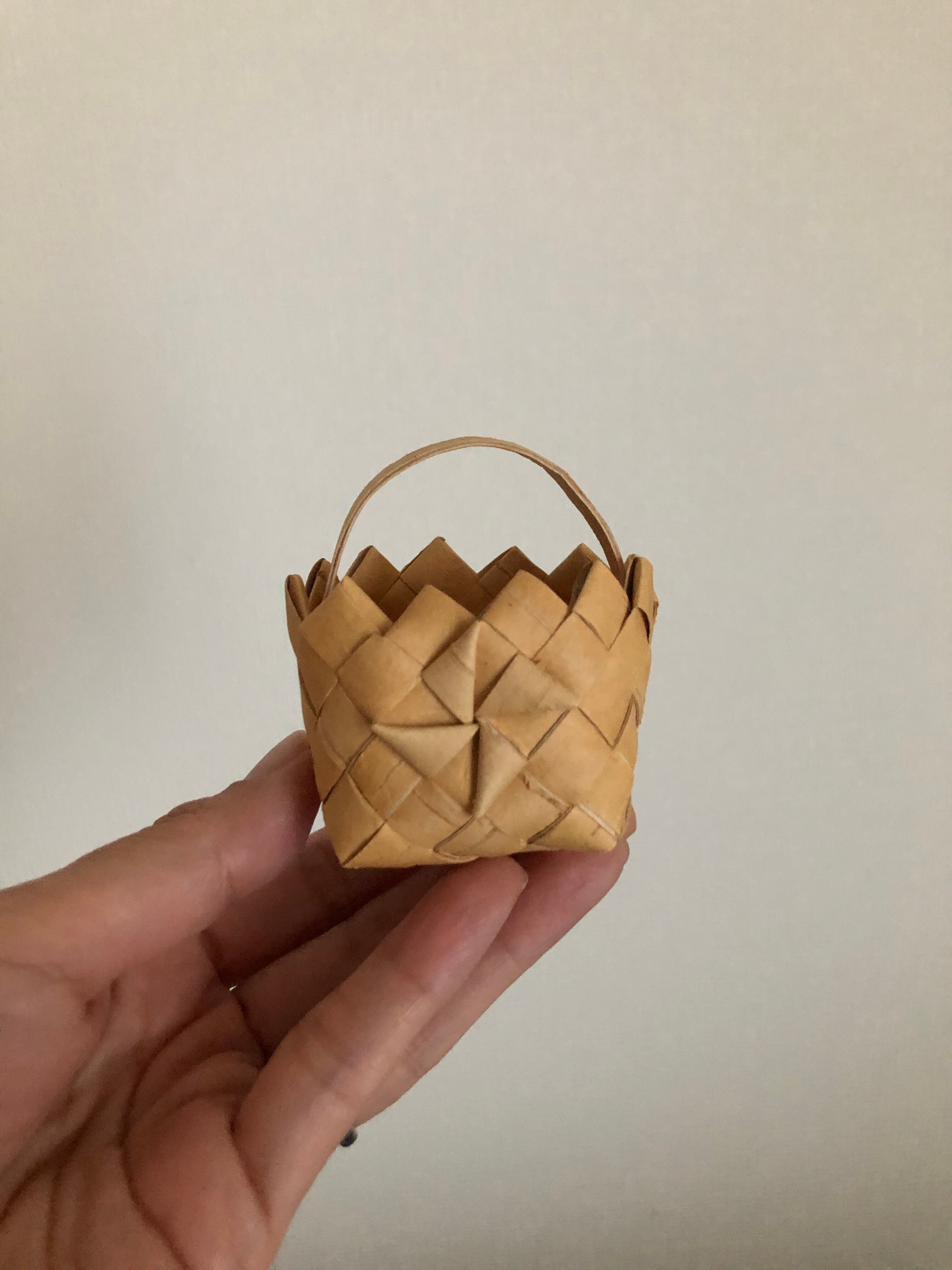 上のギザギザと、サイドの細工、なにより手のひらに乗るミニチュアサイズが可愛らしい、白樺のバスケット♫