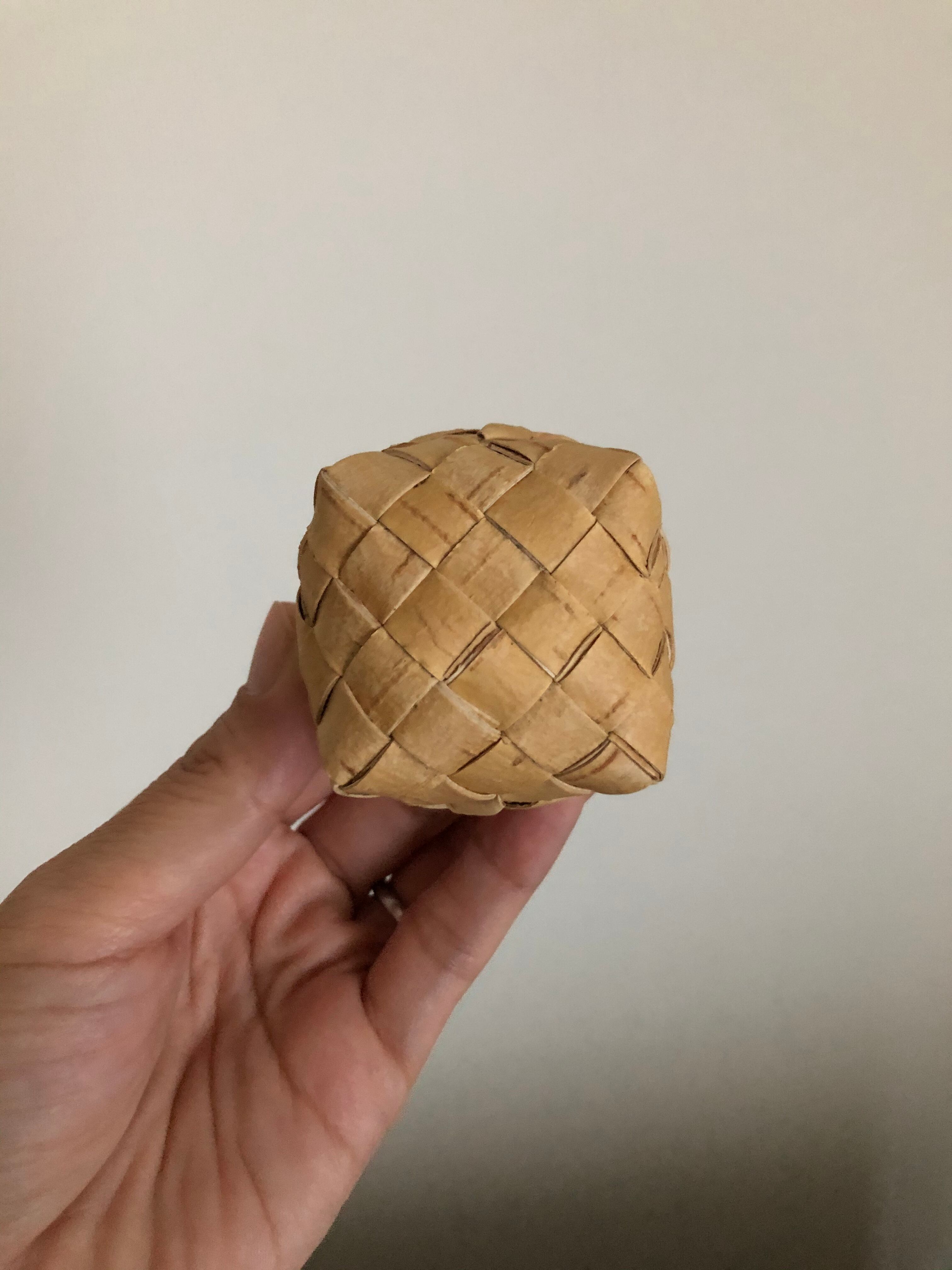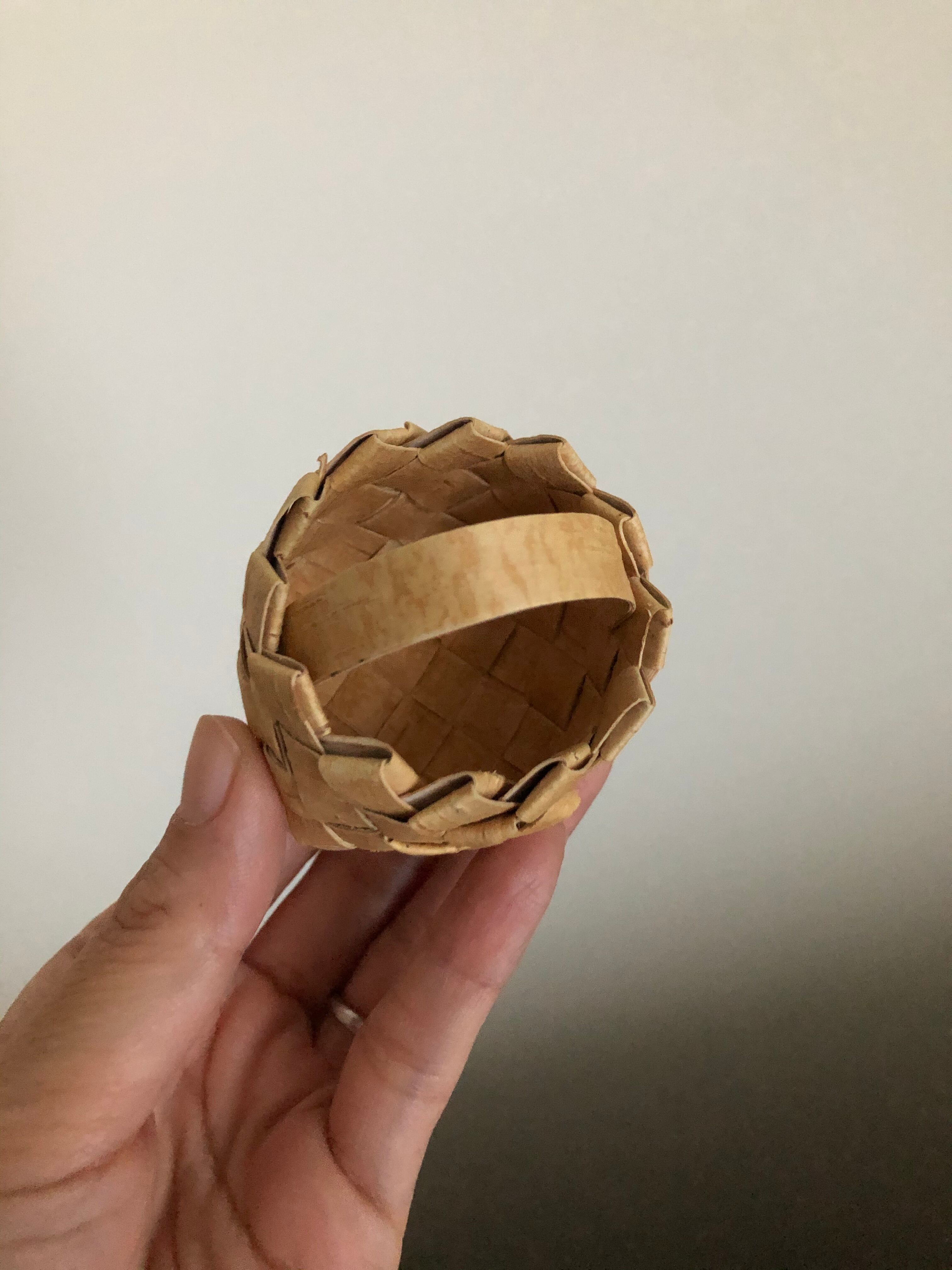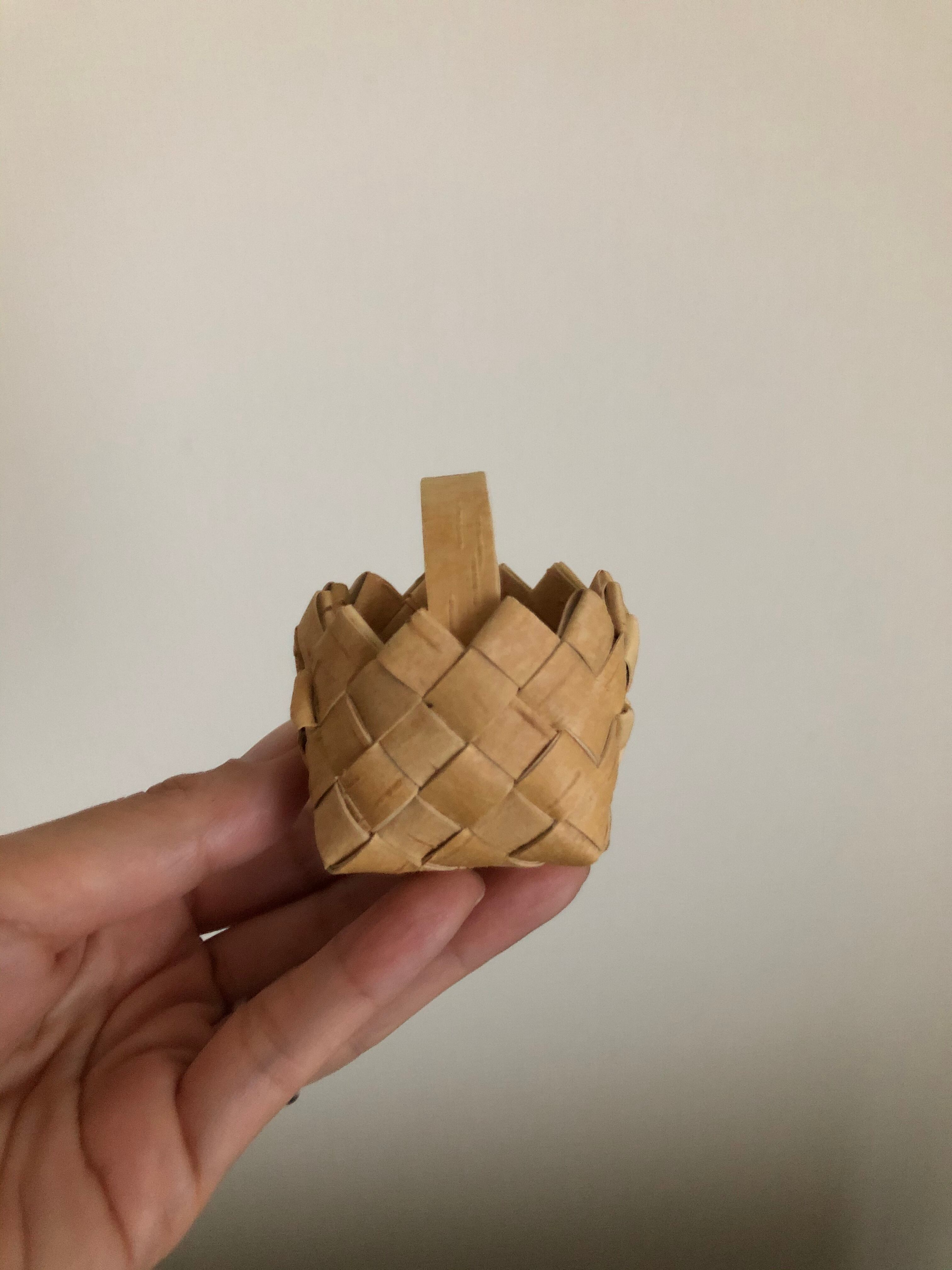 上のギザギザと、サイドの細工、なにより手のひらに乗るミニチュアサイズが可愛らしい、白樺のバスケット♫