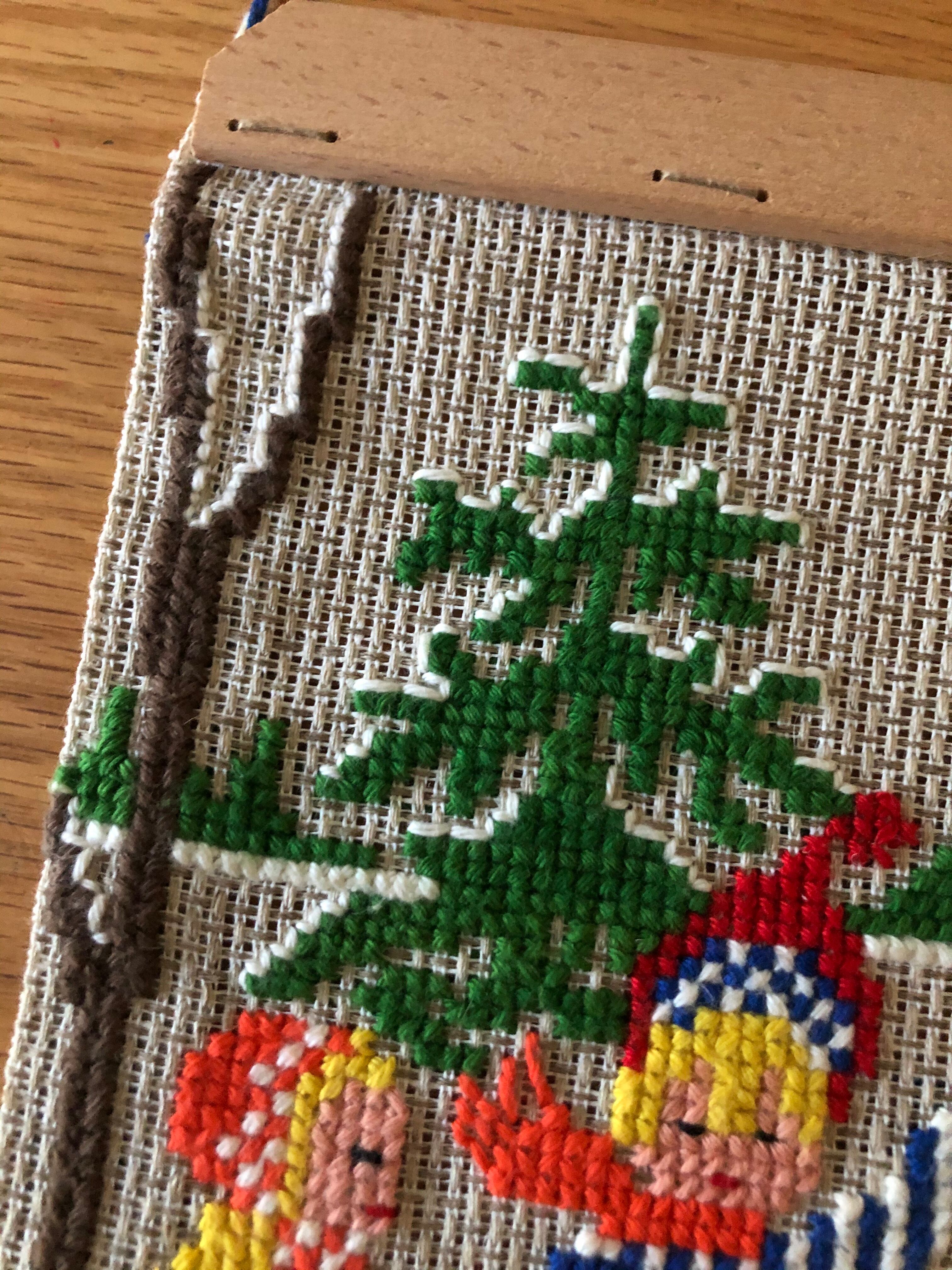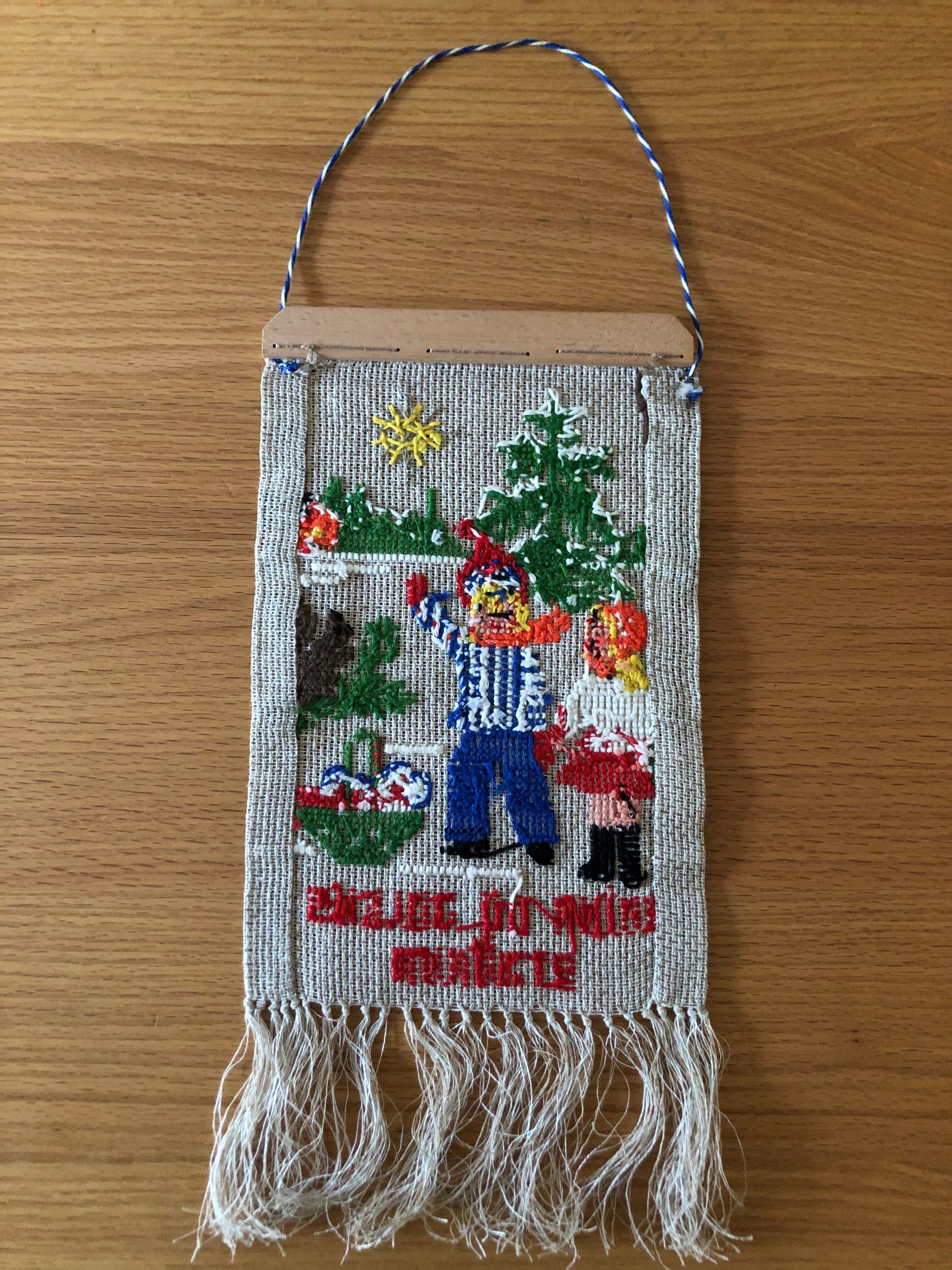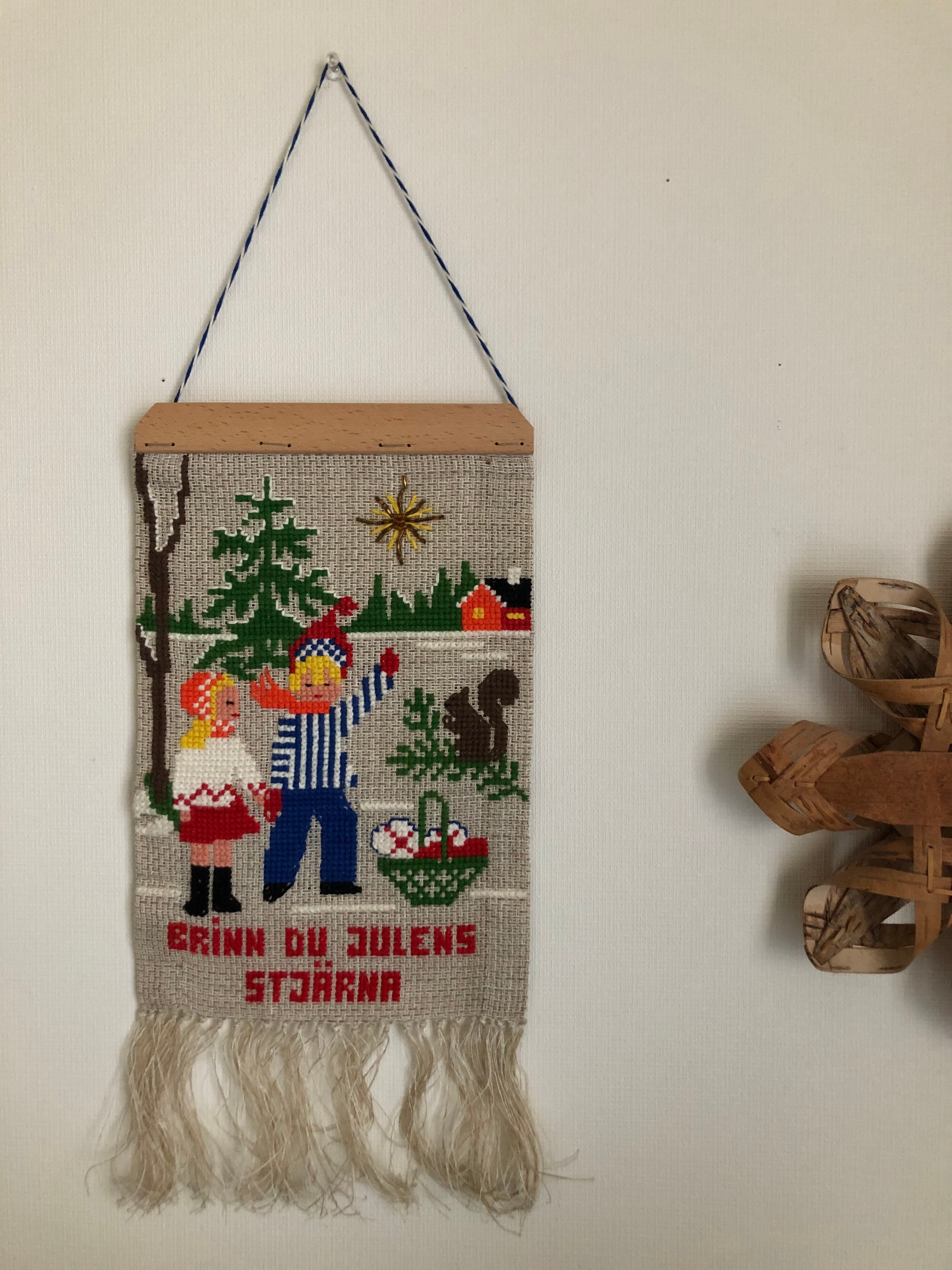 ざっくりしたリネン生地に、ニットの帽子とセーターを着た男の子と女の子、モミの木、さらにリスやバスケットなどの、刺繍のモチーフ、一つ一つがとても可愛らしいタペストリーです♫