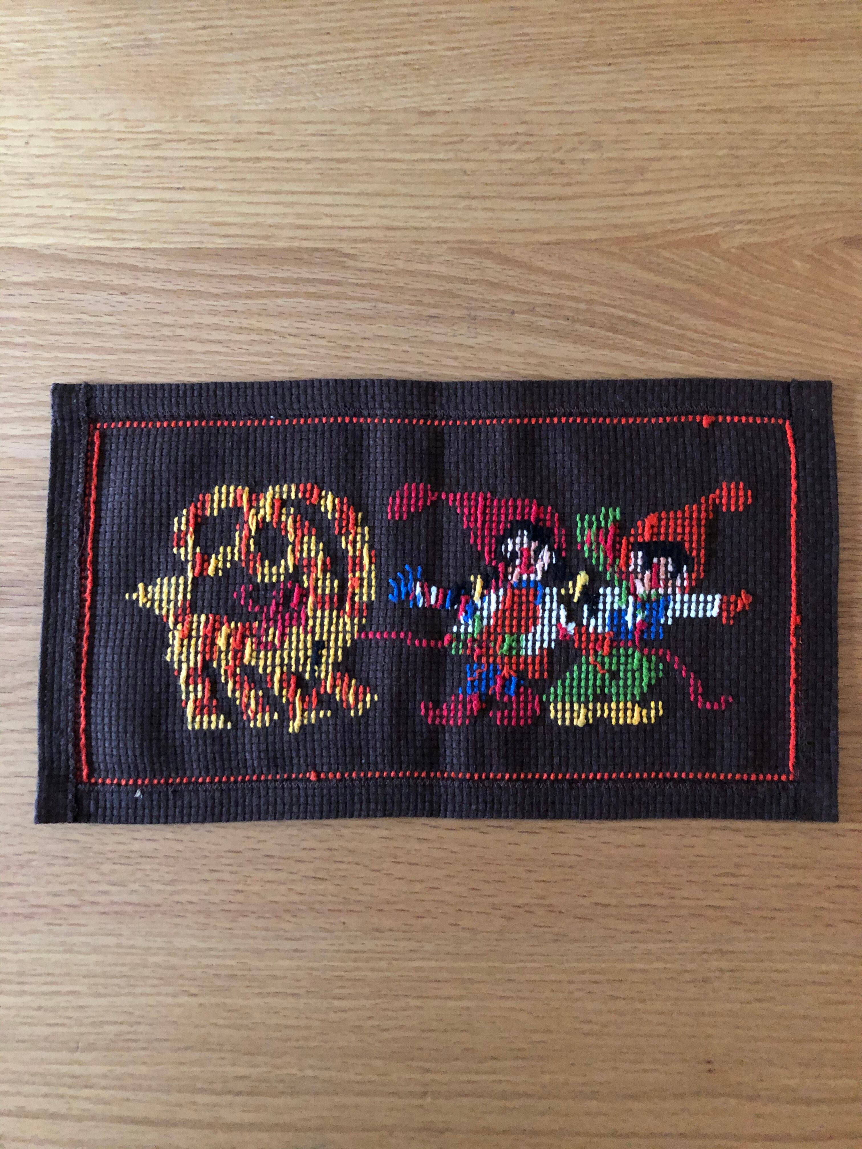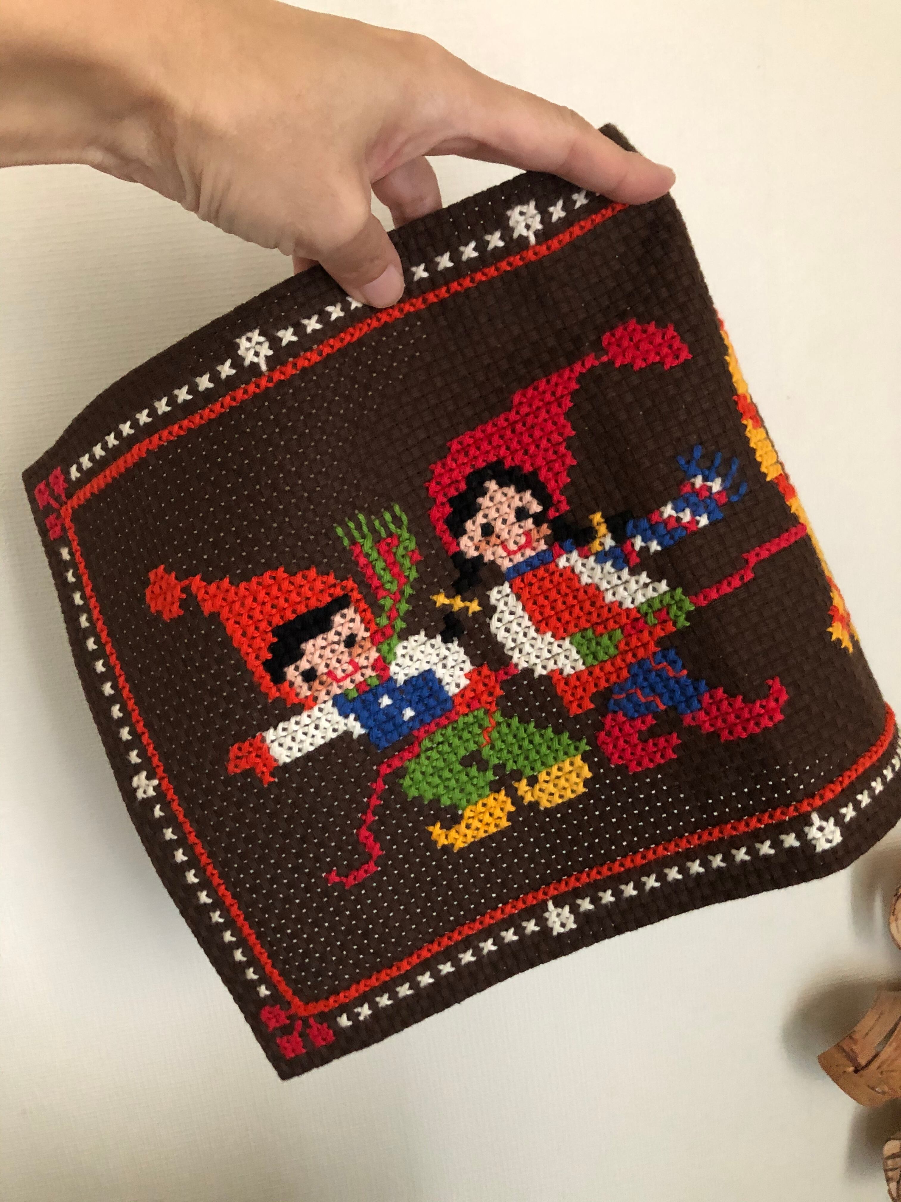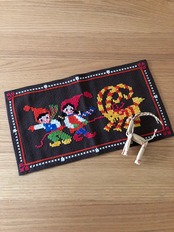 男の子と女の子の履いてるトンガリ靴や、帽子、マフラーなど細かい部分を見れば見るほど可愛らしい刺繍クロスです♫