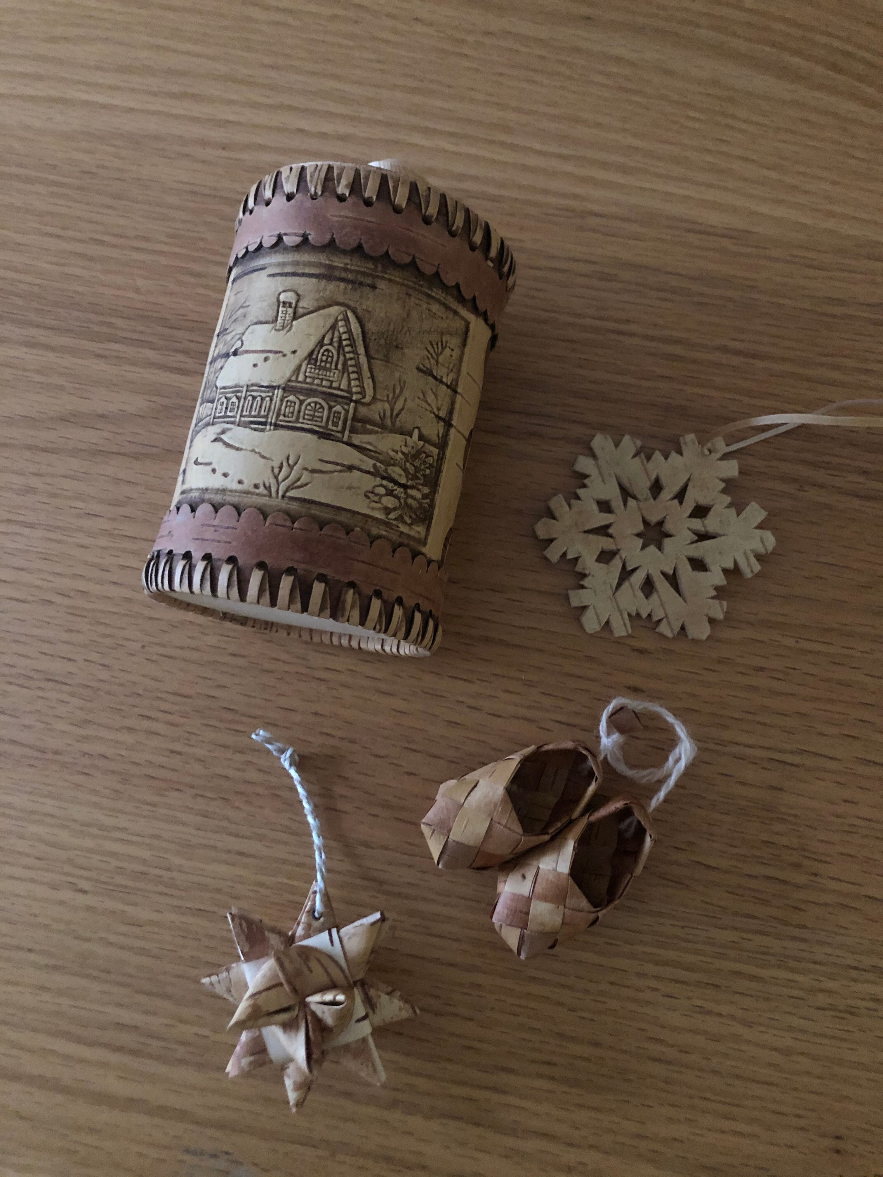 ロシア 白樺細工 ベレスタ 筒型 おうちと雪景色の型押しキャニスター