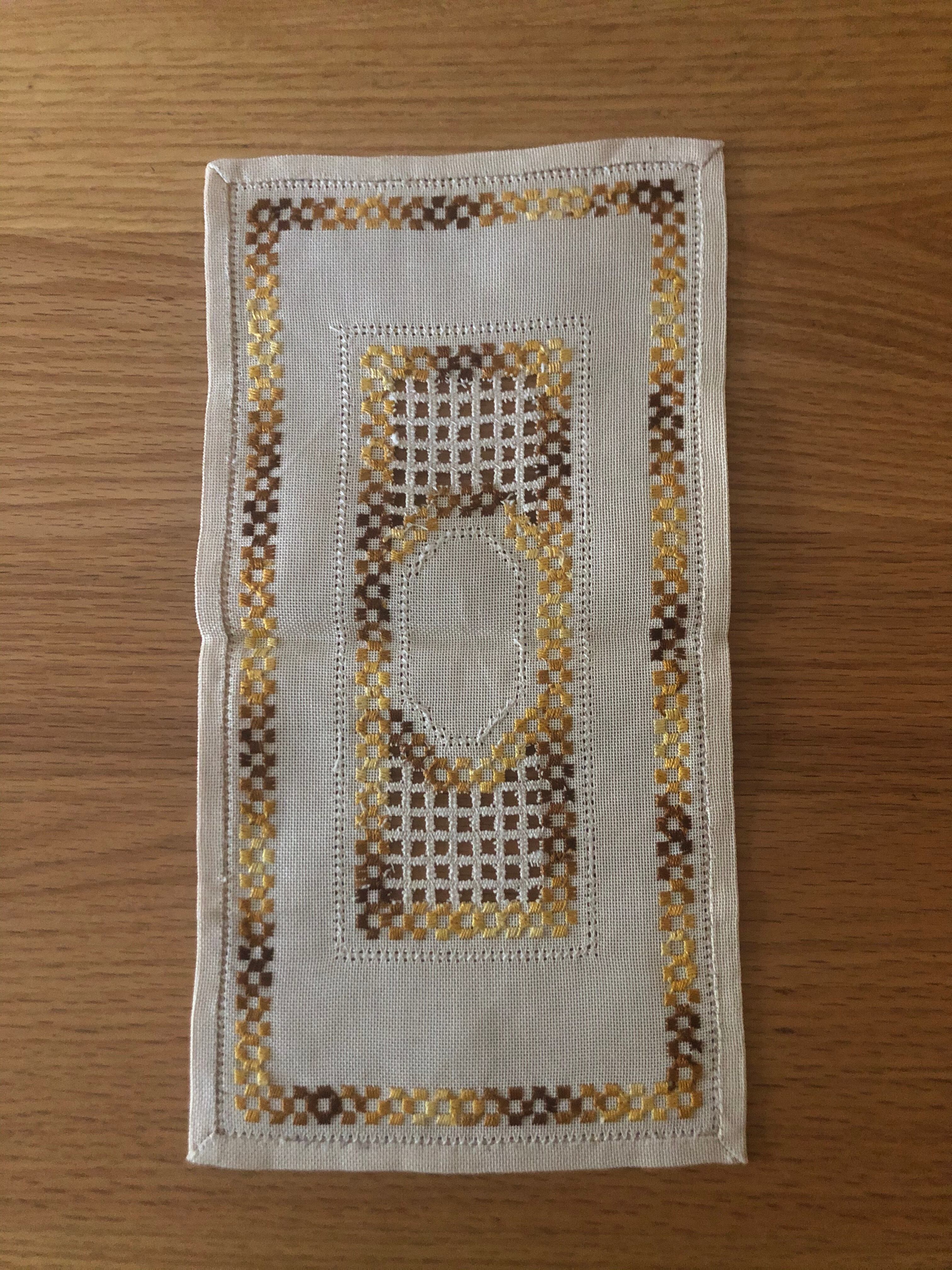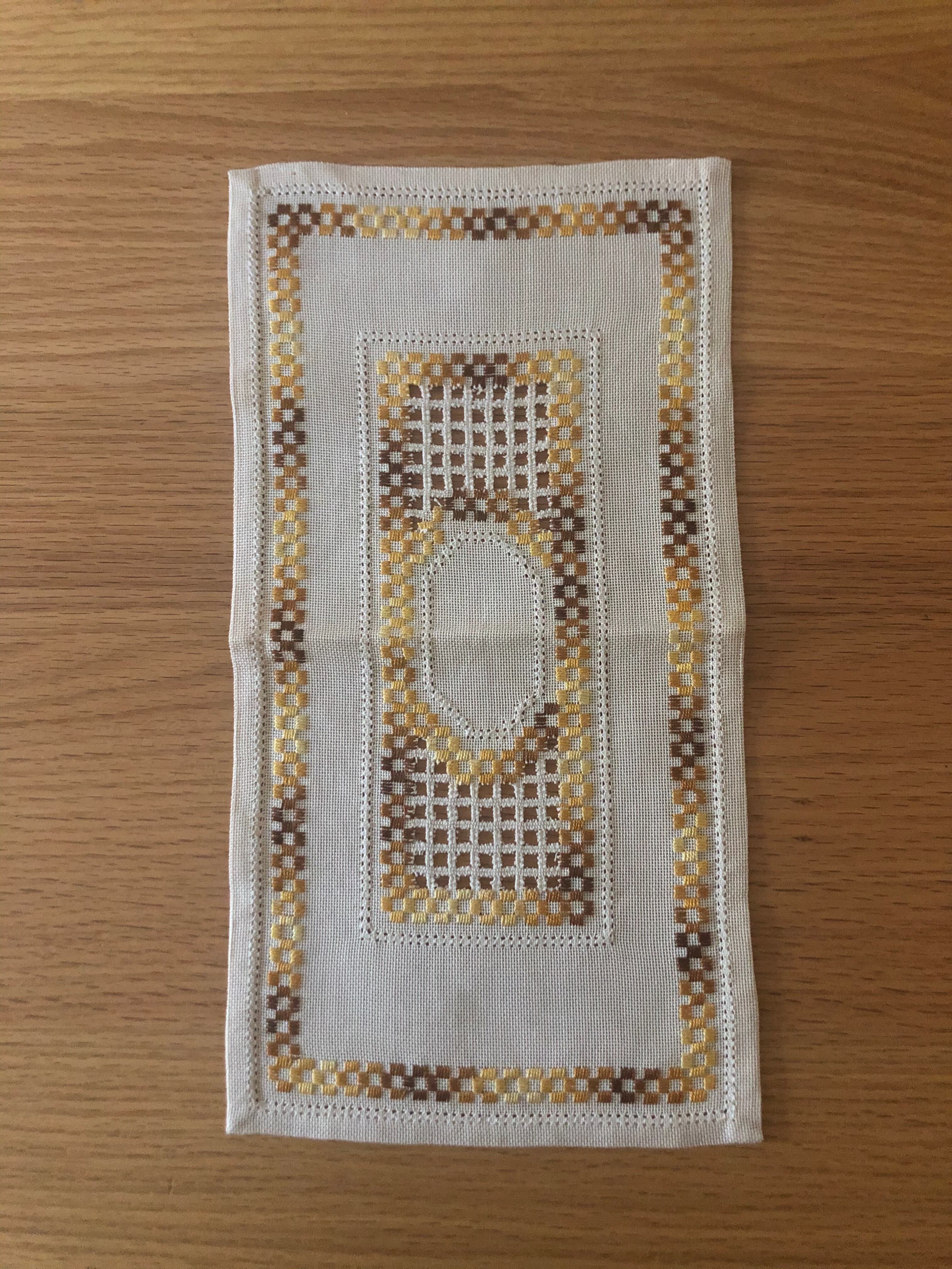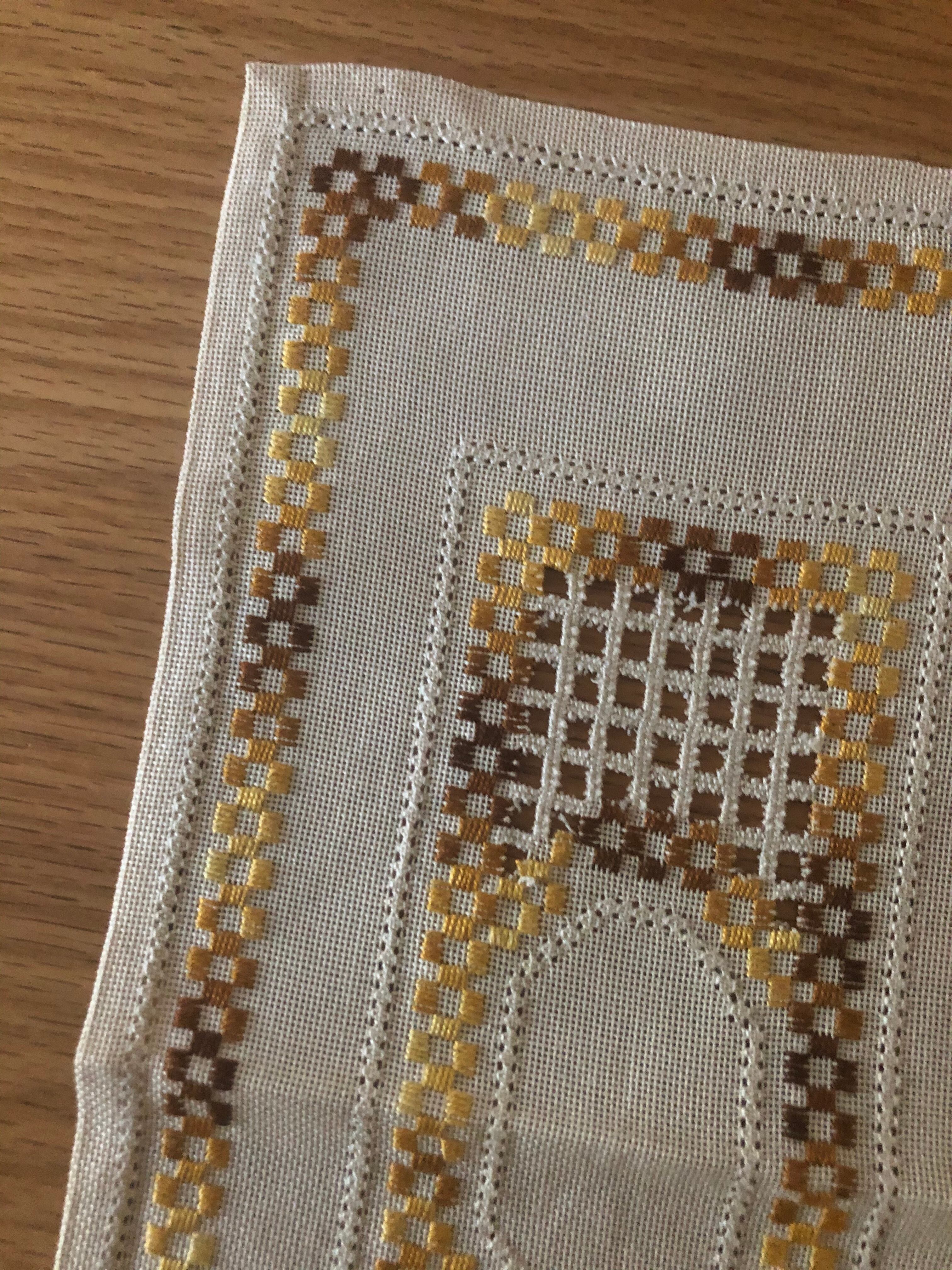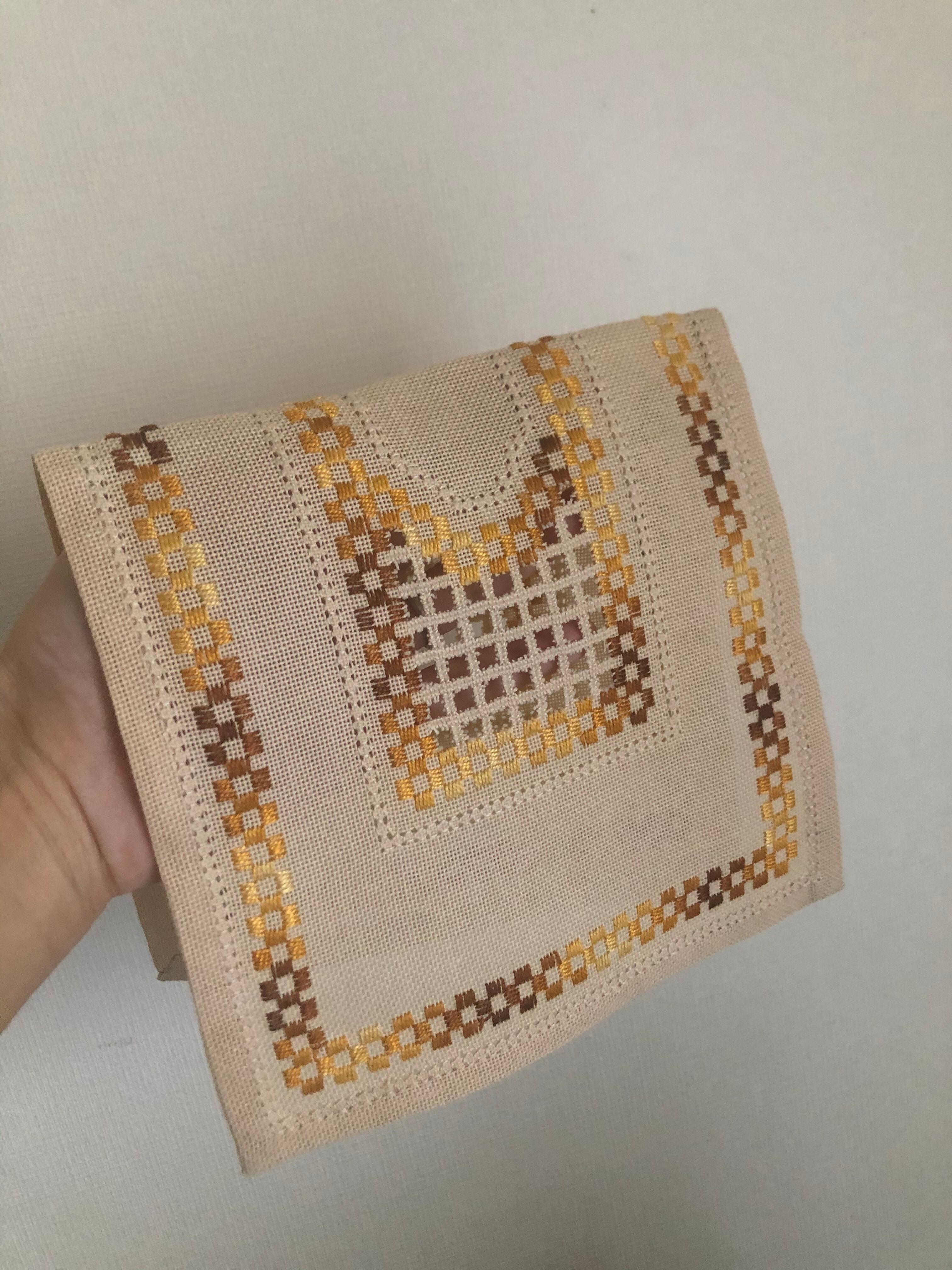 ベージュの張りのあるリネン生地をベースに、ブラウン、イエローの刺繍が落ち着いていて、素敵なクロスです。