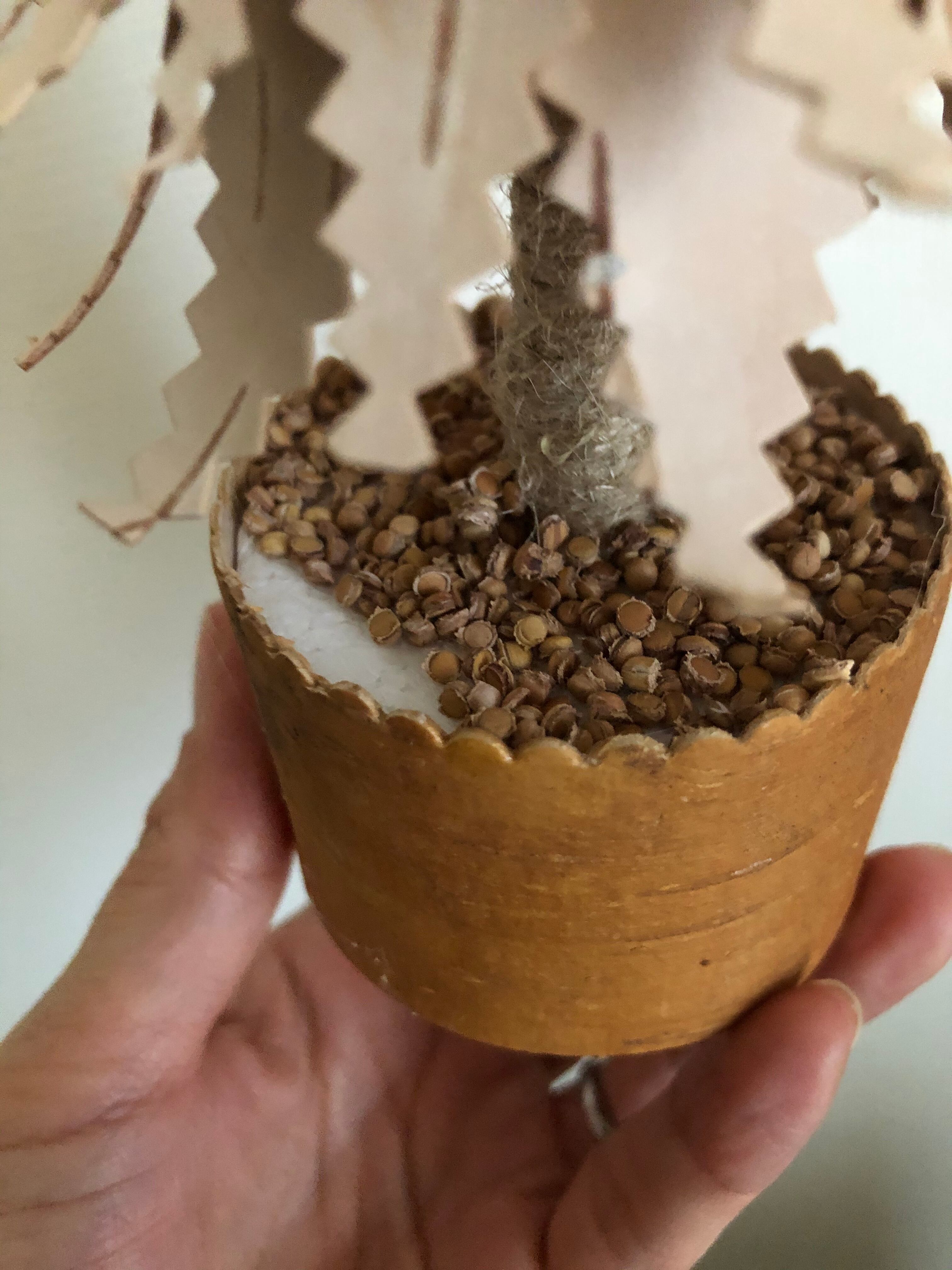 白樺の樹皮を重ねて作れられたとても凝った、白樺のツリー。木の幹は麻紐でしっかり巻かれており、鉢に入ったツリーと星がとても可愛らしいツリーのオブジェです。