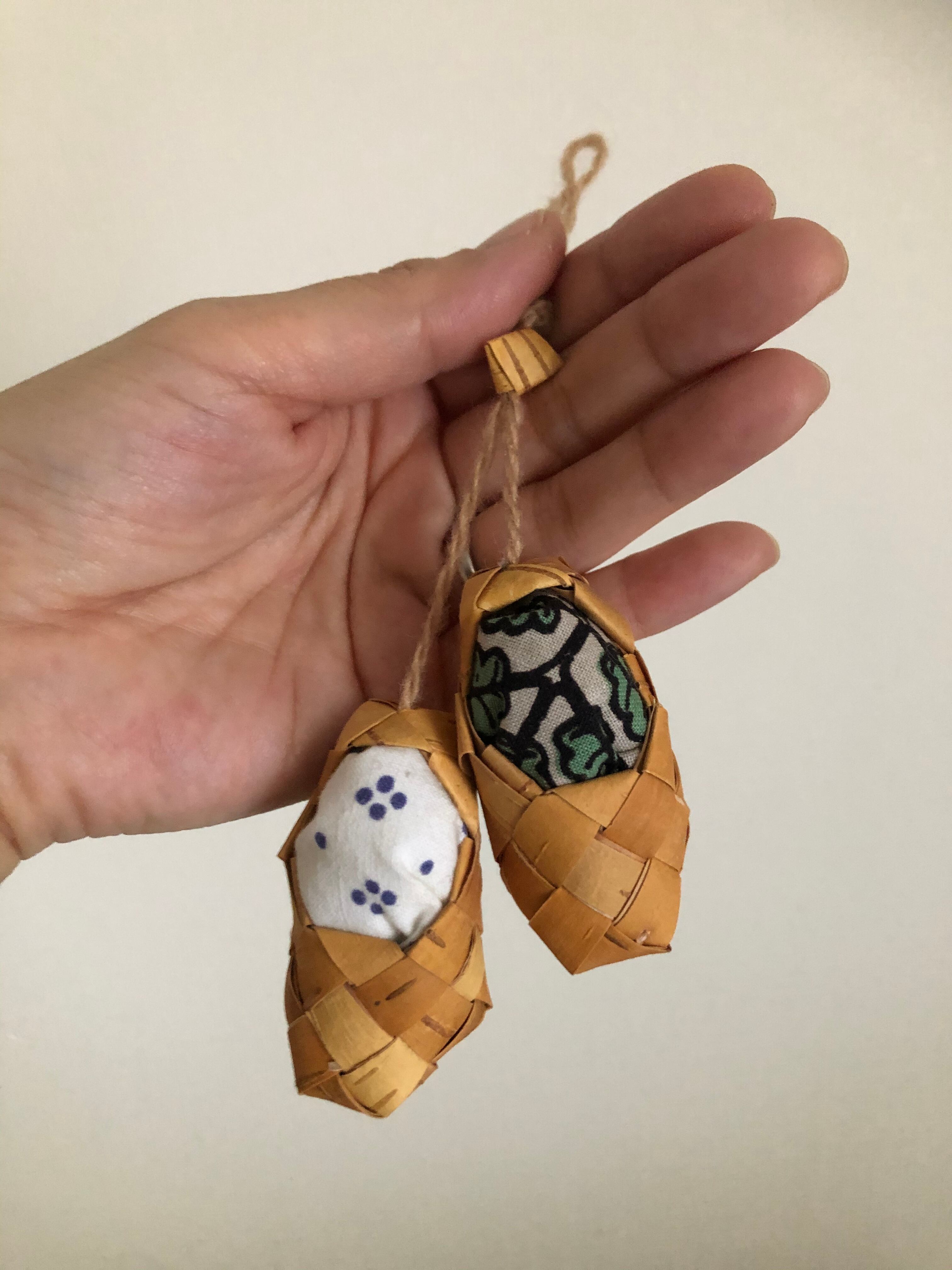 ロシアの白樺細工の職人さんが作った白樺の靴のオーナメントに、ヴィンテージのマリメッコのハギレ生地を合わせたオーナメント♫(キルト芯をクシュっとしてハギレ生地で包んで入れています)特に縫ったりはしてないので、簡単に取り外し可能です。