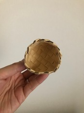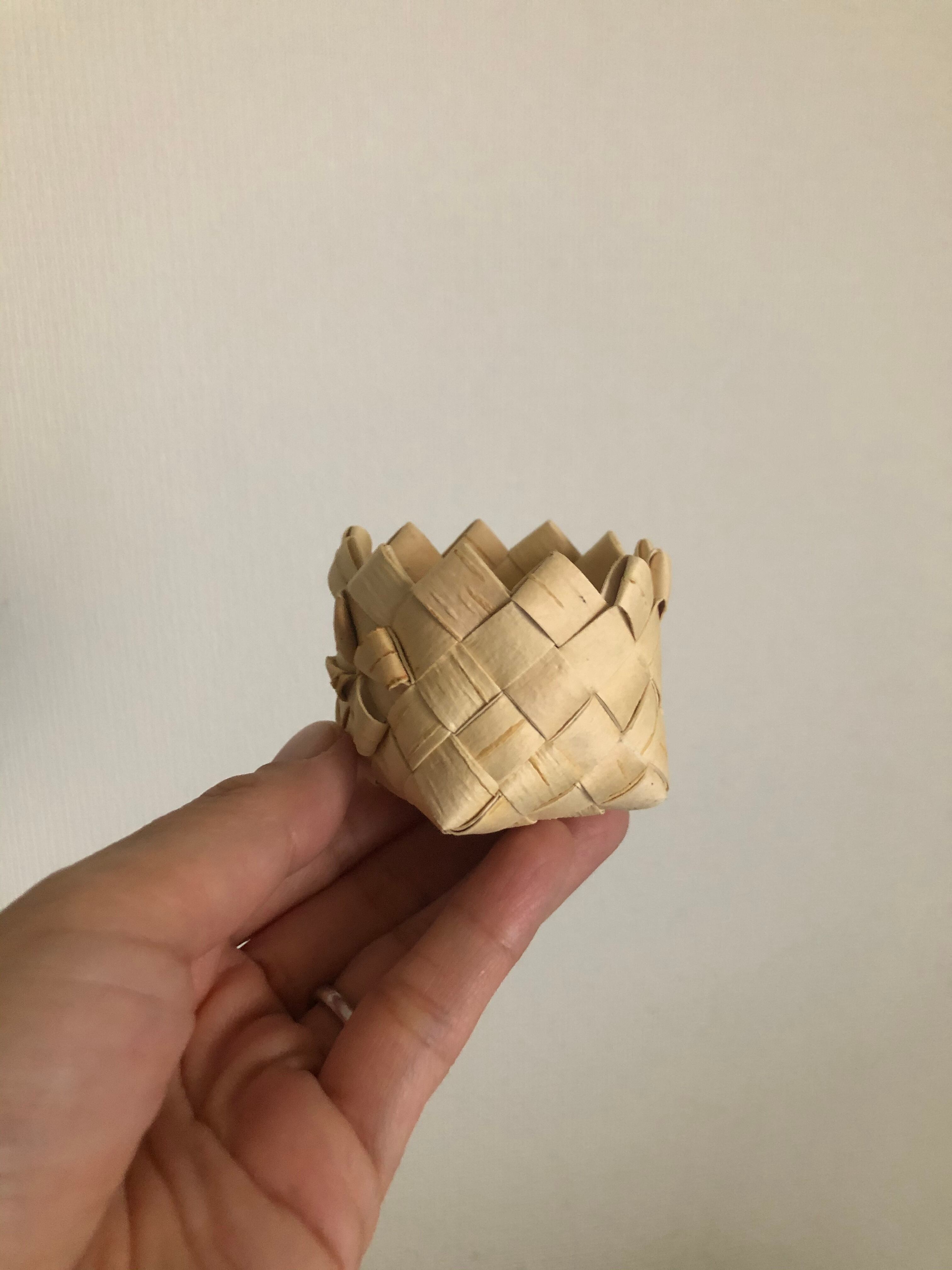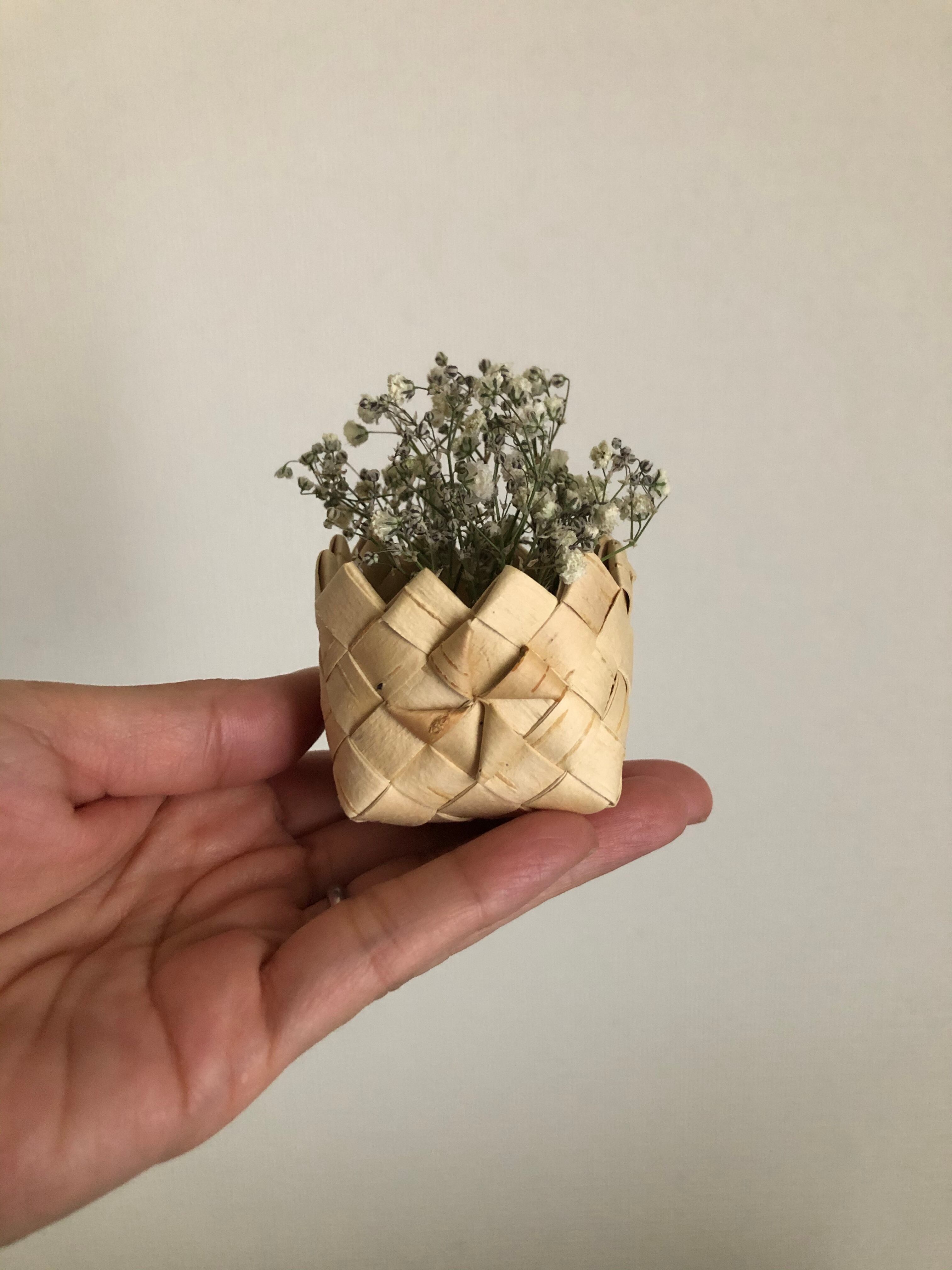 上のギザギザと、正面の細工、なにより手のひらに乗るミニチュアサイズが可愛らしい、白樺のバスケット♫