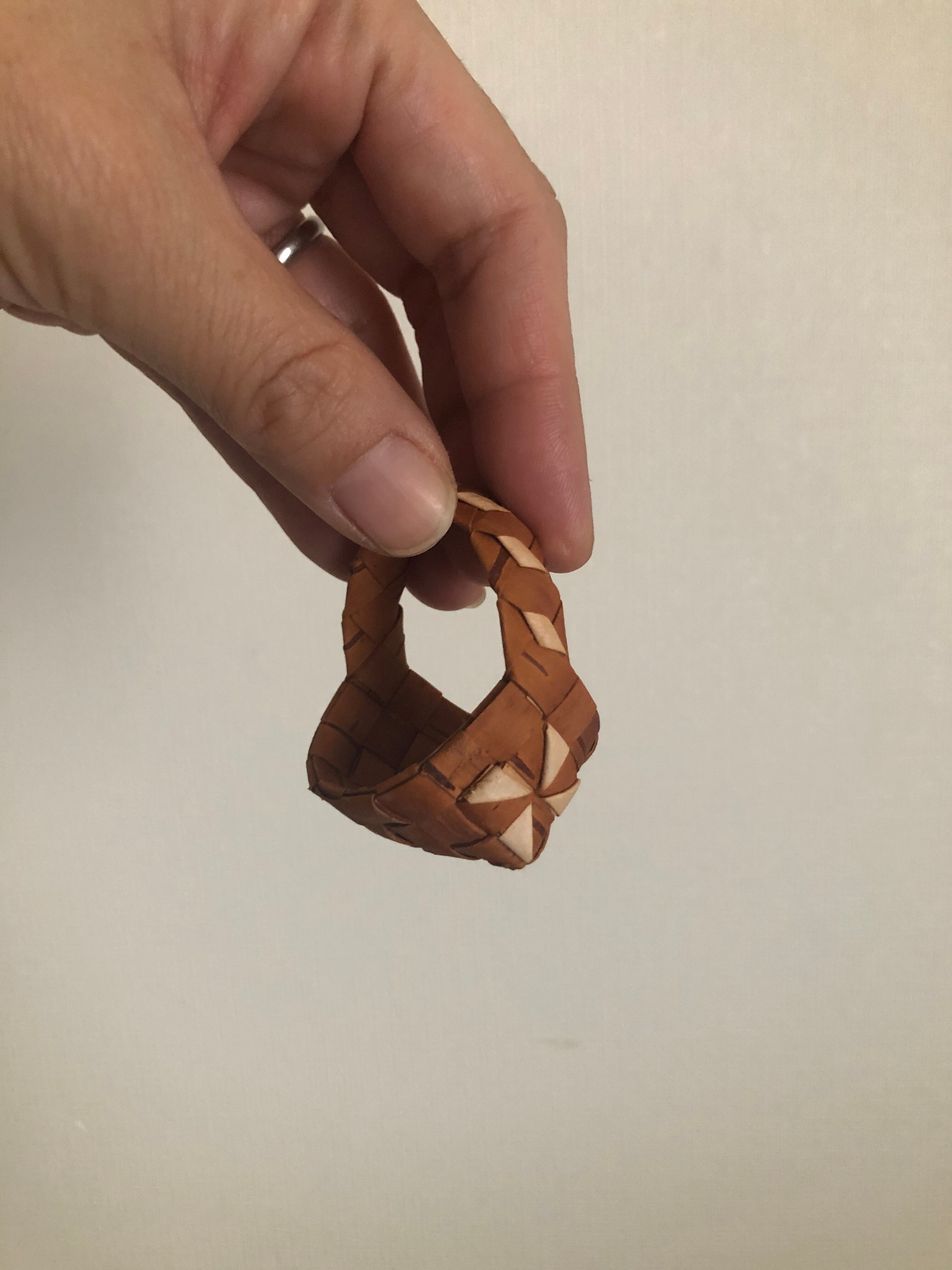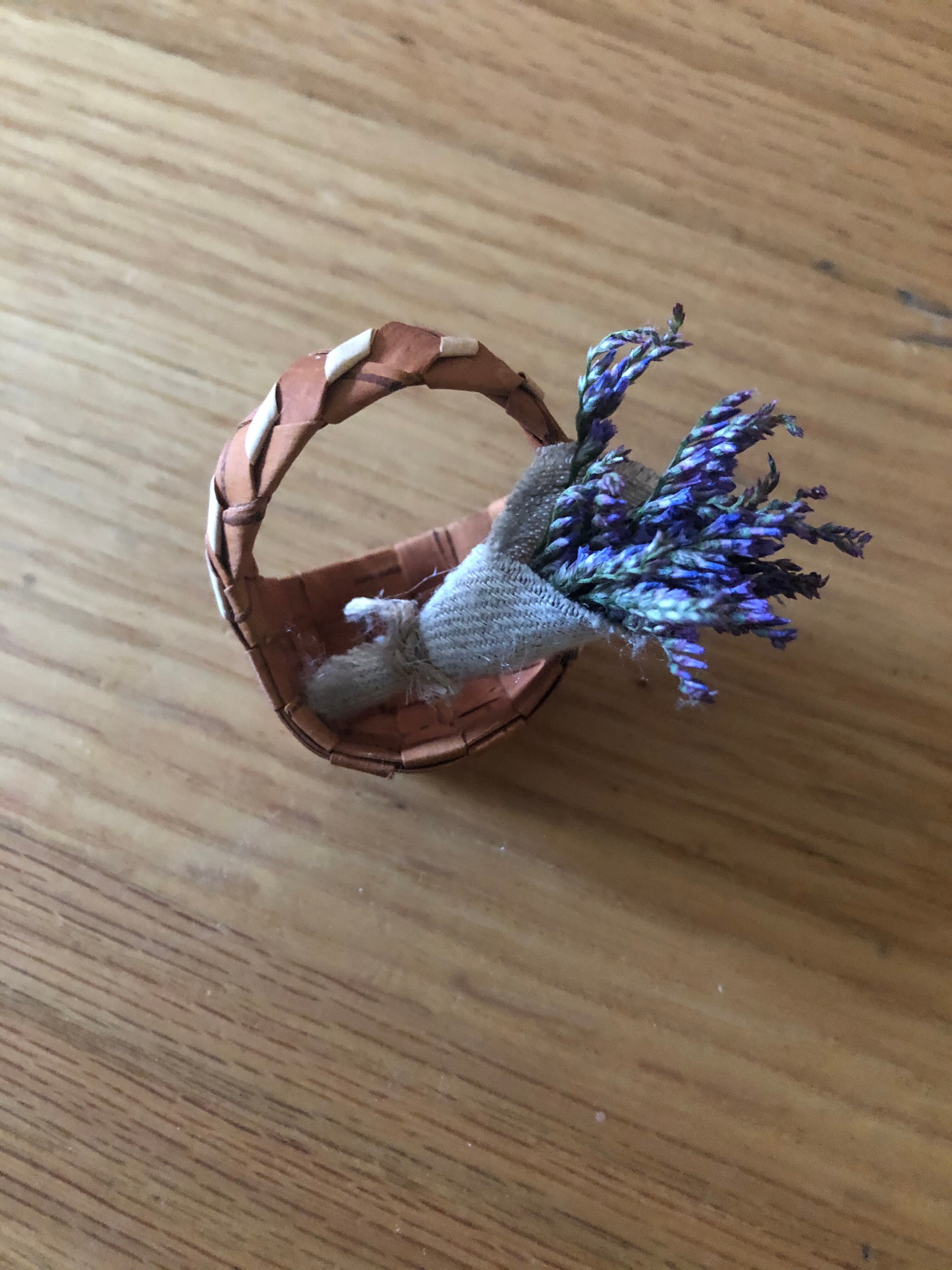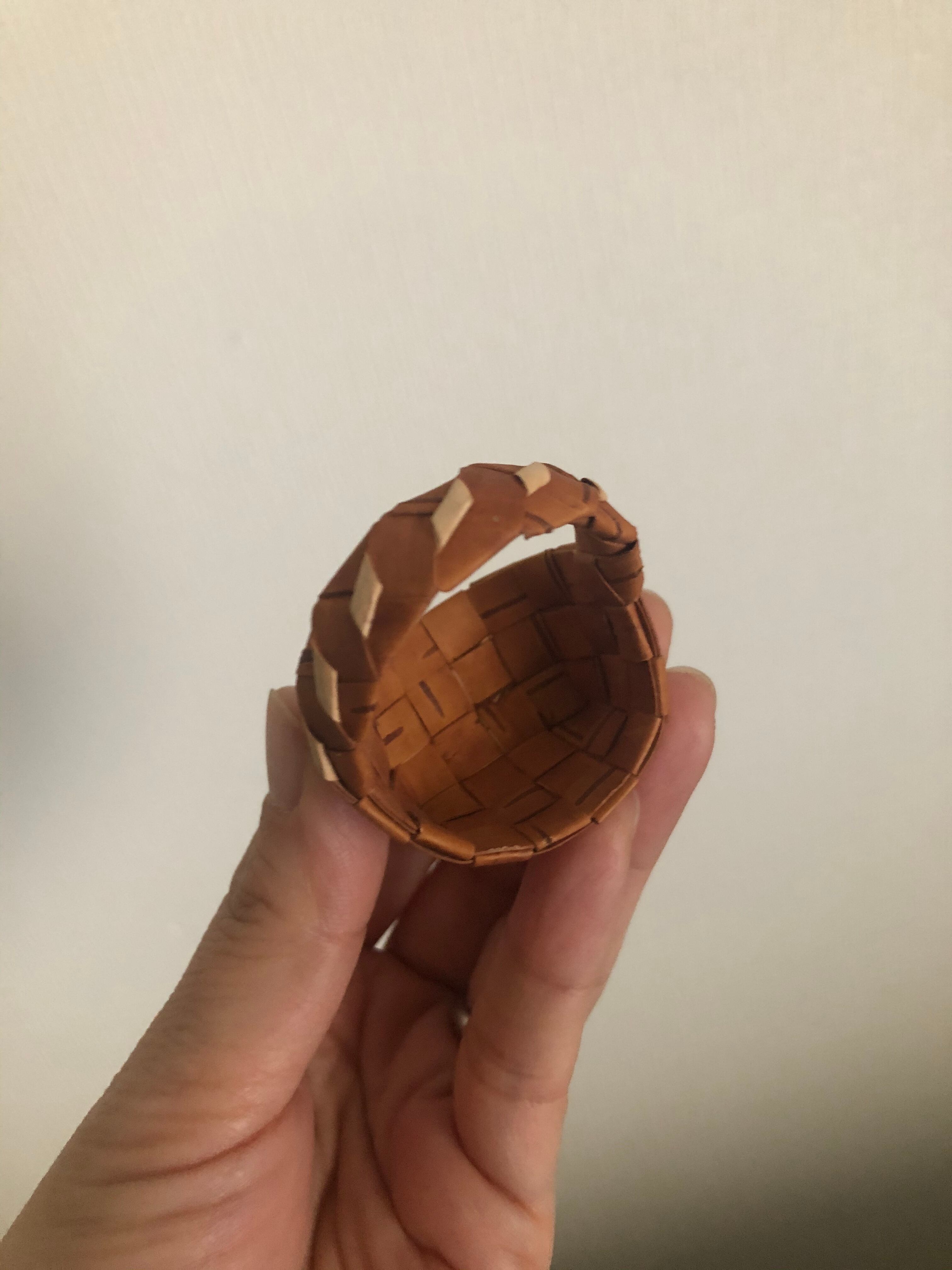固めの白樺の皮でしっかり編まれた手のひらに乗るミニチュアサイズが可愛らしい、開口部が大きめの白樺のフラワーバスケット♫