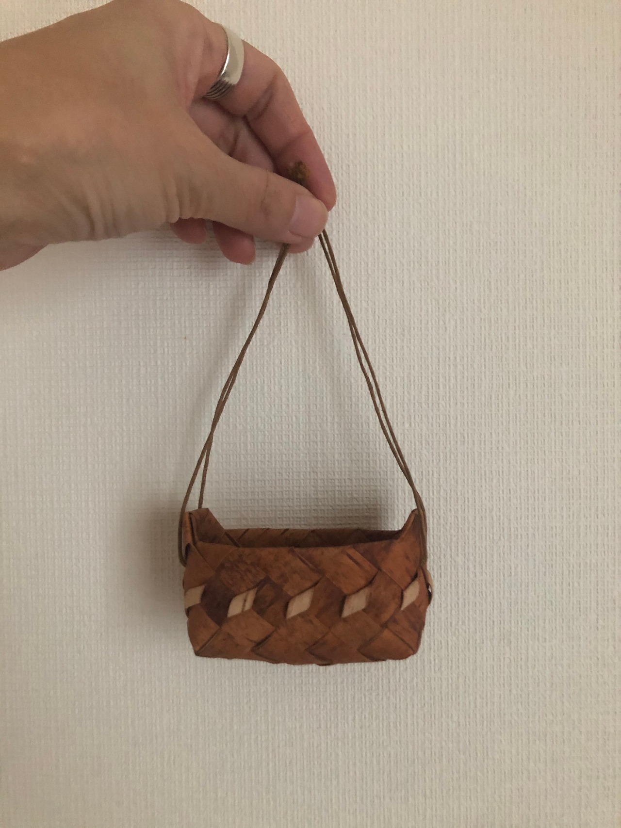横長の形と紐付きが珍しい小さめの白樺のバスケット♫