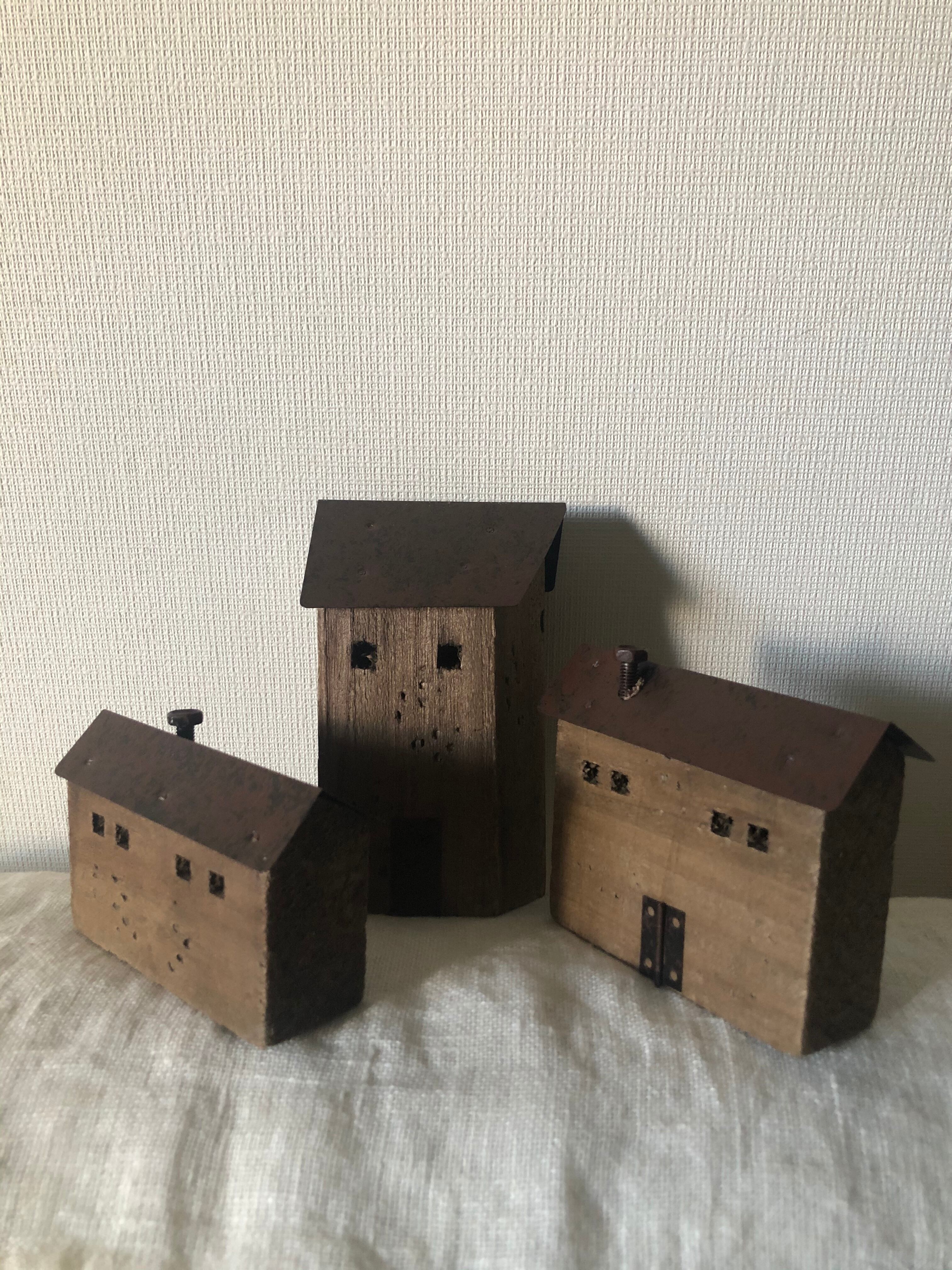 あえてヴィンテージ感を出した作りが、雰囲気があり、可愛らしい木のおうちの3点セットです。