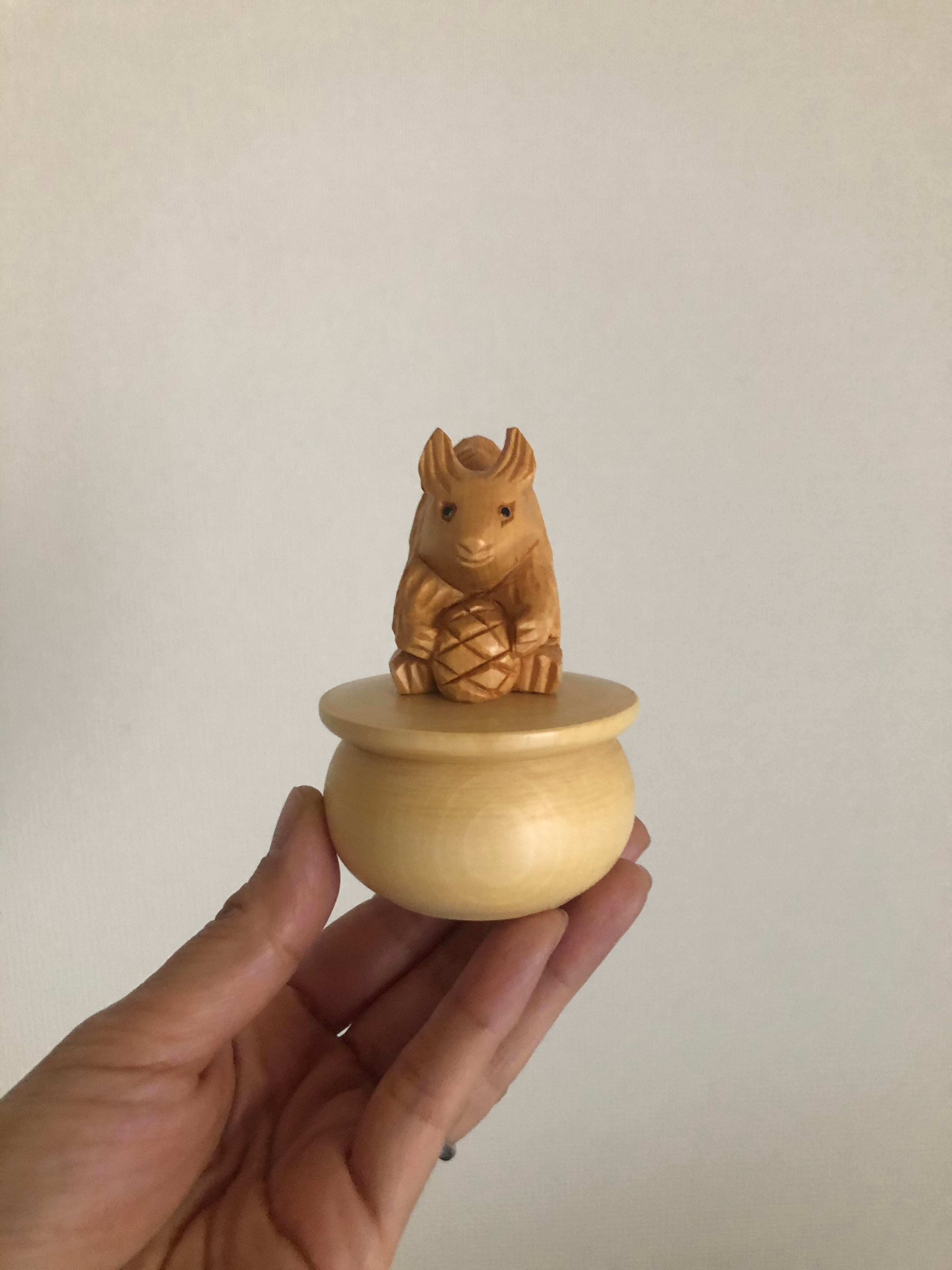 ロシアの木彫り作家さんが作った、シベリア杉の蓋付きの入れ物になります。