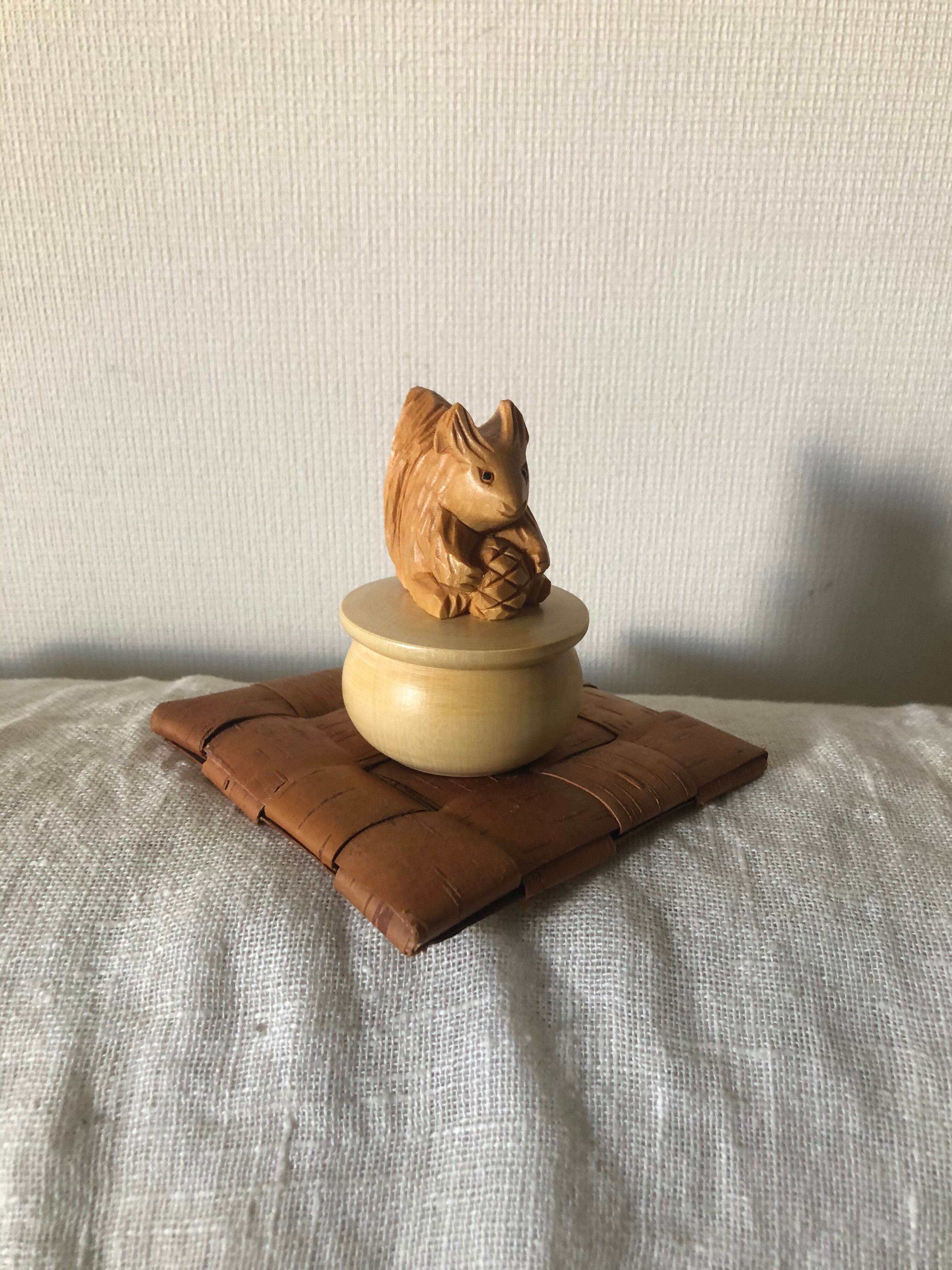 蓋にリスがちょこんと乗った丸い入れ物です。