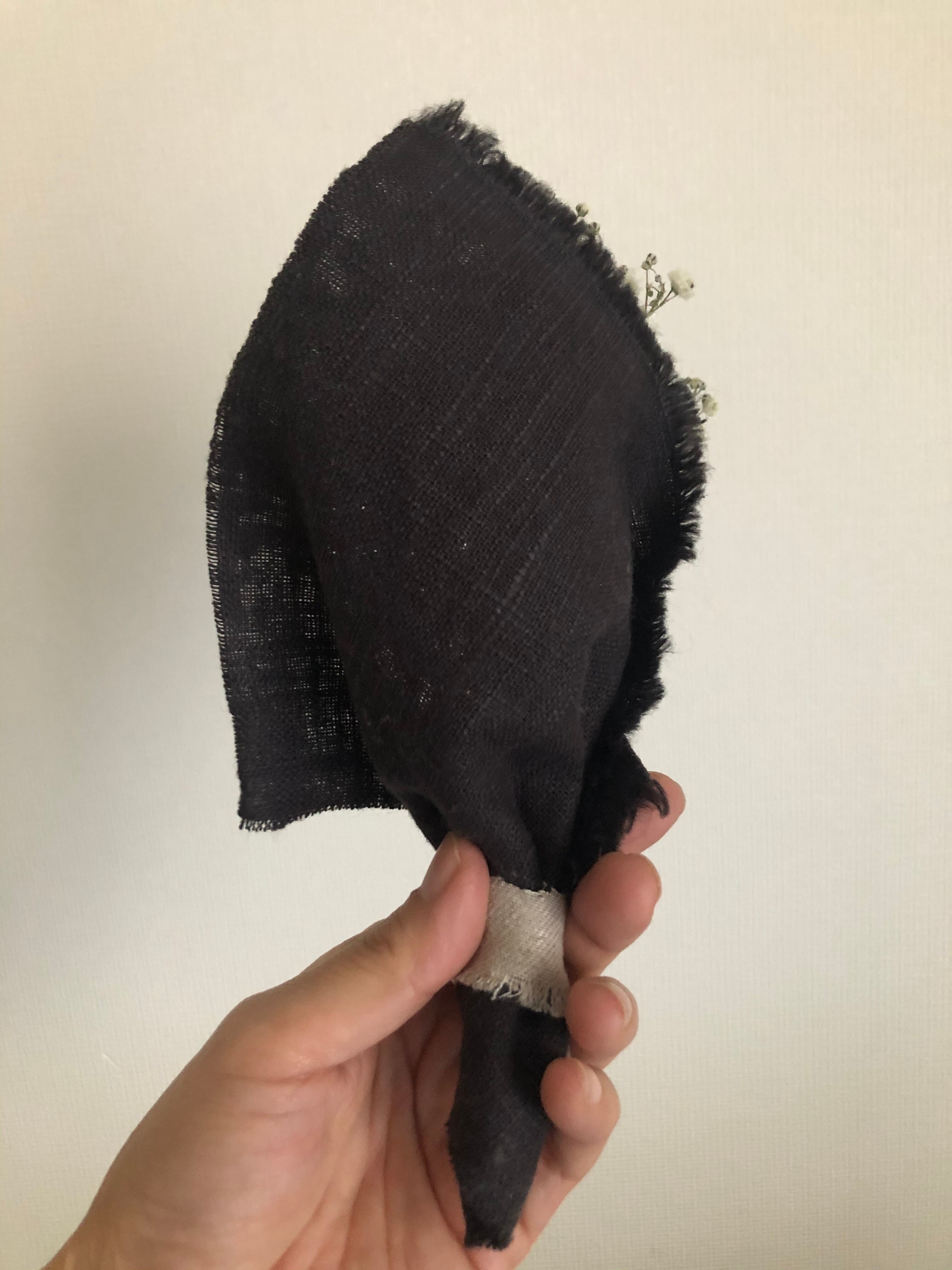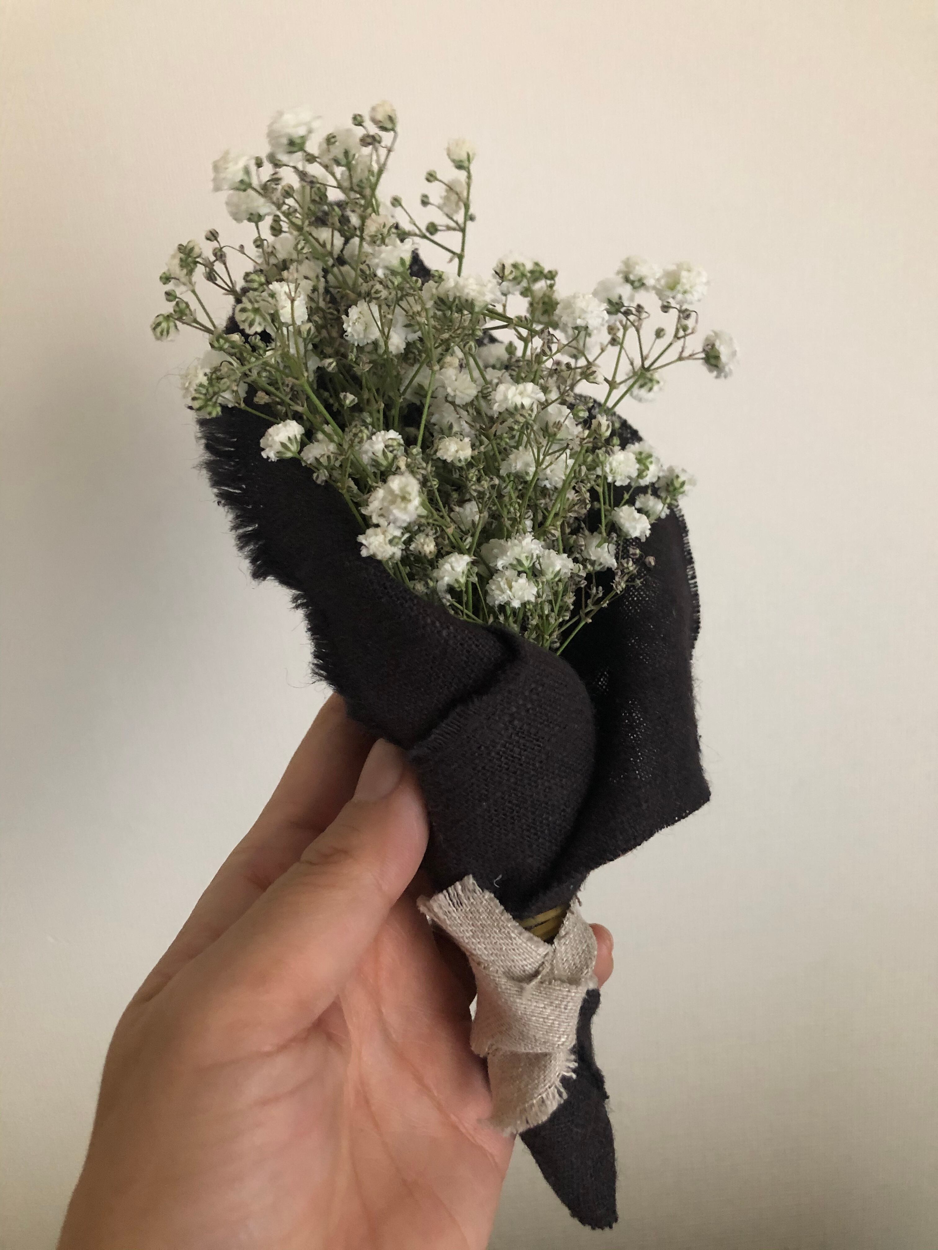 写真の、リネン生地で包まれたかすみ草のブーケかミニスワッグ一緒にお付けします(どちらがご希望か備考欄にお書き下さい)。