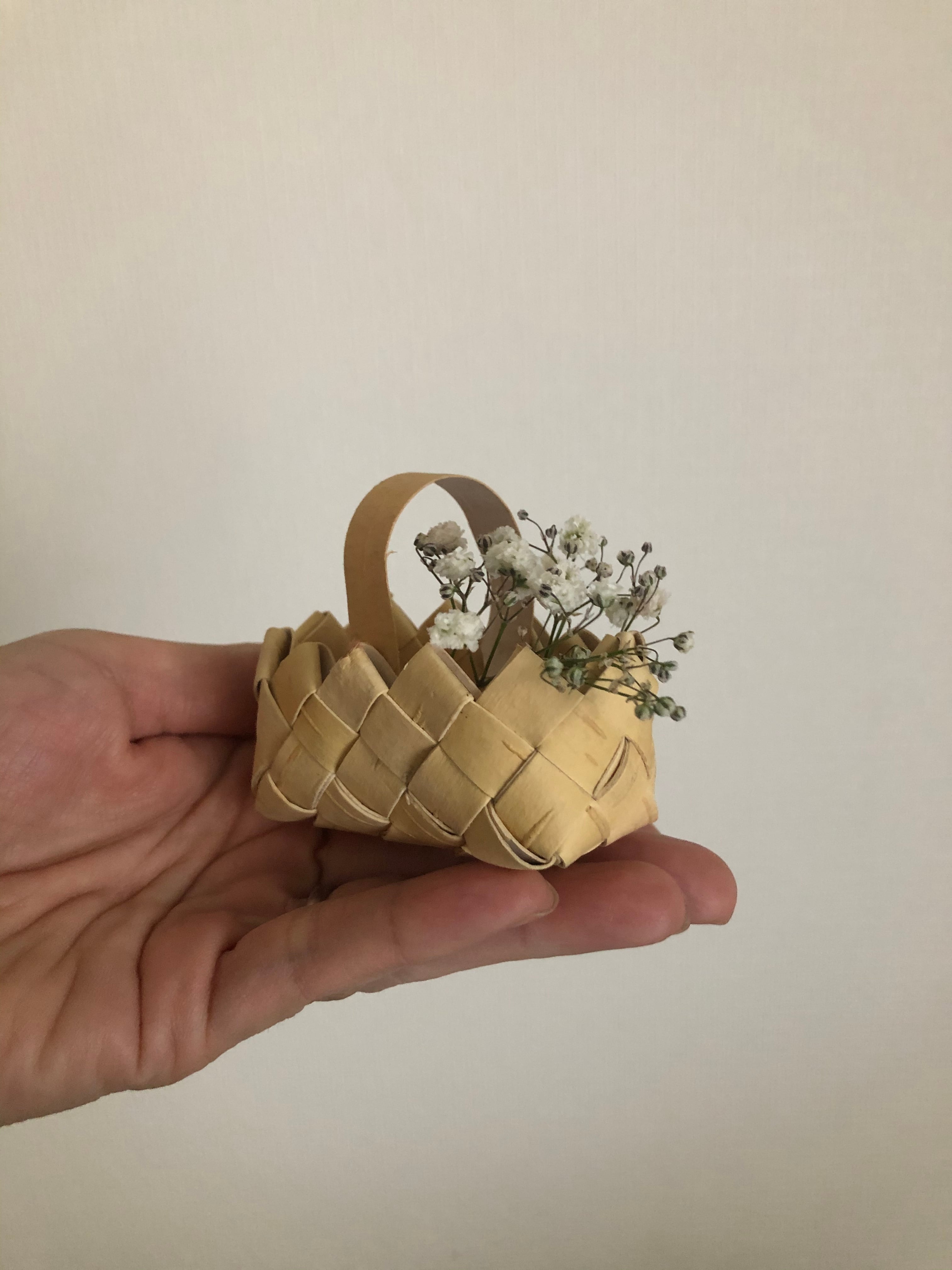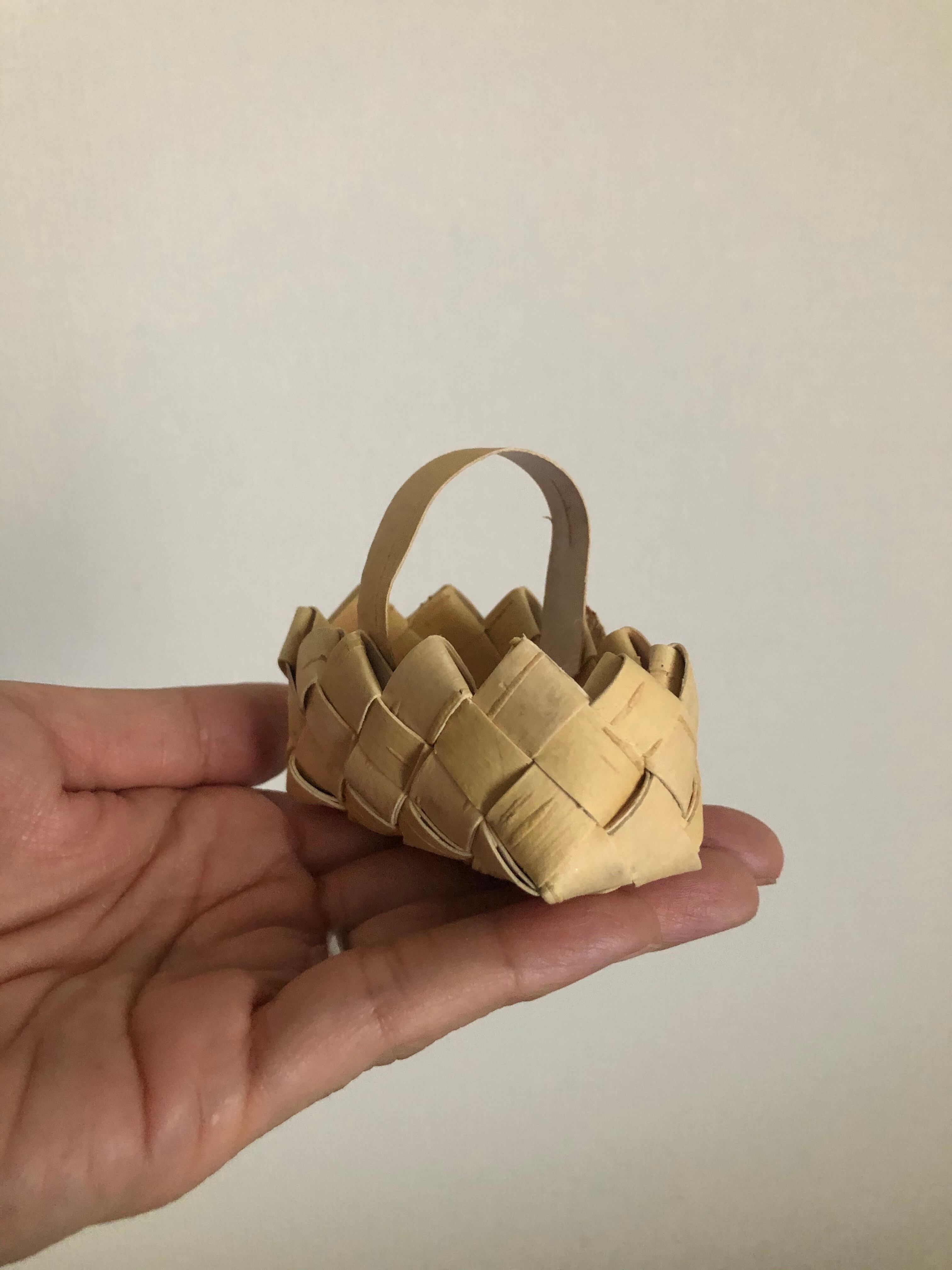 上のギザギザと、手のひらに乗るミニチュアサイズがとても可愛らしい、ナチュラルな白樺のバスケット♫
