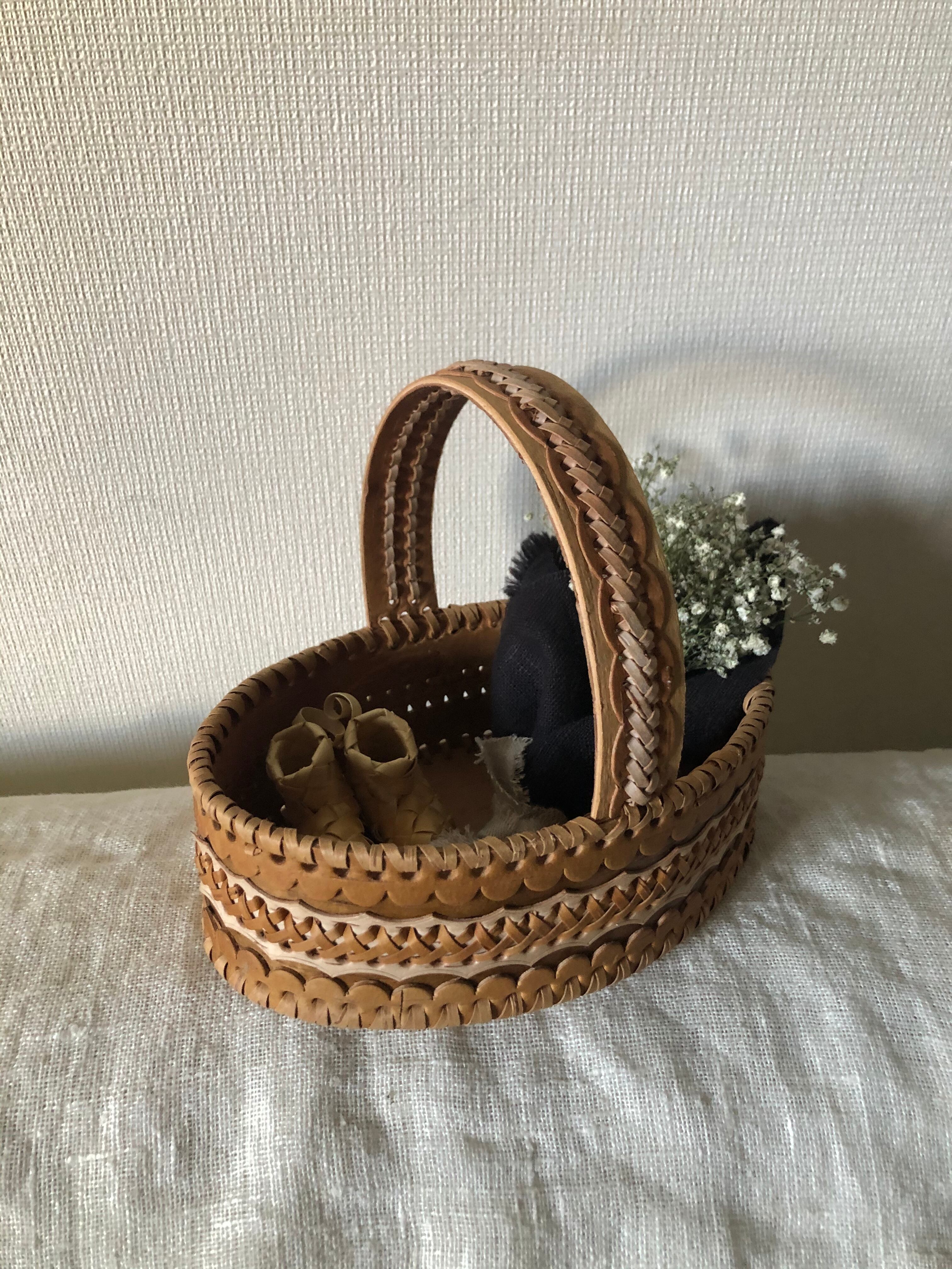 ロシア 白樺細工 ベレスタ 持ち手付きバスケット 楕円 ♫生地に包まれたかすみ草のブーケorミニスワッグ 付き♫