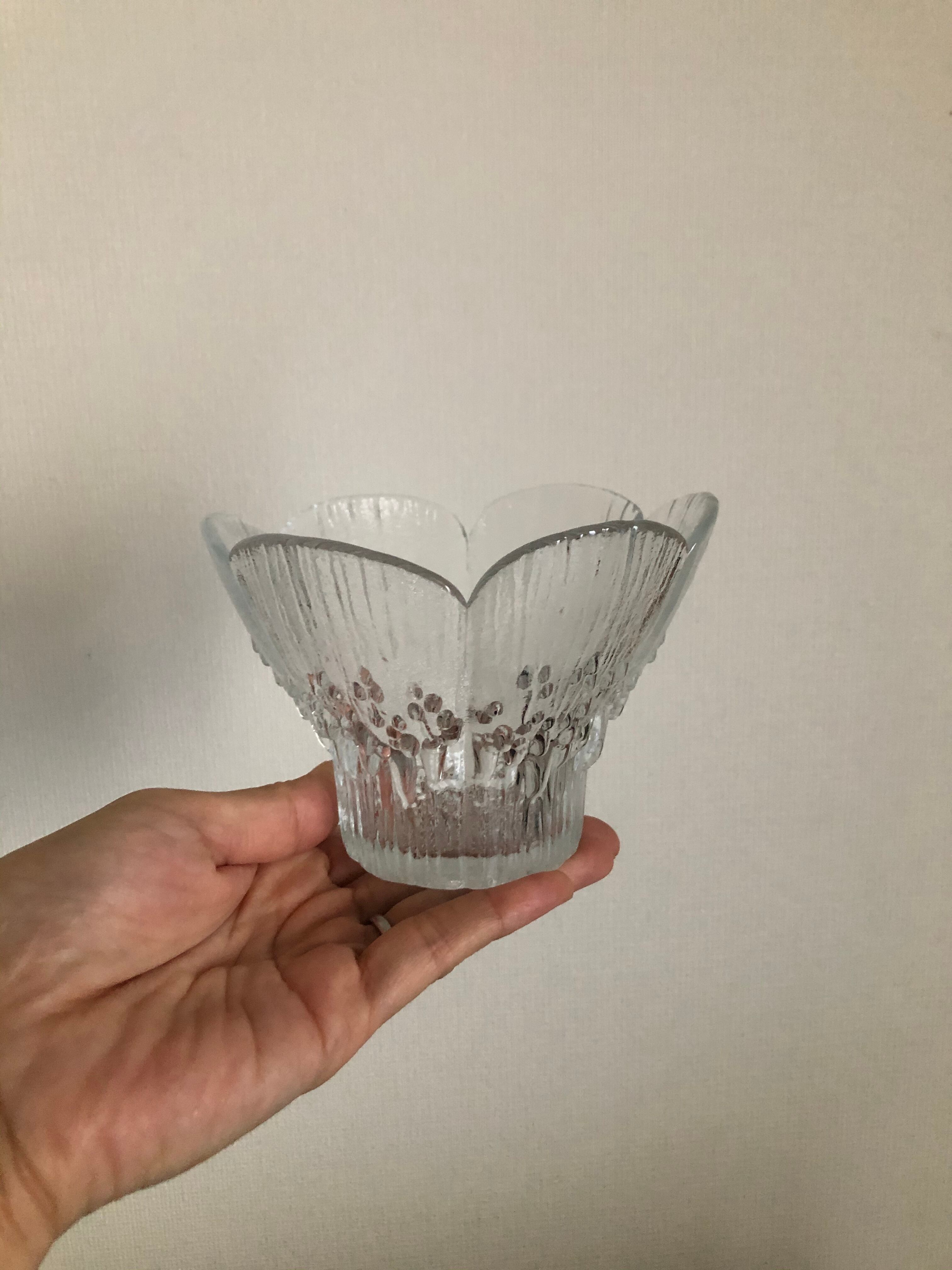 クリアなグラスに、フィンランド語でHeina(干し草)の柄がシンプルでシックなキャンドルホルダー。