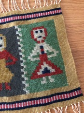 落ち着いたマスタード色をベースに薄いグリーン、グレー、赤の色味と、上下のフリンジがポイント♫