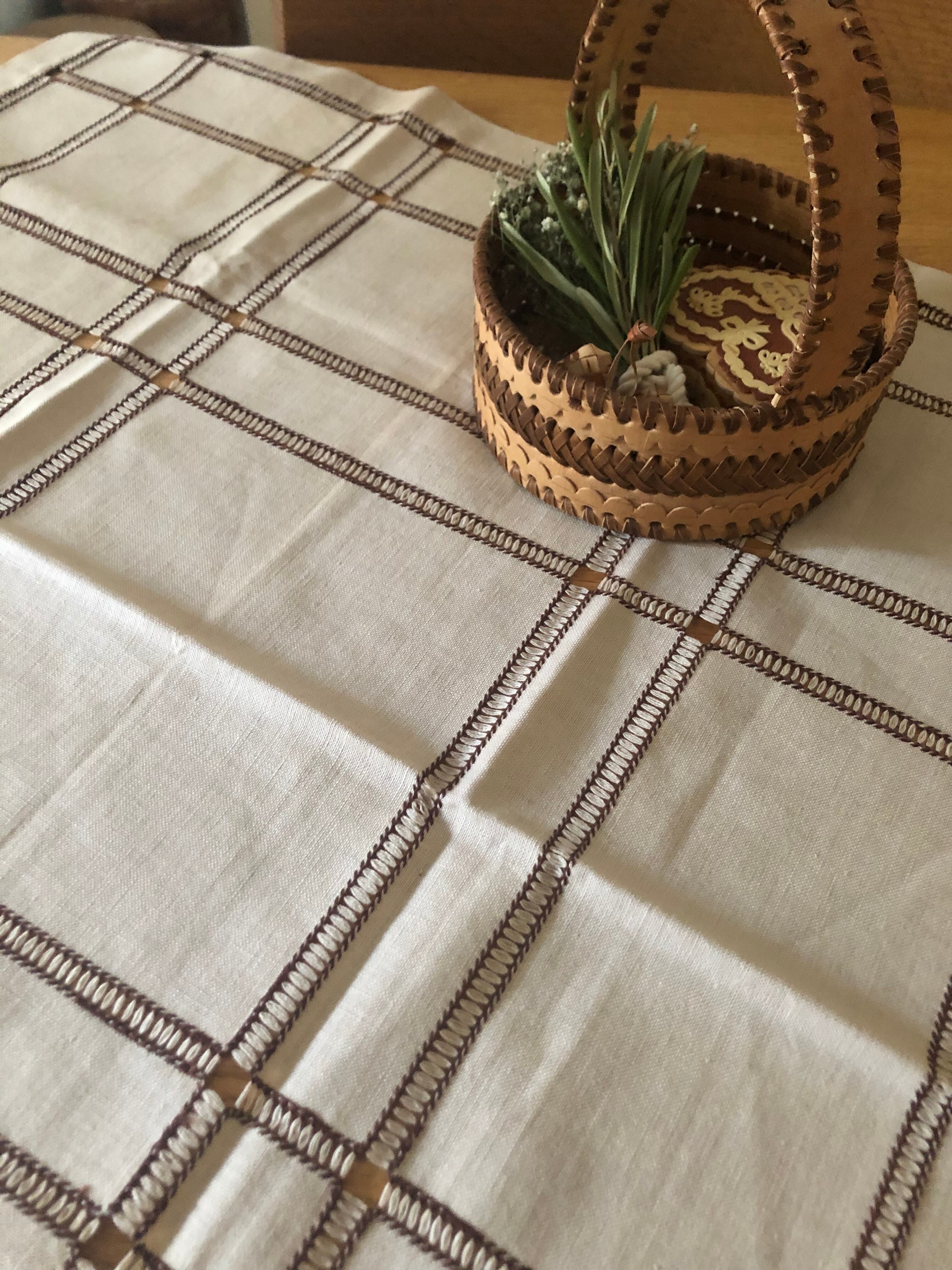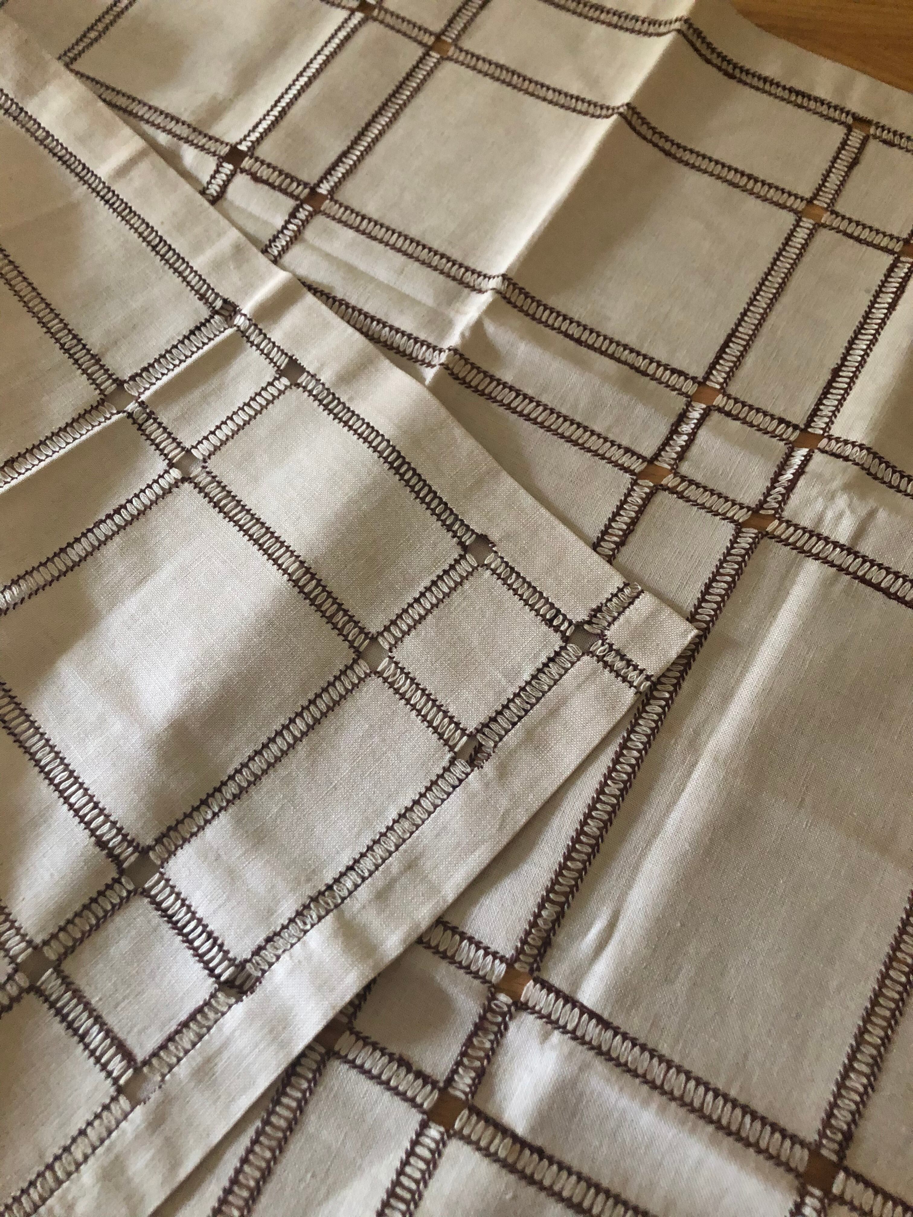 ベージュのリネン生地をベースに、全体に施された繊細なドロンワーク刺繍とブラウンのステッチがとても凝っていて、素敵なリネンクロスになります♫