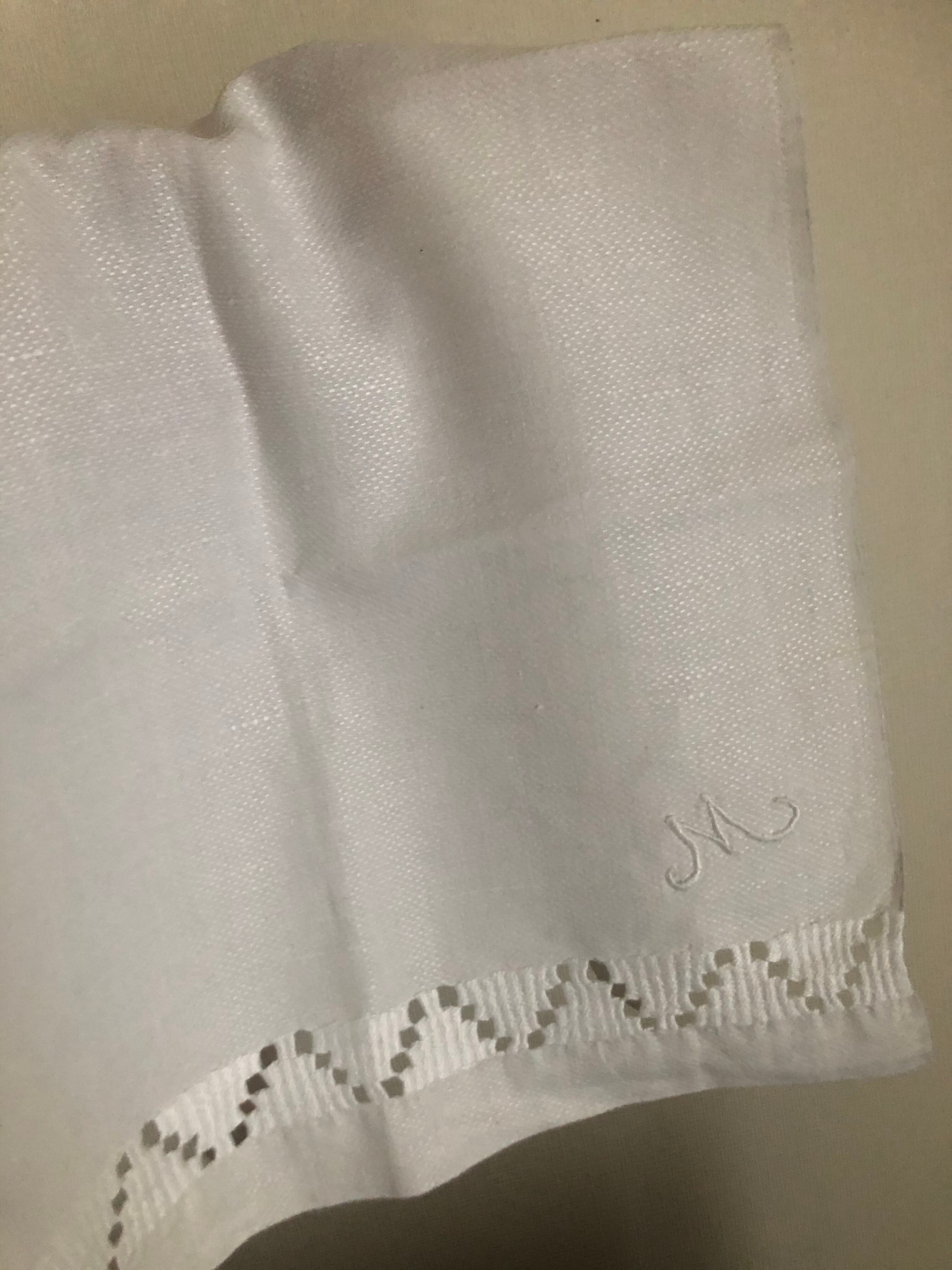 上質な白のリネン生地に、モノグラム刺繍とドロンワーク刺繍が凝っていて素敵な一枚♫