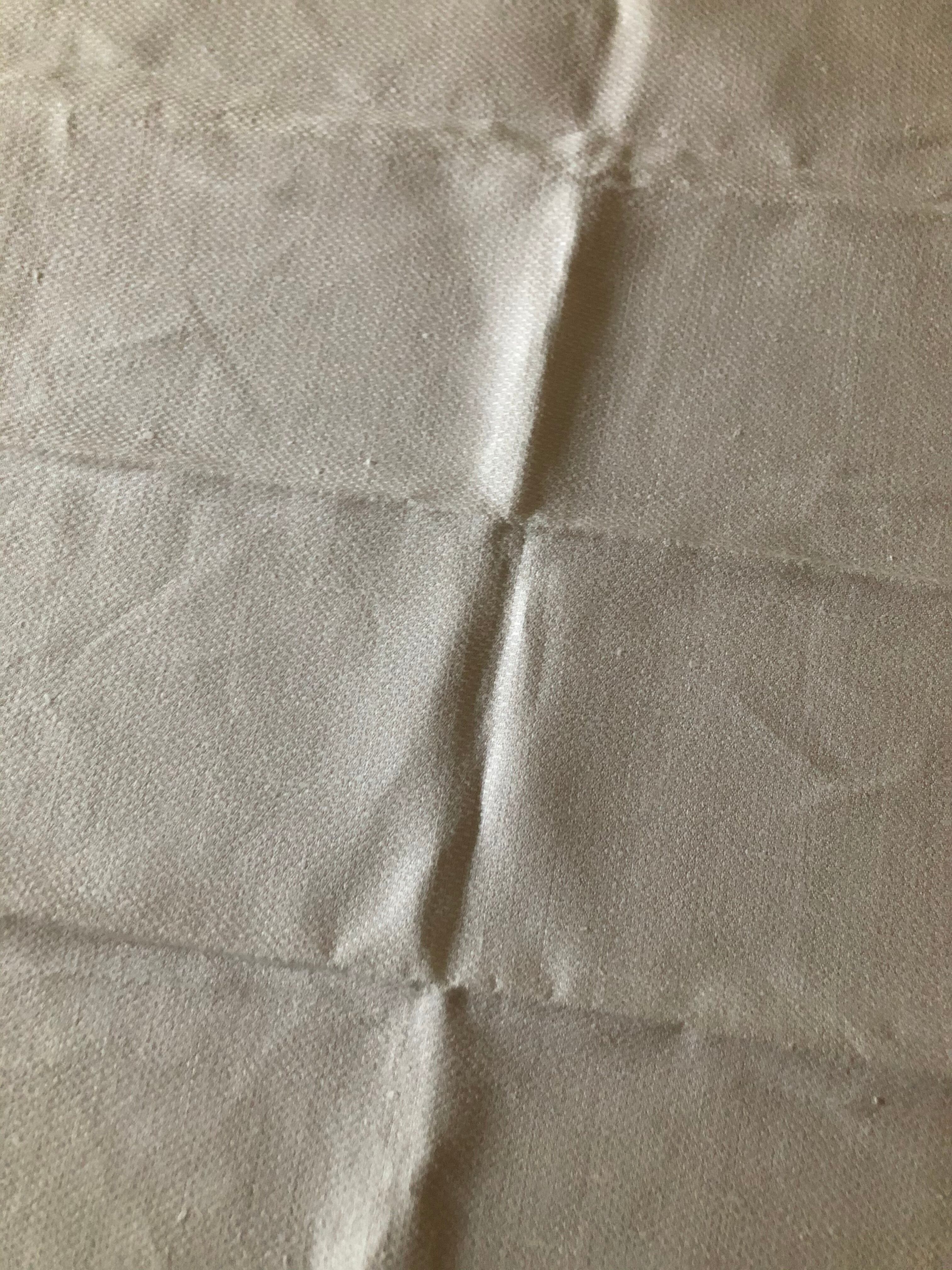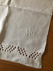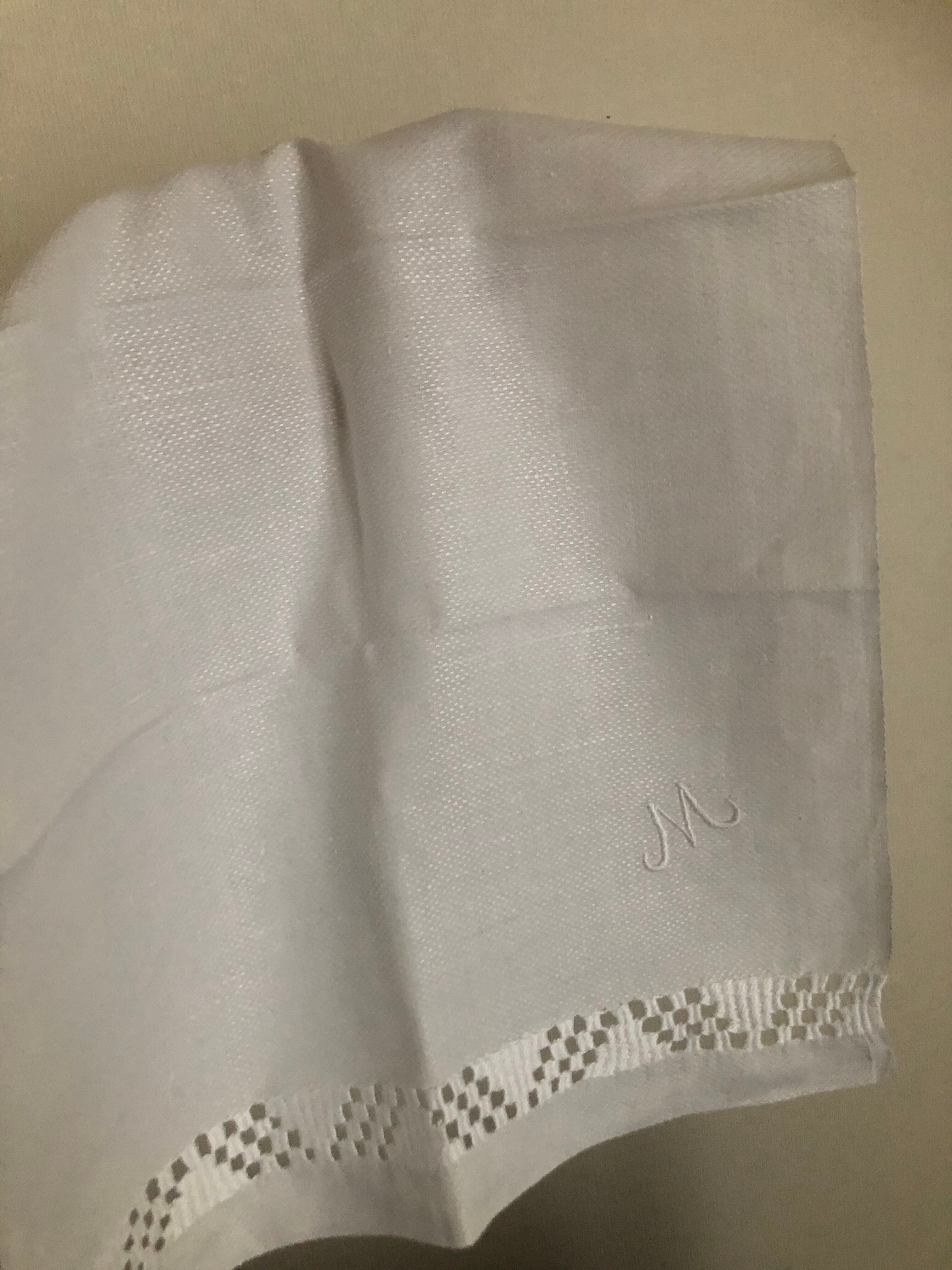 上質な白のリネン生地に、モノグラム刺繍とドロンワーク刺繍が凝っていて素敵な一枚♫