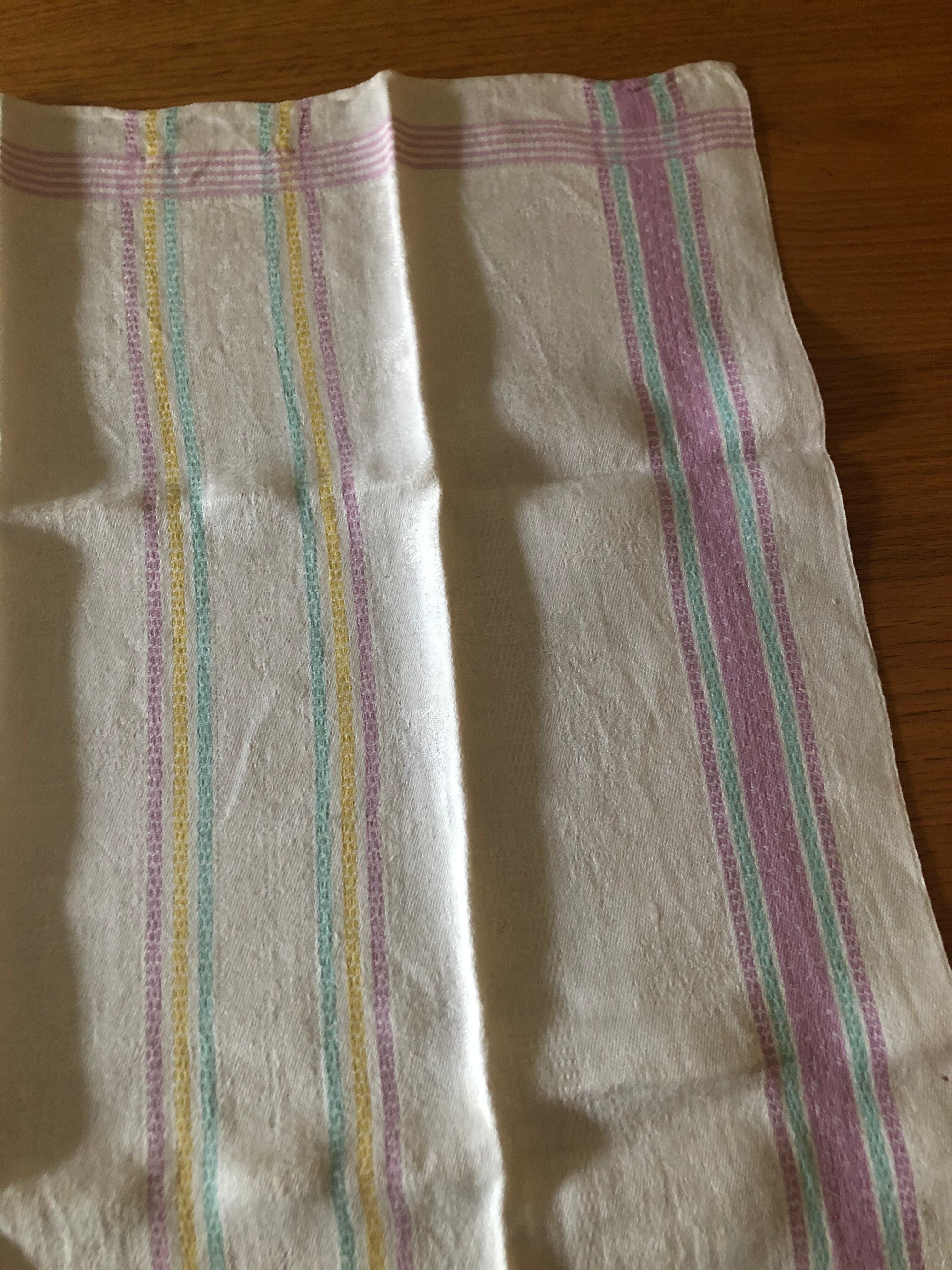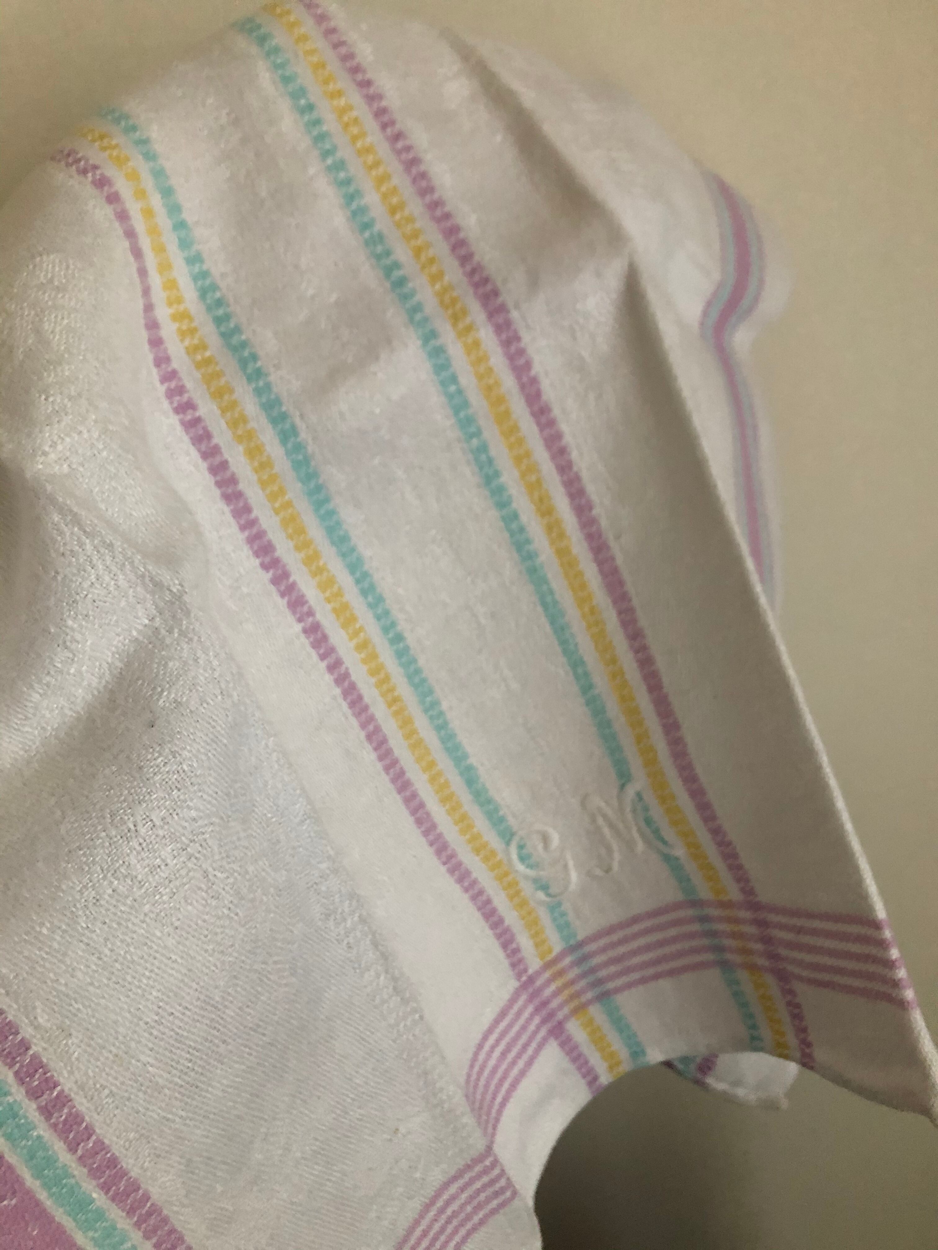 うっすらと浮き出るダマスク模様にパープル、グリーン、イエローのラインが入ったリネン生地に、モノグラム刺繍が素敵な一枚♫