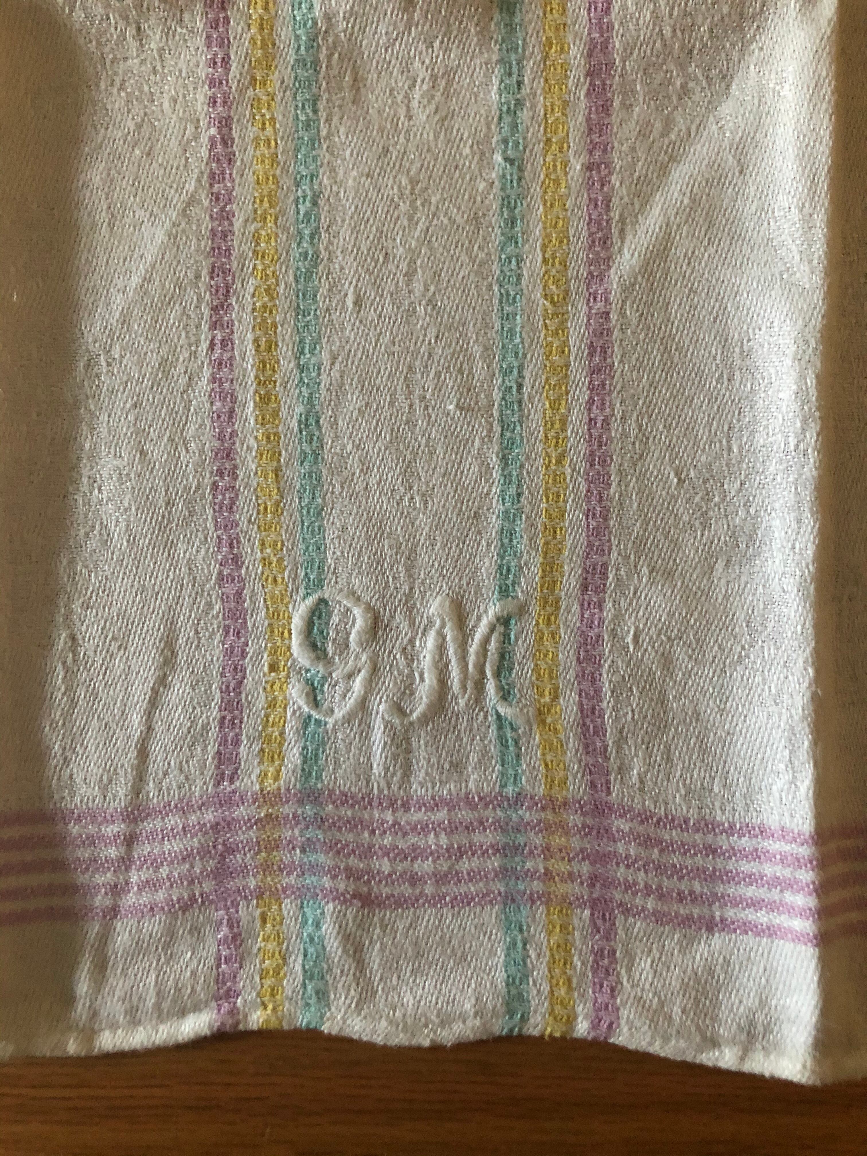 うっすらと浮き出るダマスク模様にパープル、グリーン、イエローのラインが入ったリネン生地に、モノグラム刺繍が素敵な一枚♫