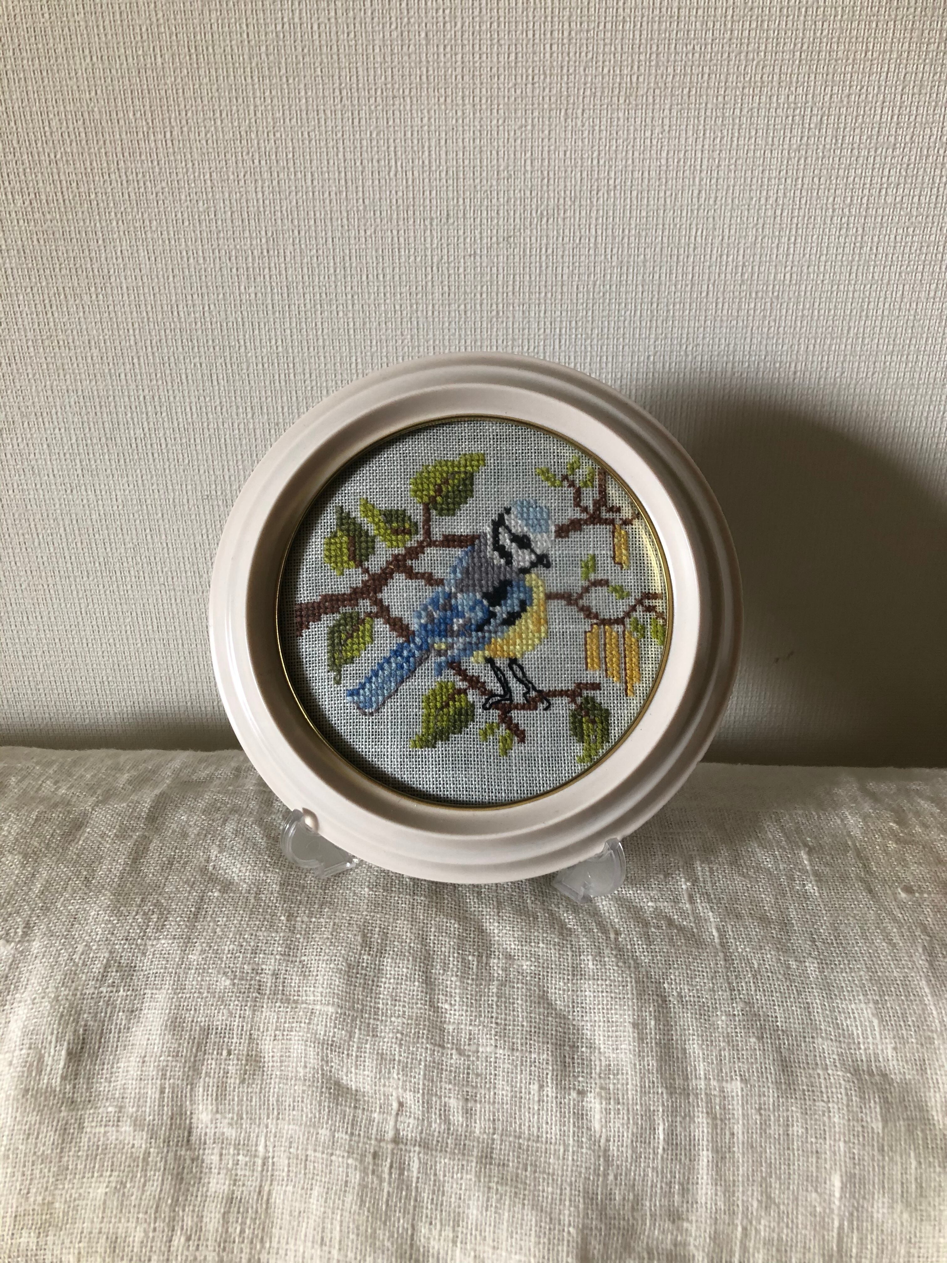 北欧 スウェーデン 丸額入りリネン刺繍飾り ヴィンテージ