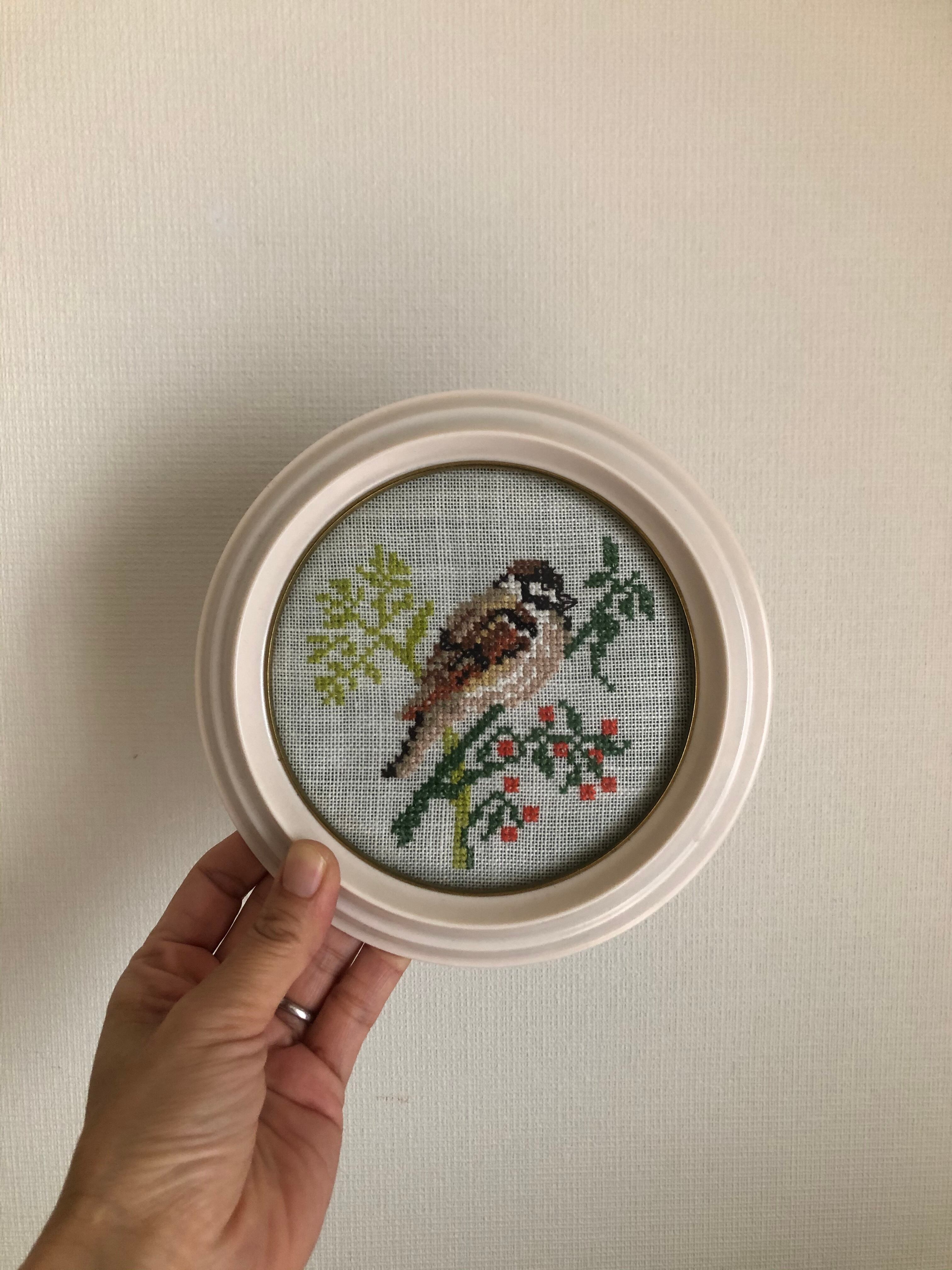 リネン生地に、枝に佇む鳥の刺繍が素敵な刺繍飾りです♫
