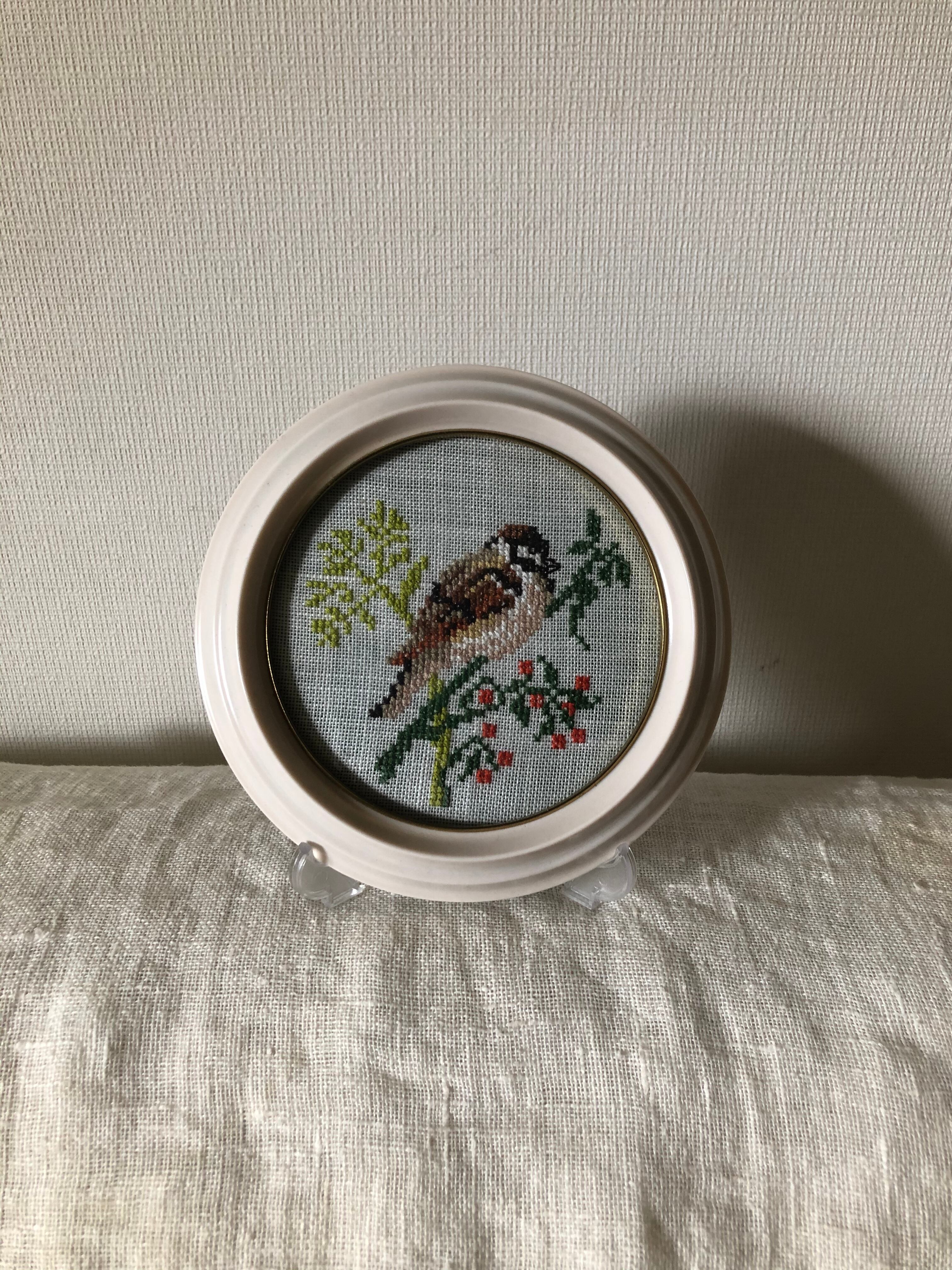北欧 スウェーデン 丸額入りリネン刺繍飾り ヴィンテージ