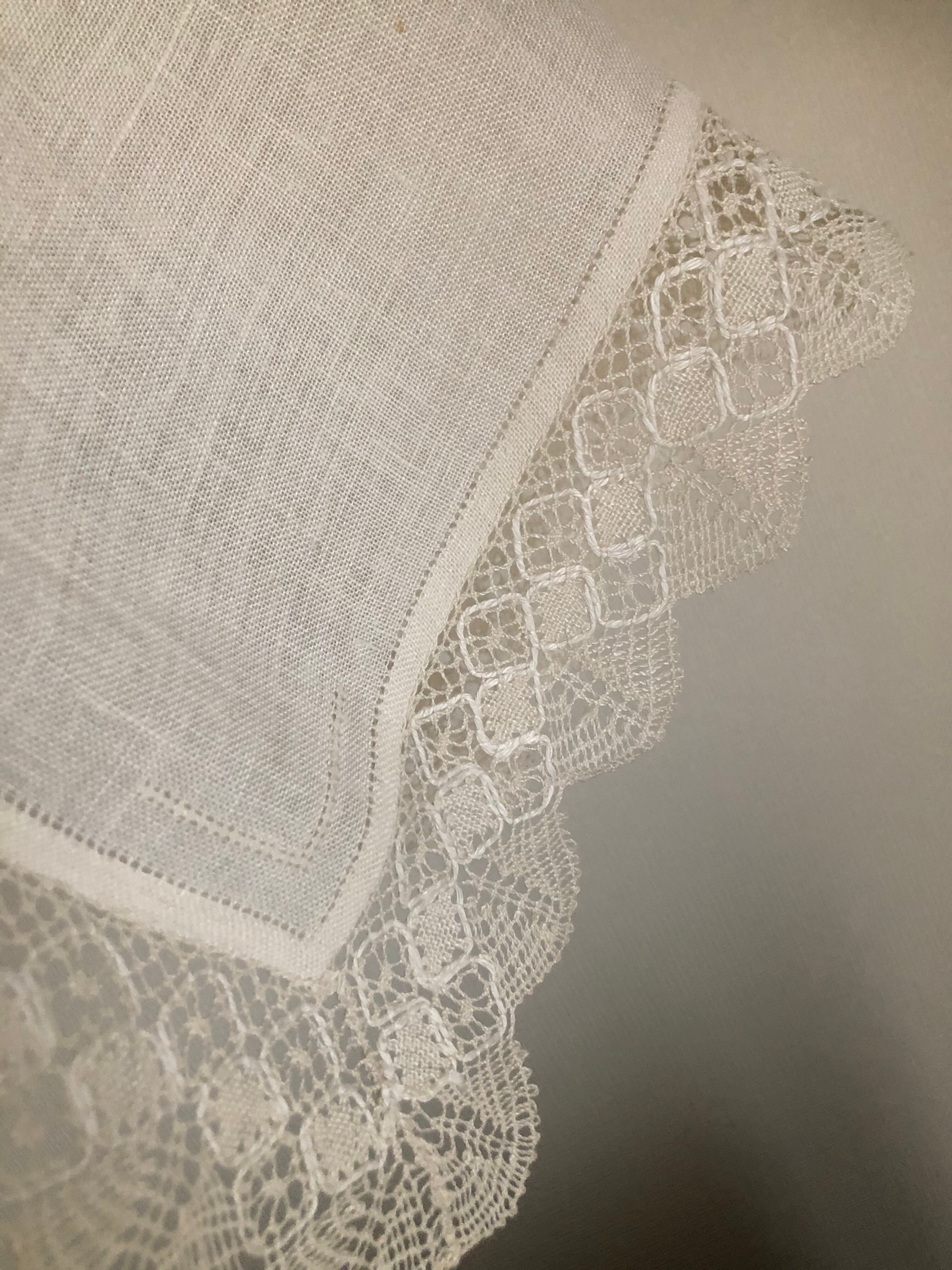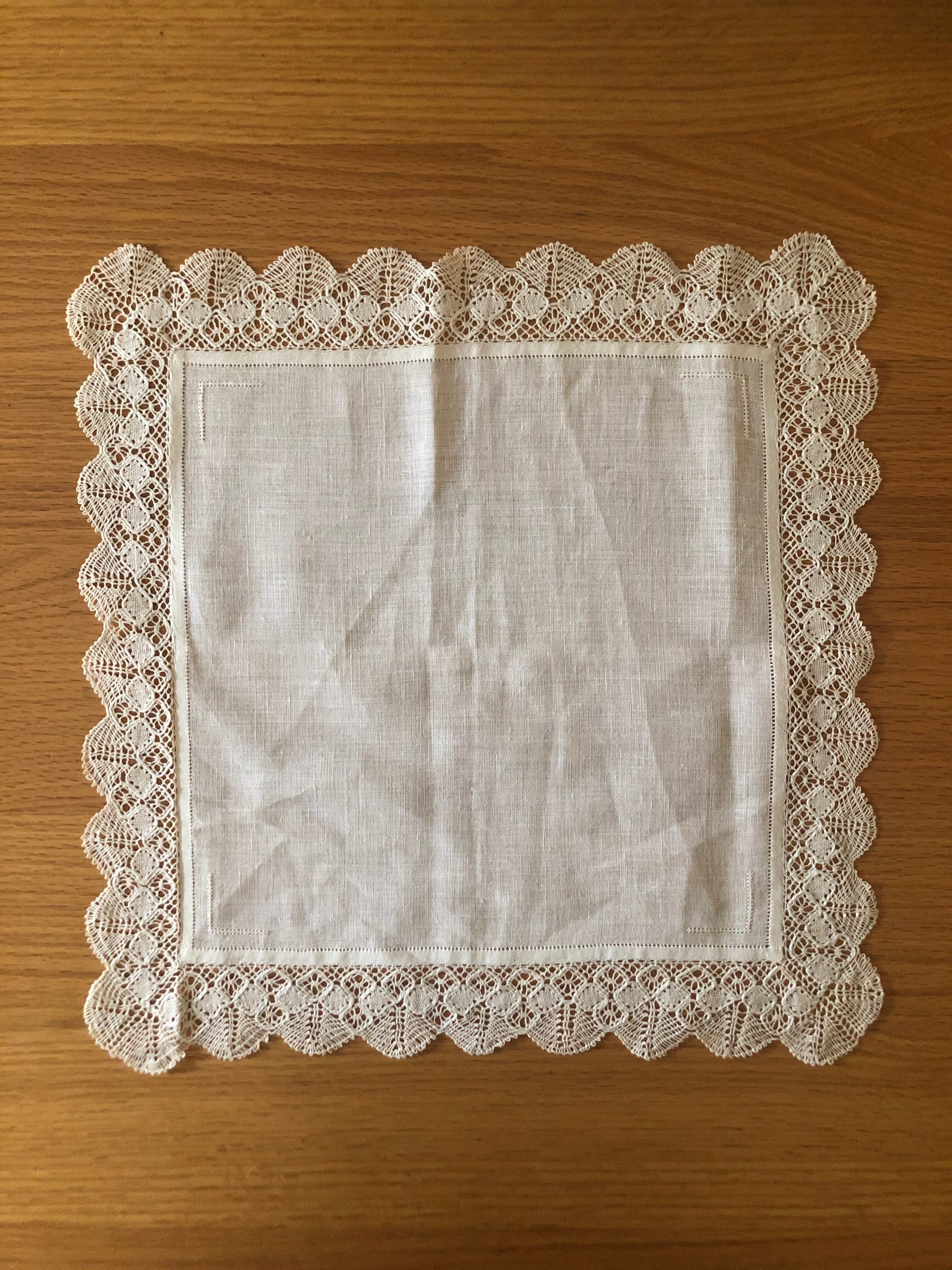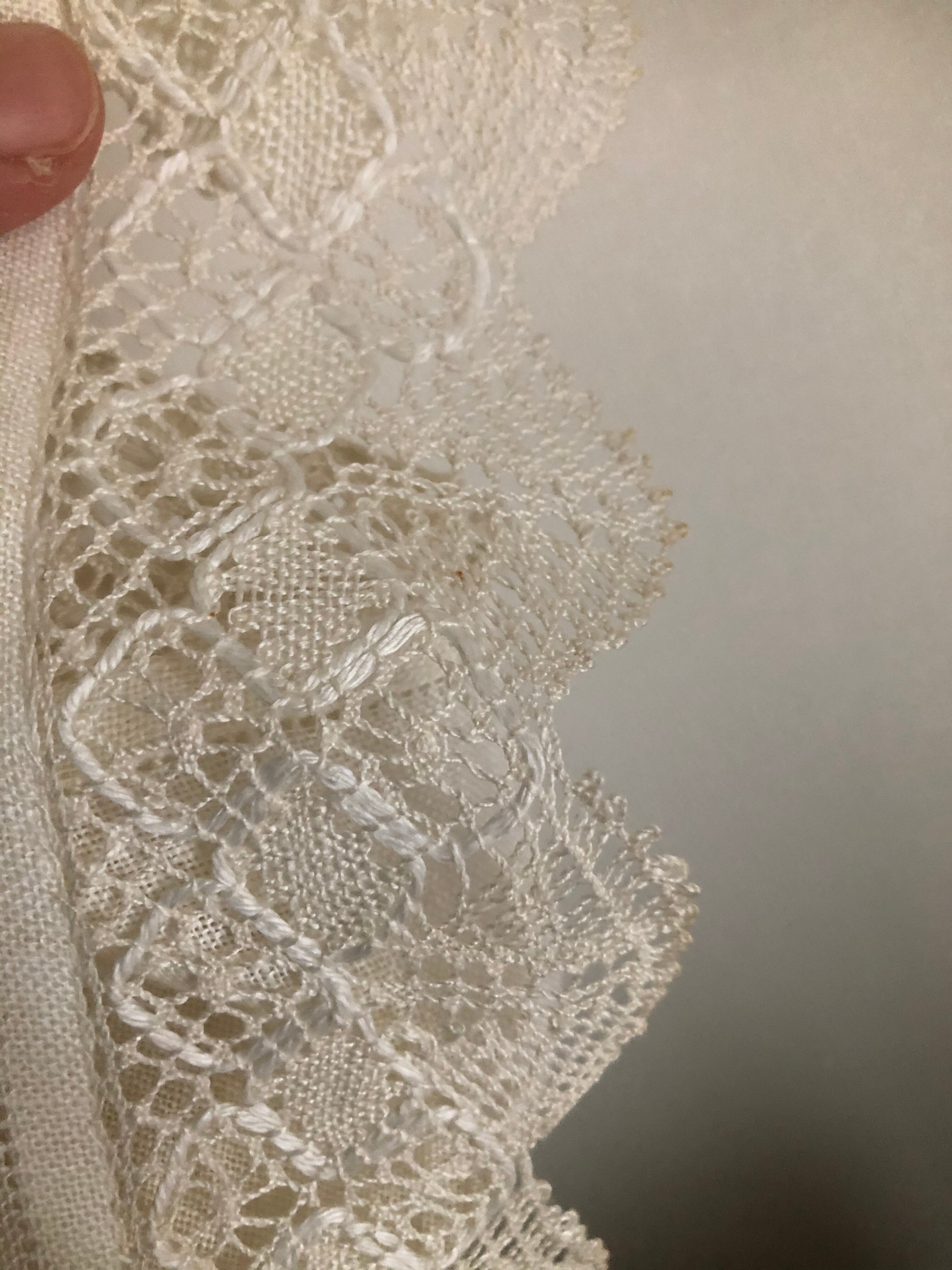 張りのあるリネン生地に、回りをぐるっと囲った繊細な透かし編みレースが素敵なクロス♫