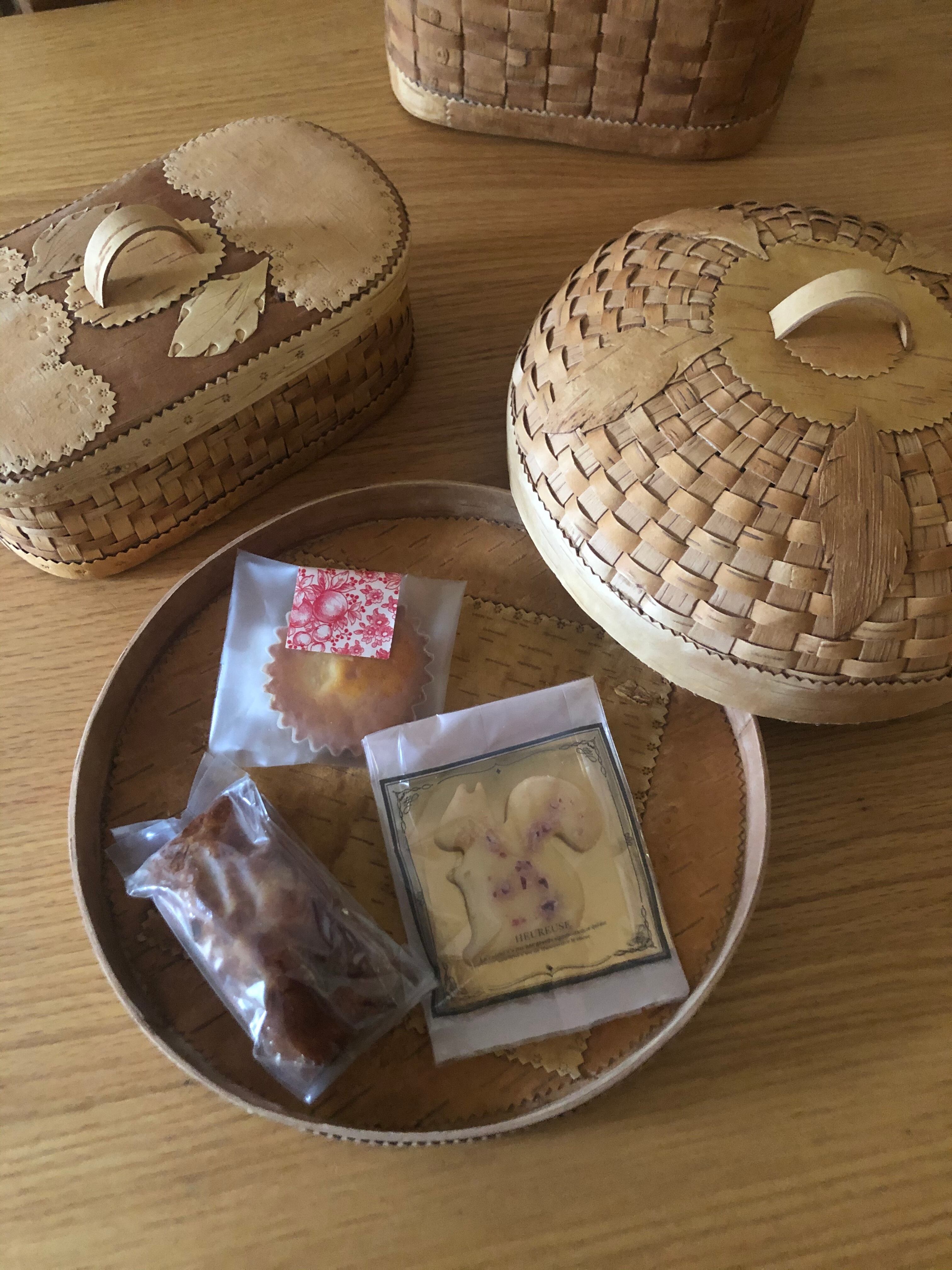葉っぱの細工模様と白樺編みのドーム型の蓋が、とても凝っていて素敵な、蓋つきのトレイになります。