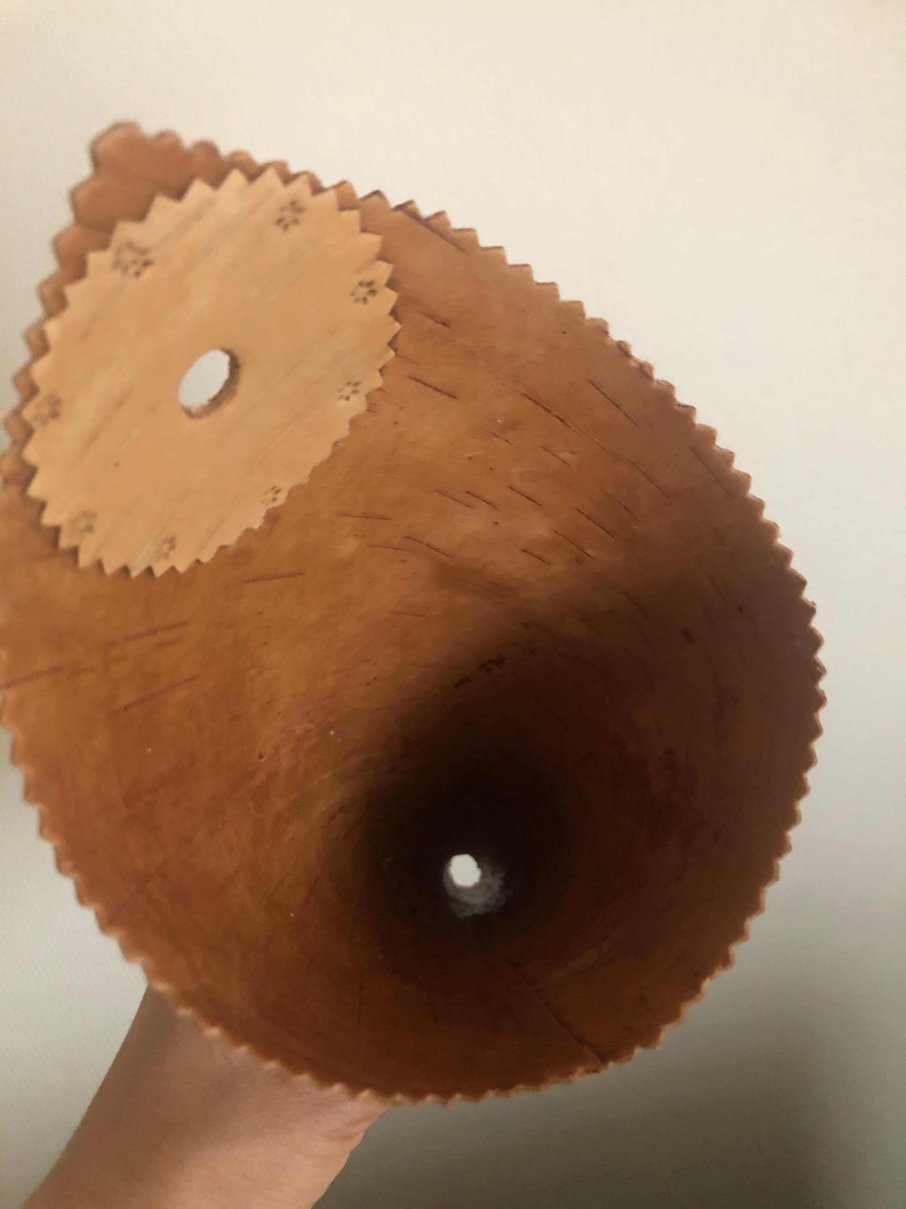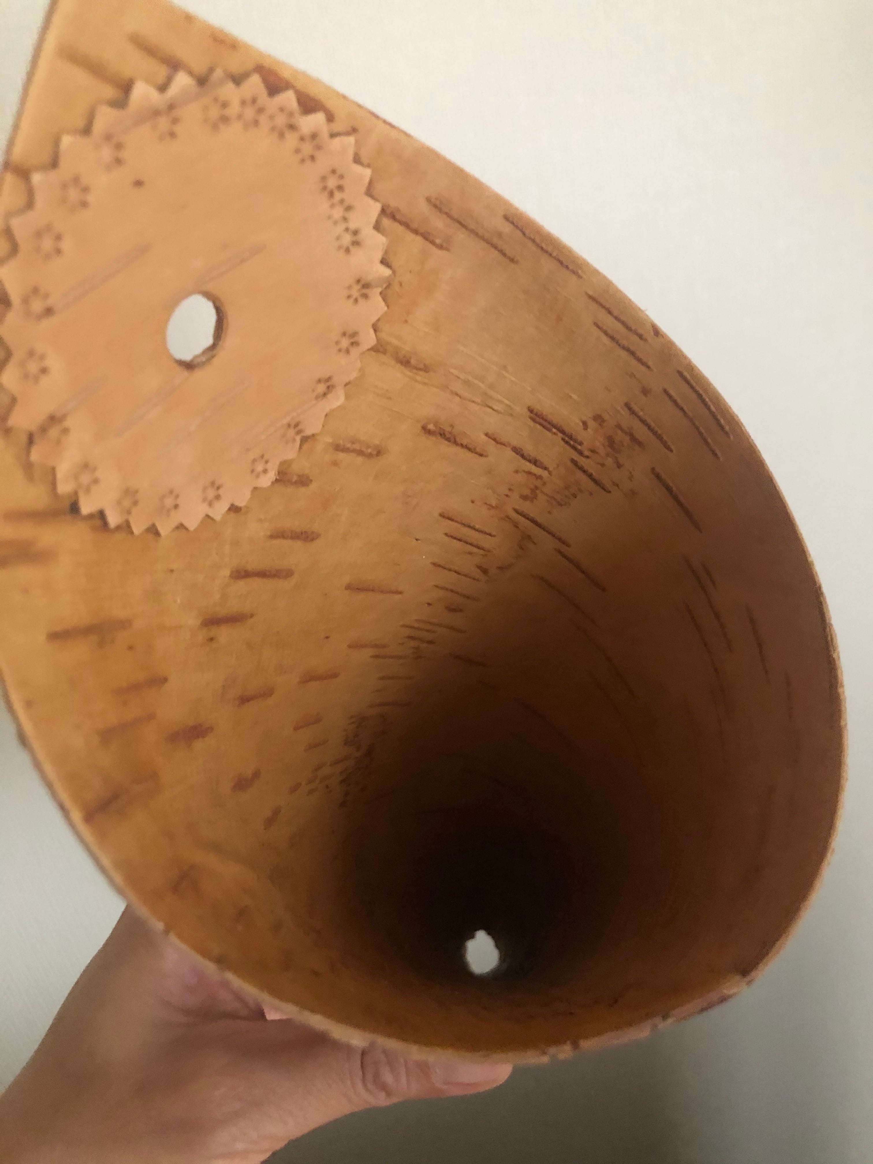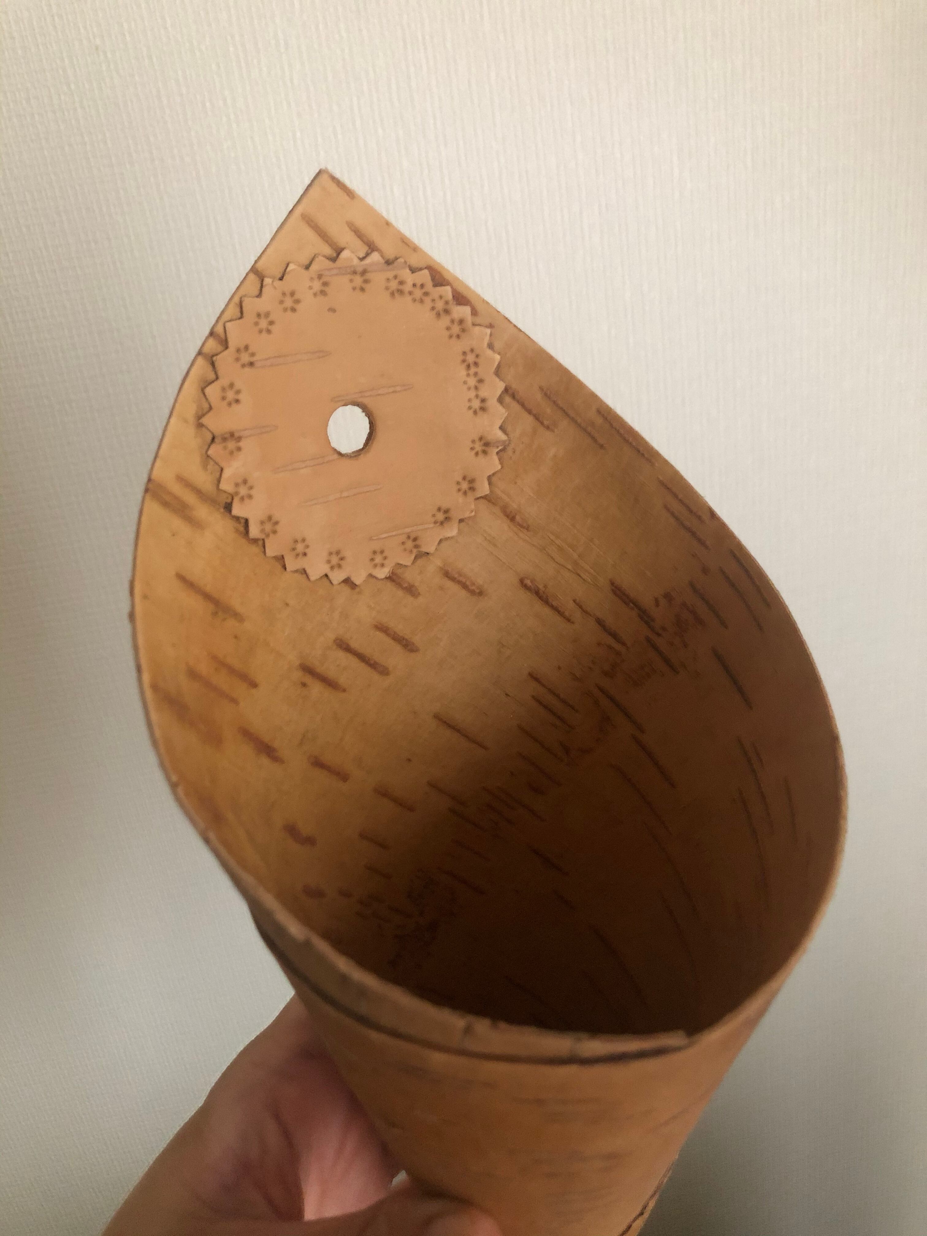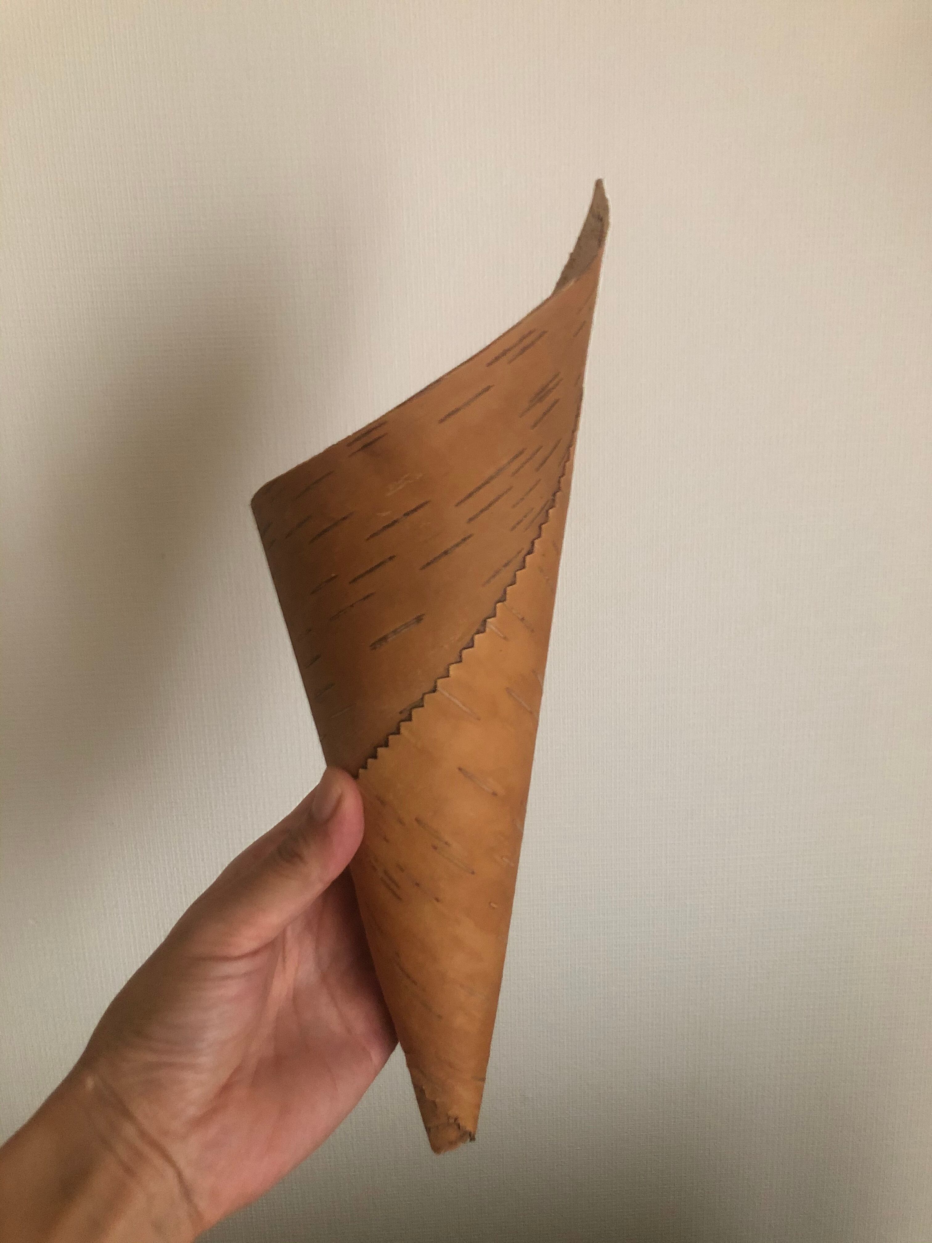 白樺の1枚樹皮をコーン型に巻いた、シンプルな壁掛けになります。