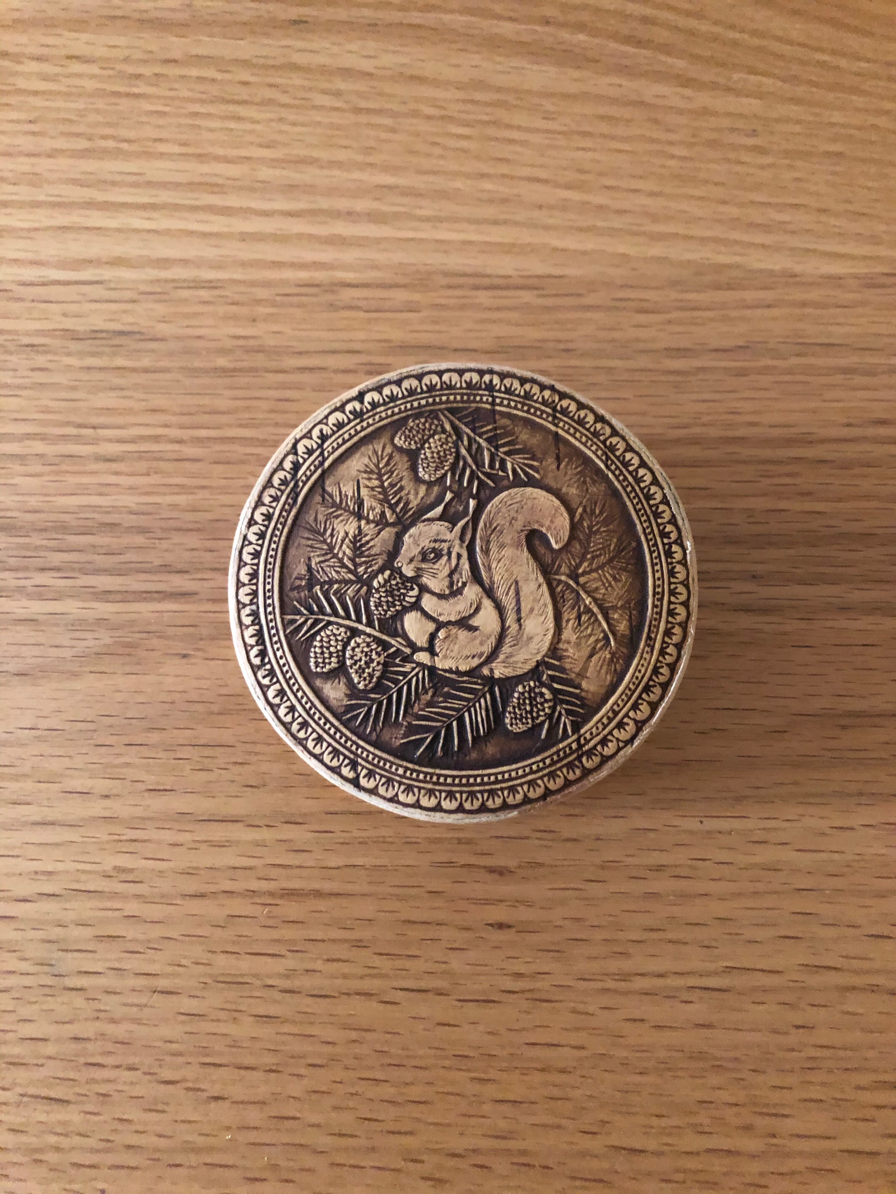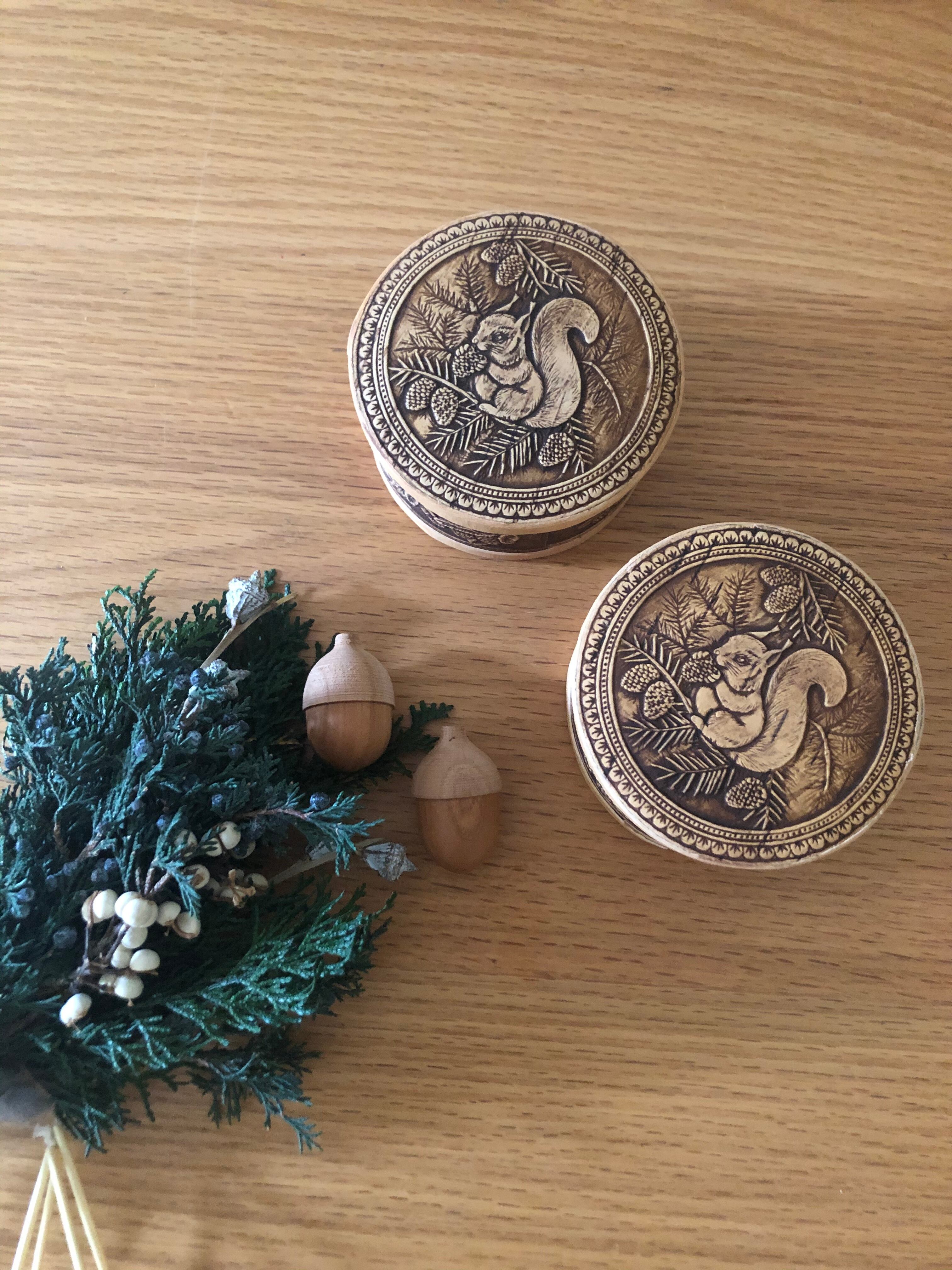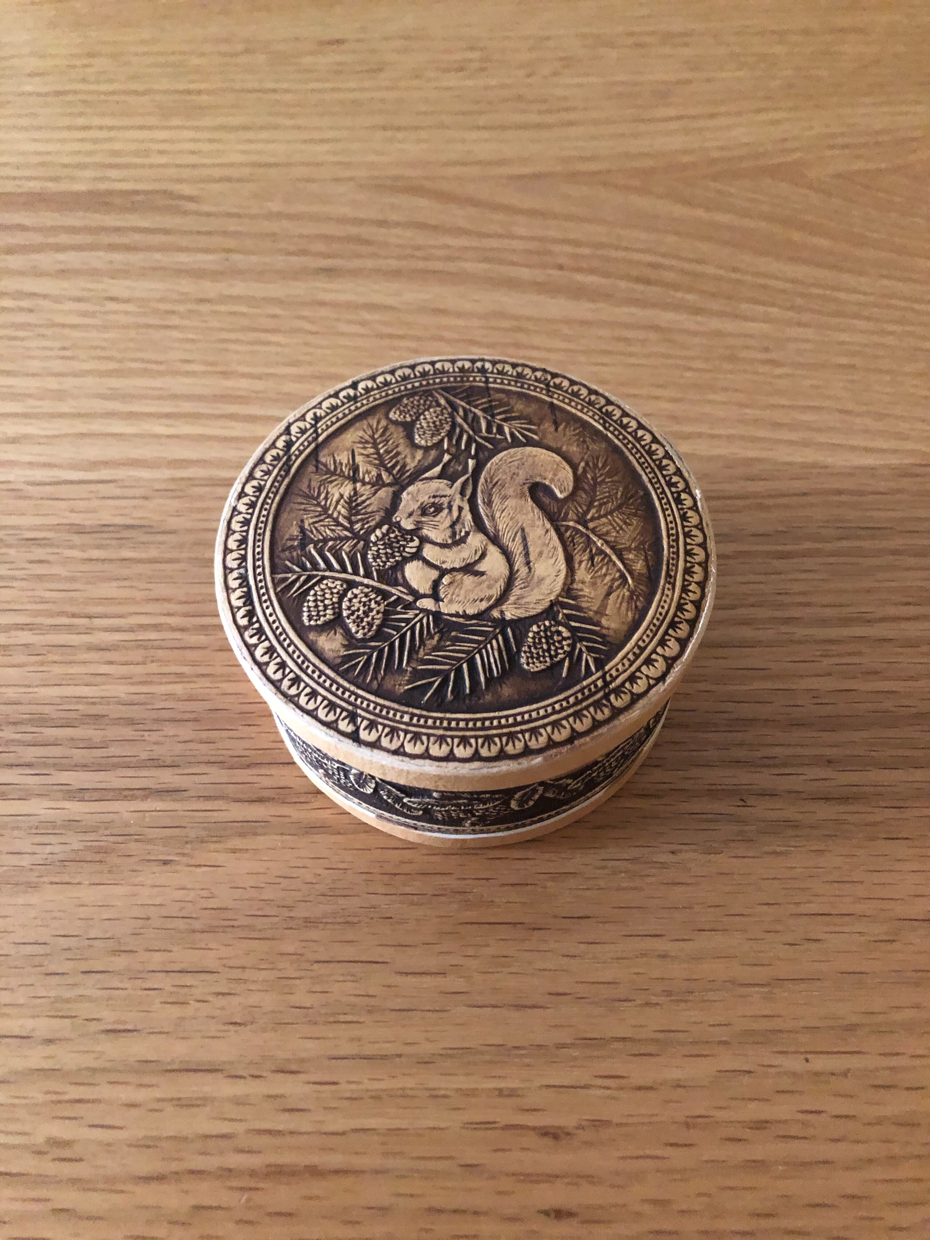 ロシア 白樺細工 リスの型押し 丸型ボックス