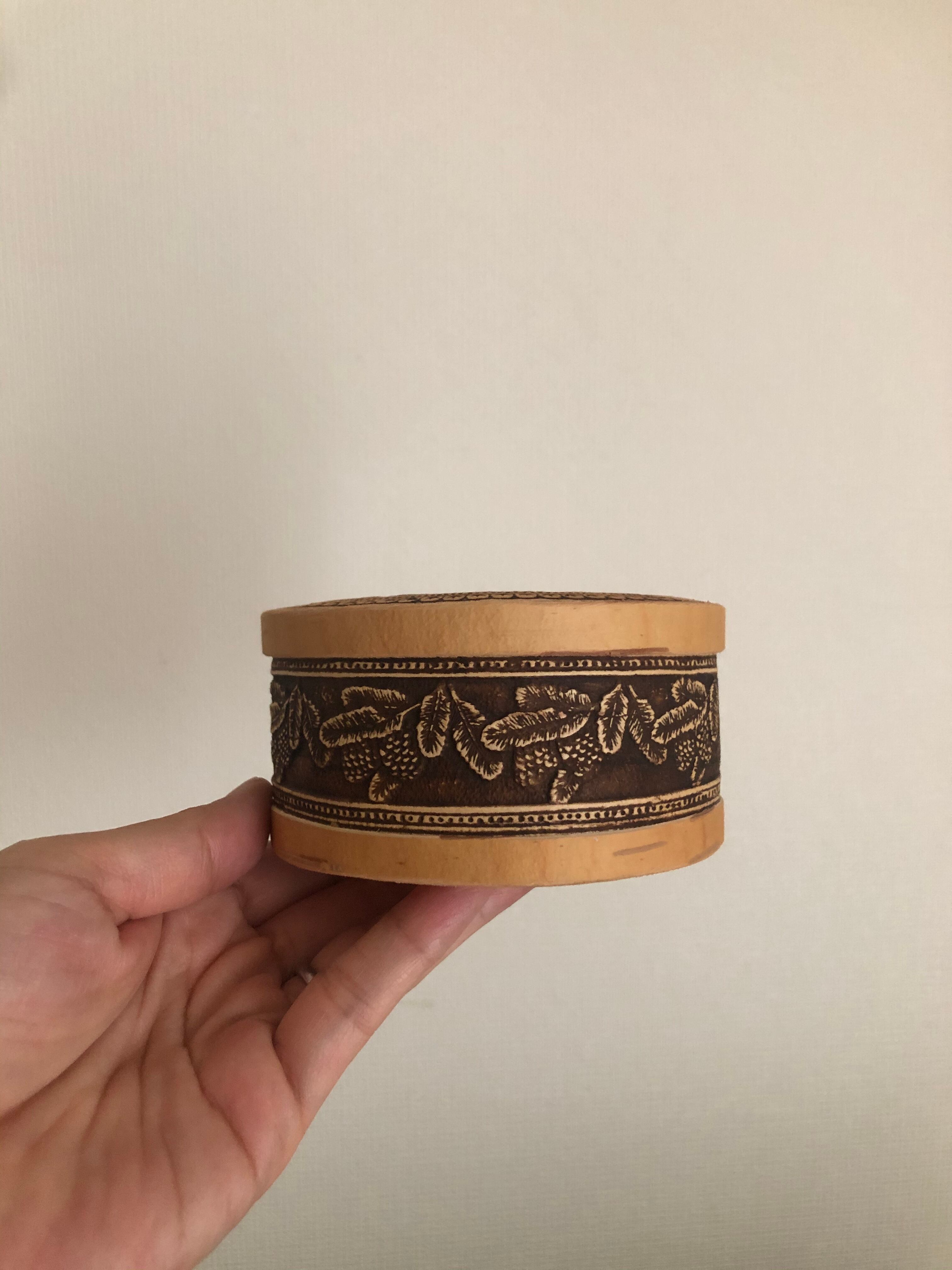 ロシアの白樺細工の型押し丸型ボックスになります。