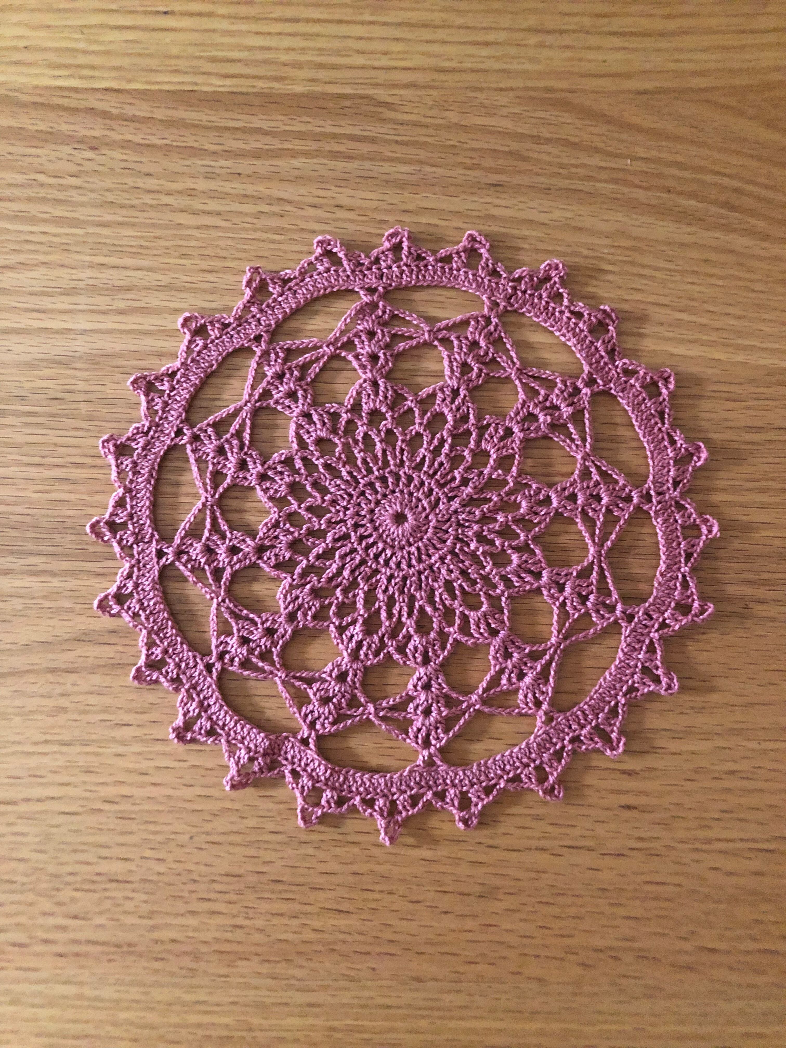 落ち着いた濃いめのピンク色のクロッシェ編みが可愛らしいドイリー♫