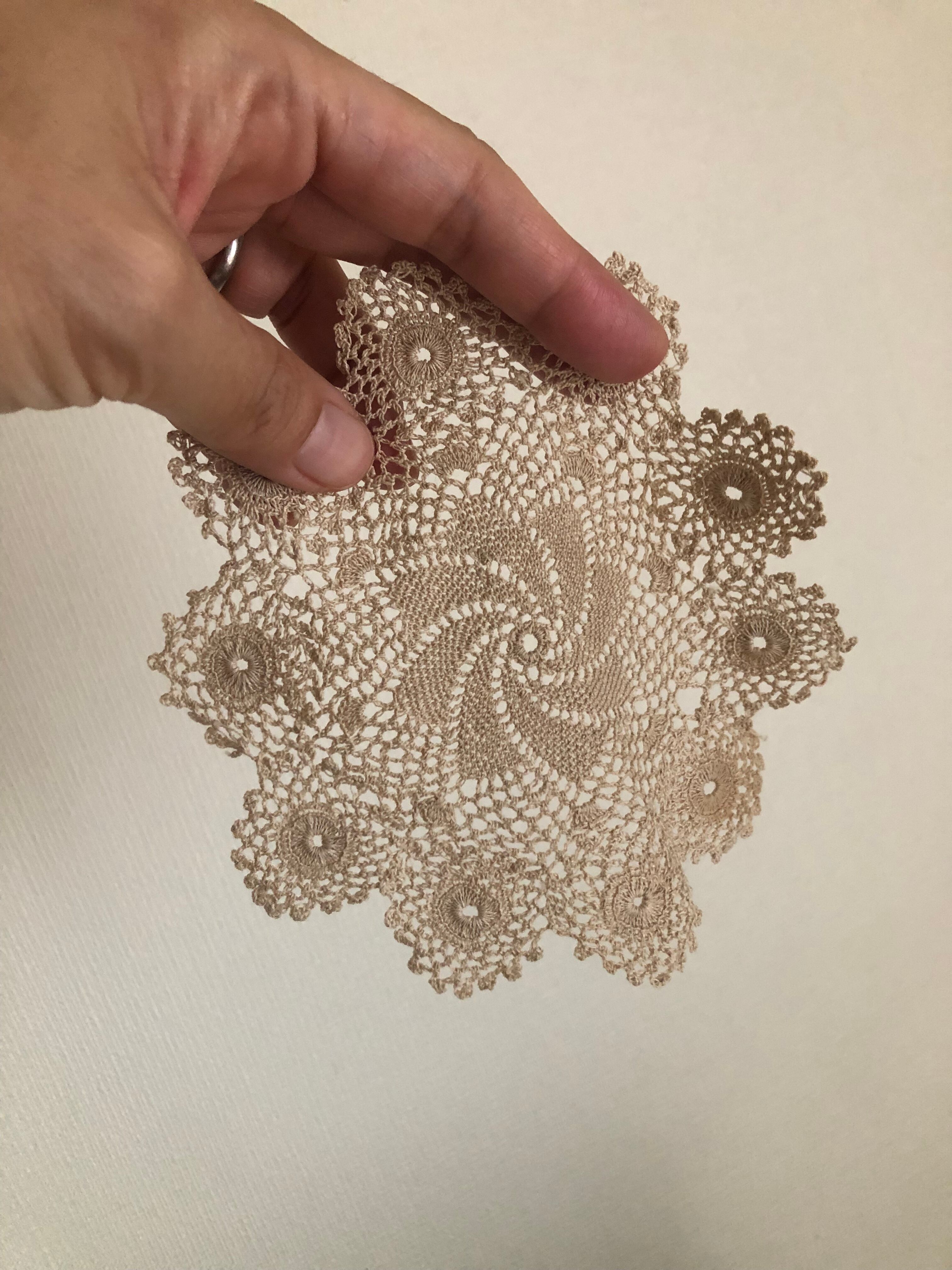 かぎ針で編まれたクロッシェレースが素敵な小さめのドイリーになります。