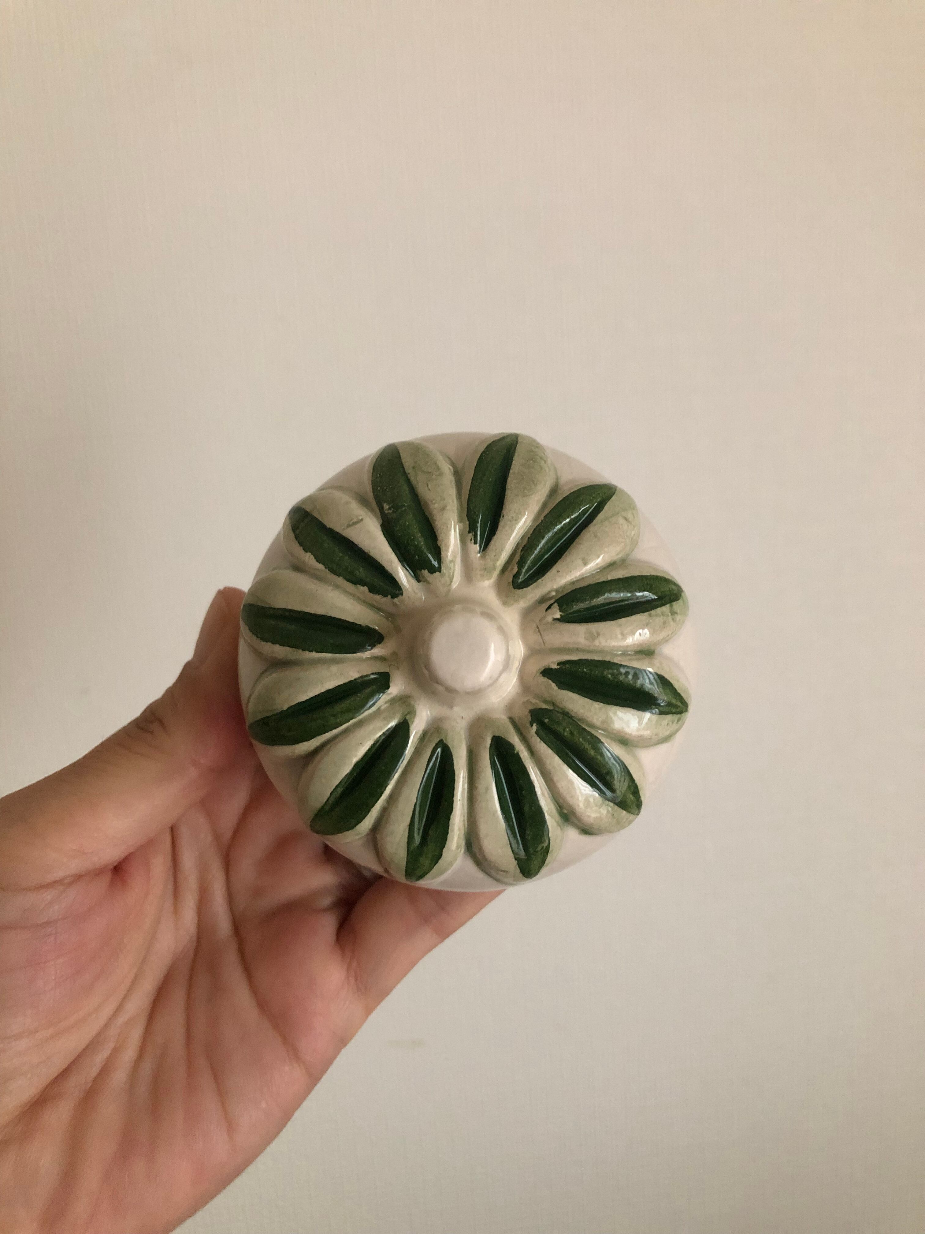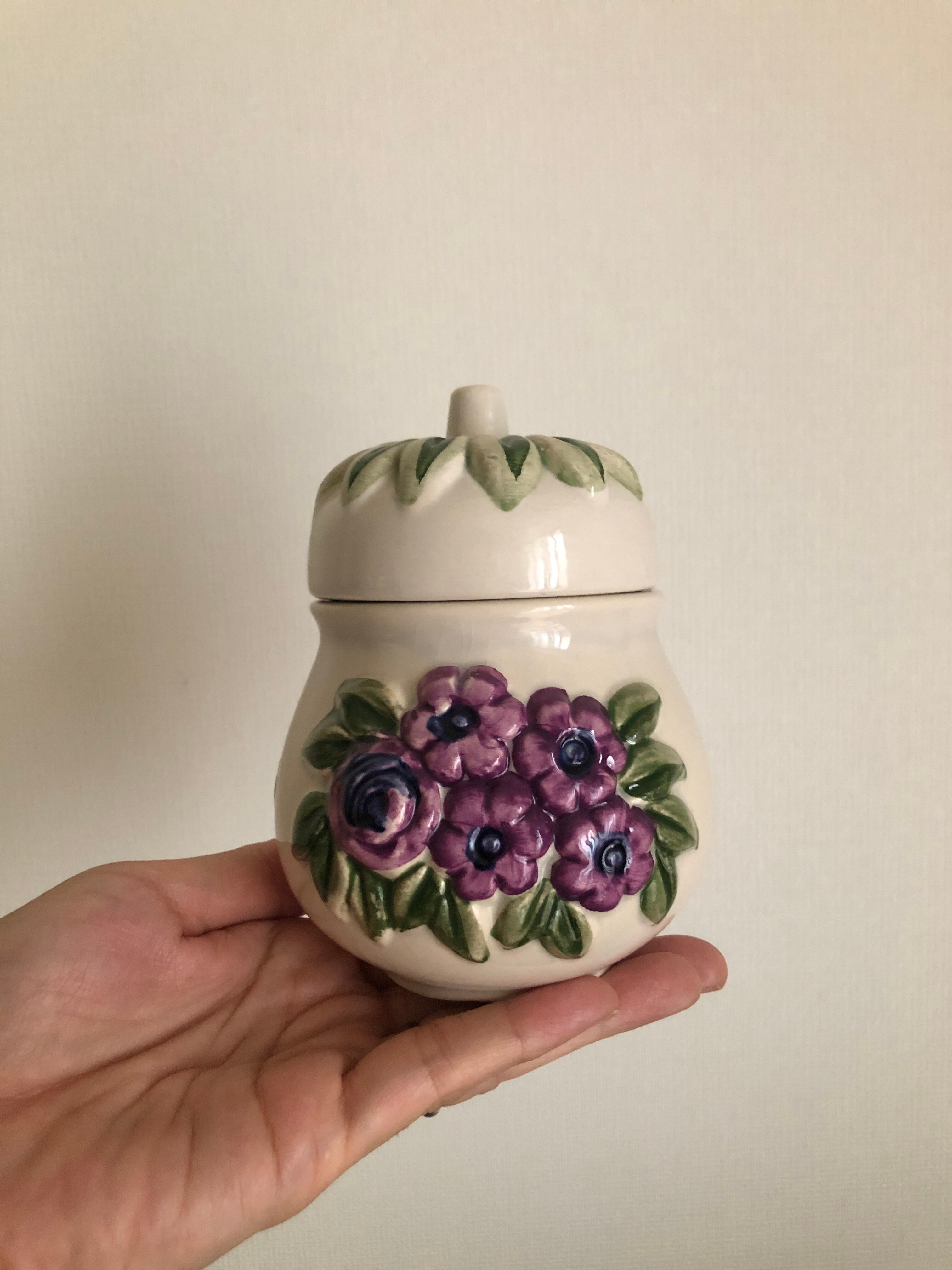 こんもりしたフォルムと、優しい色合いの白に、立体的なパープルのお花とグリーンの葉っぱが可愛らしい蓋付きポット♫