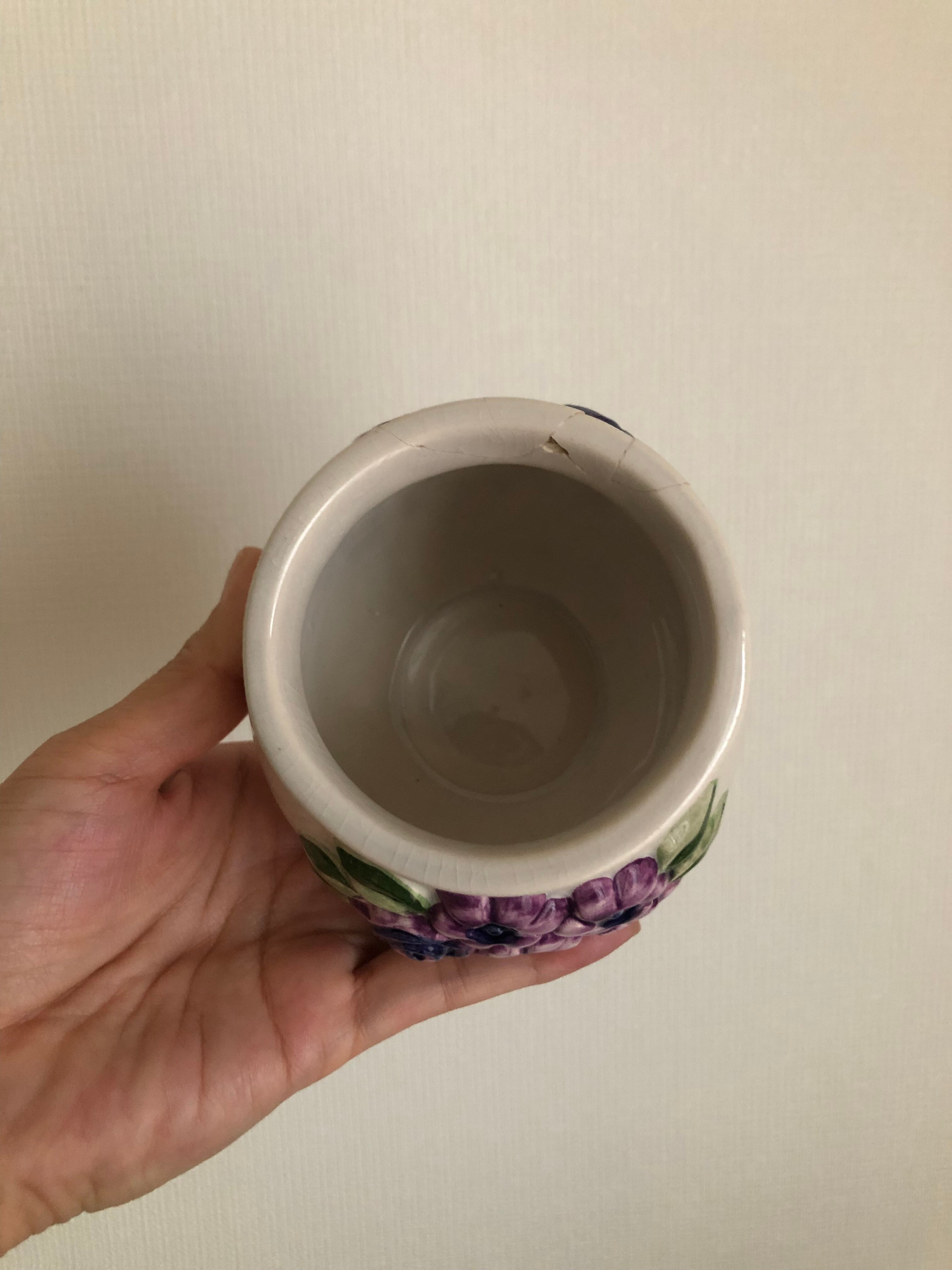 こんもりしたフォルムと、優しい色合いの白に、立体的なパープルのお花とグリーンの葉っぱが可愛らしい蓋付きポット♫