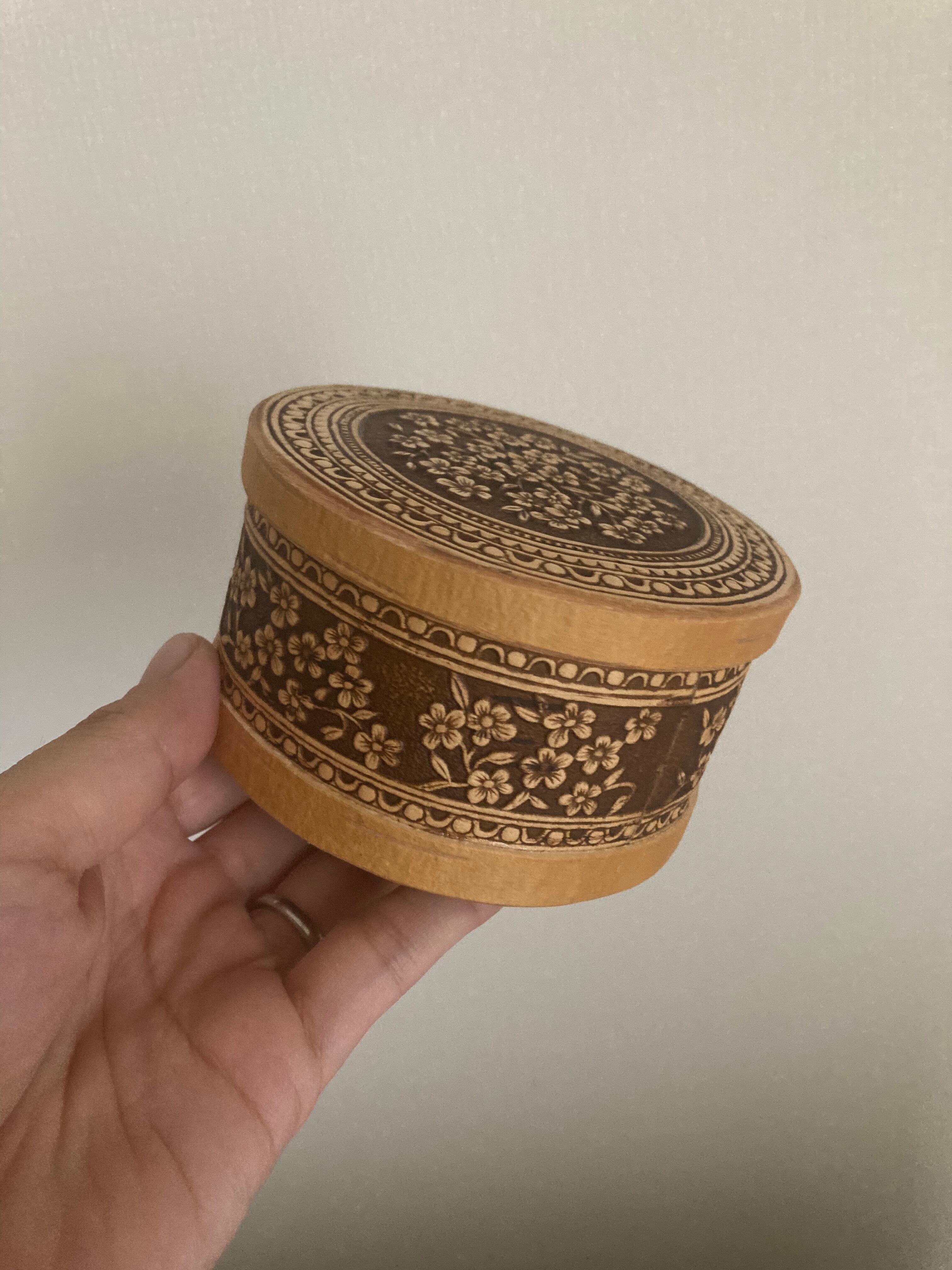 ロシアの白樺細工の型押し丸型ボックスになります。
