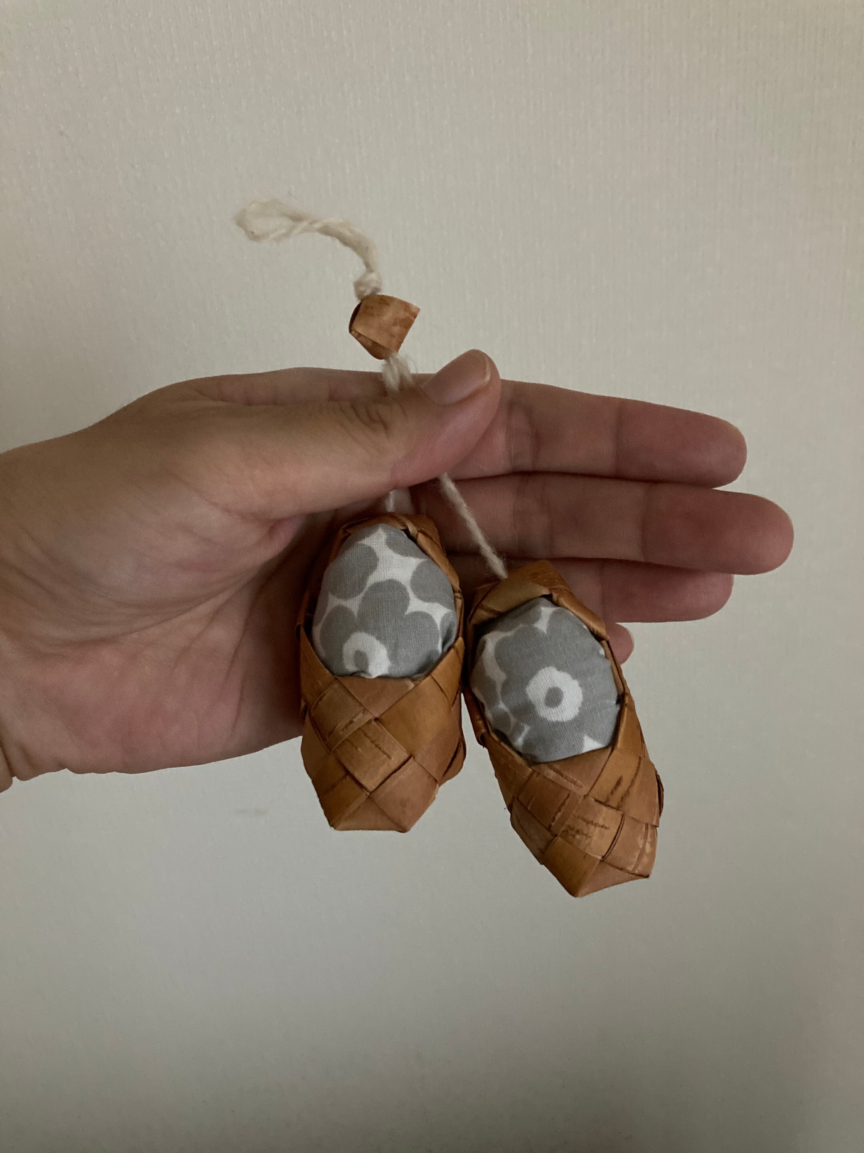 ロシアの白樺細工の職人さんが作った白樺の靴のオーナメントに、ヴィンテージのマリメッコのハギレ生地(ピックイネンウニッコ)を合わせたオーナメント♫(キルト芯をクシュっとしたものにハギレ生地を被せて入れています。特に縫ったりはしてないので、簡単に取り外し可能です)。