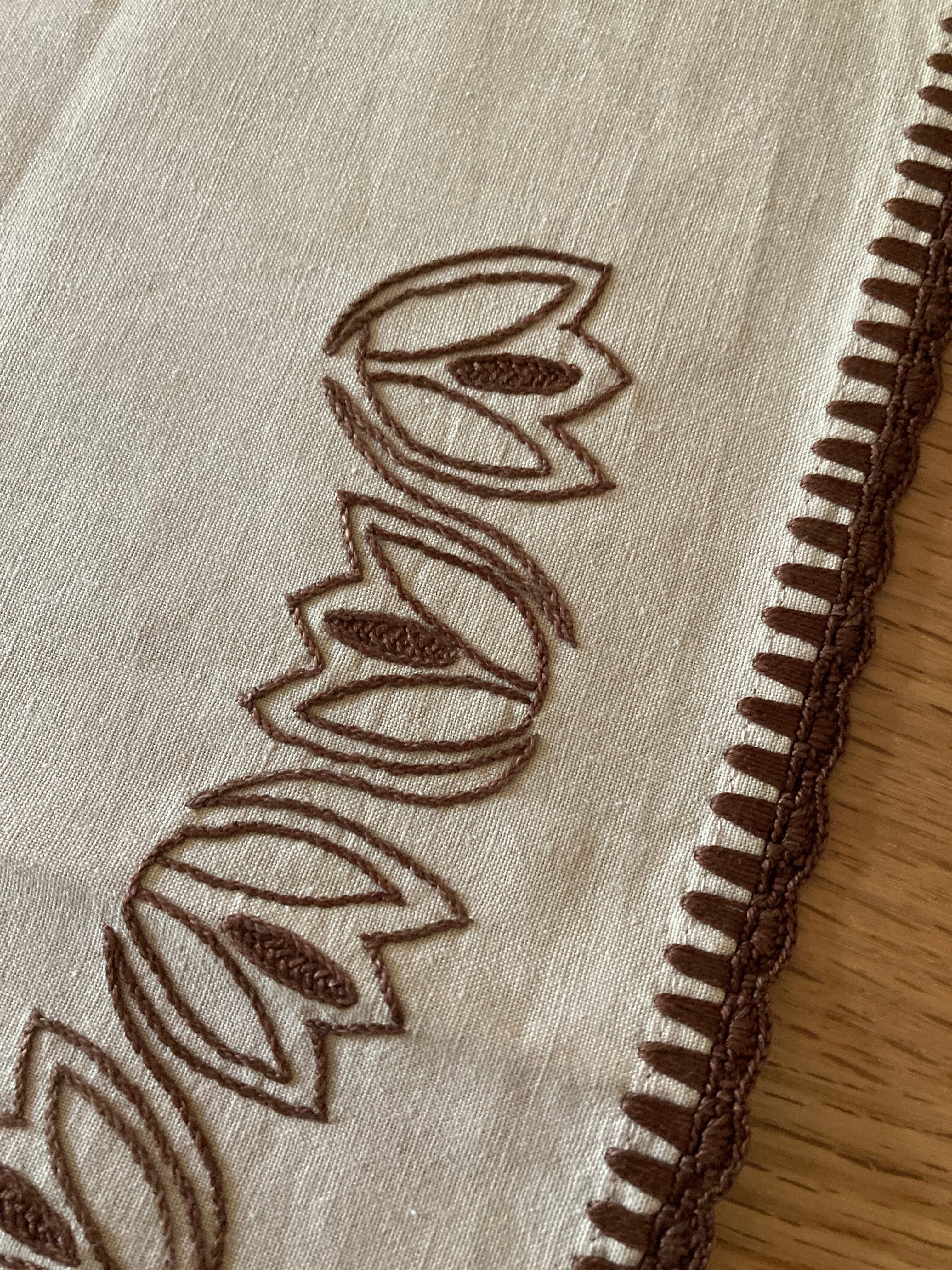 モカベージュのコットン生地に、ブラウンのチューリップの刺繍と回りのステッチ、波型刺繍が可愛いらしく、素敵な一枚♫