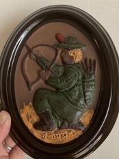 弓矢で矢をひいてる素朴な絵柄が可愛いらしい陶板になります♫
