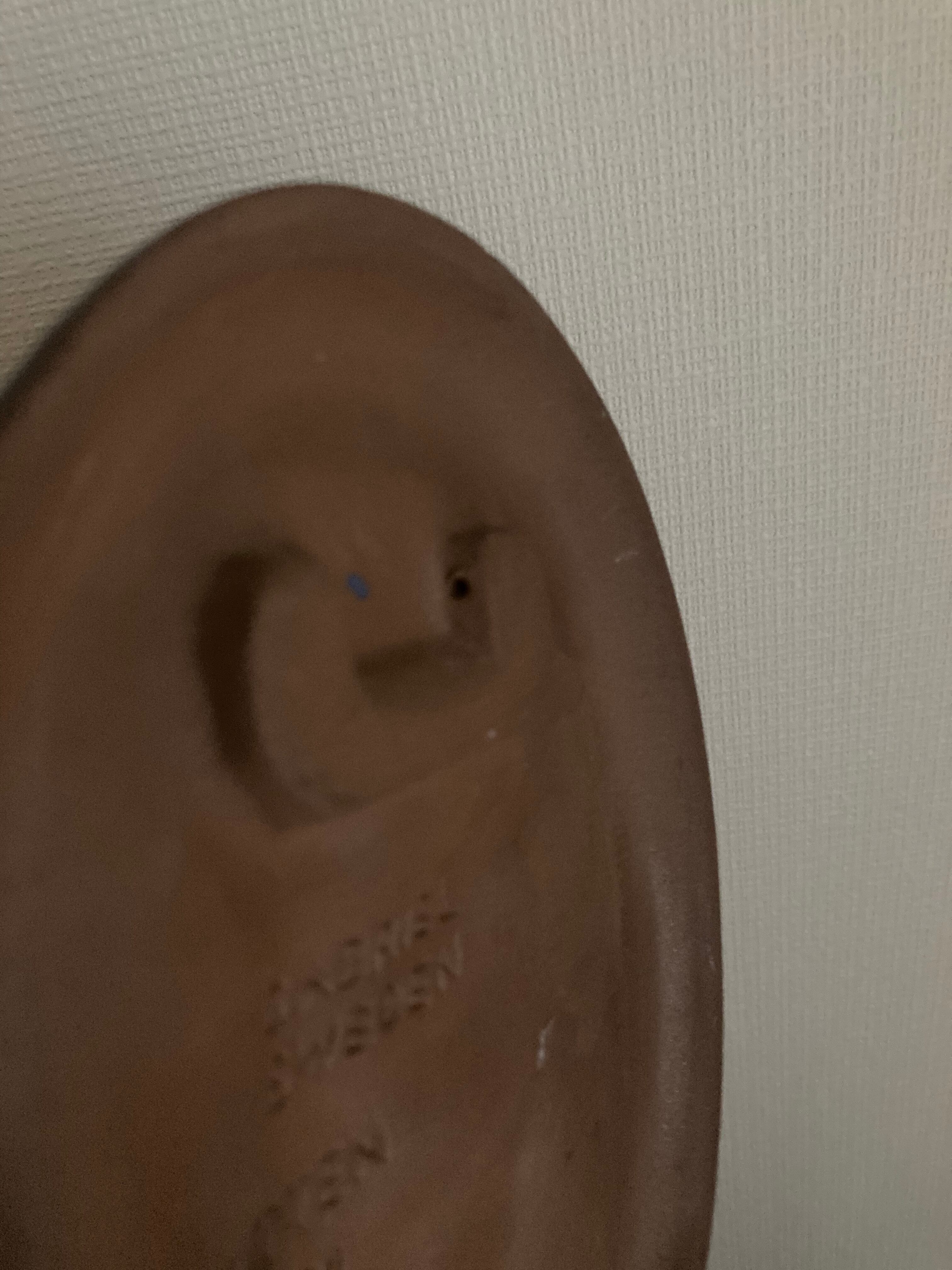 こちらは、裏側に針金などの通す穴が何故か内側にしかあいてないため(写真11.12枚目参照)、飾る時は、壁などにたてかけるか、お皿立てなどに立てて飾って下さい。