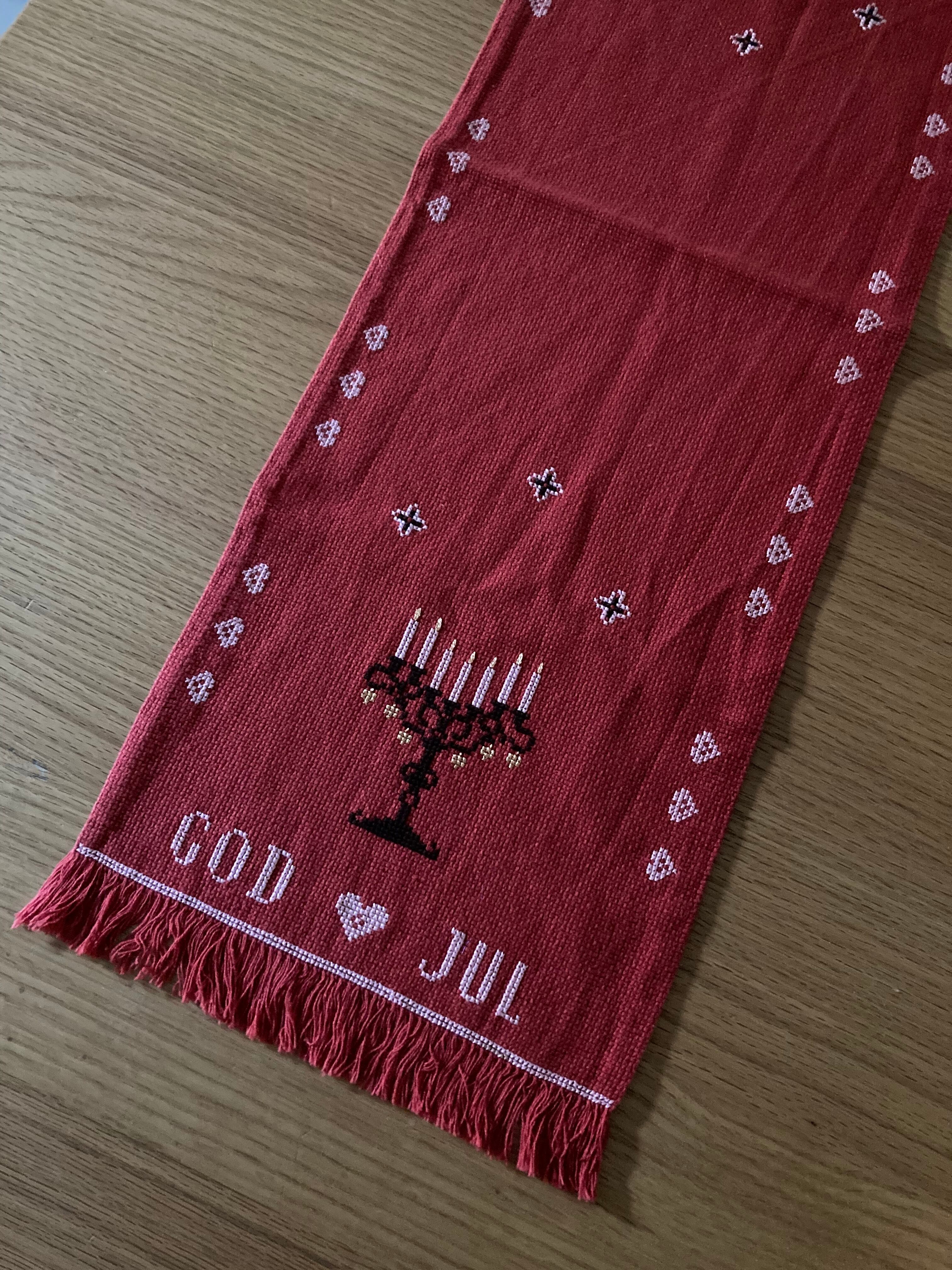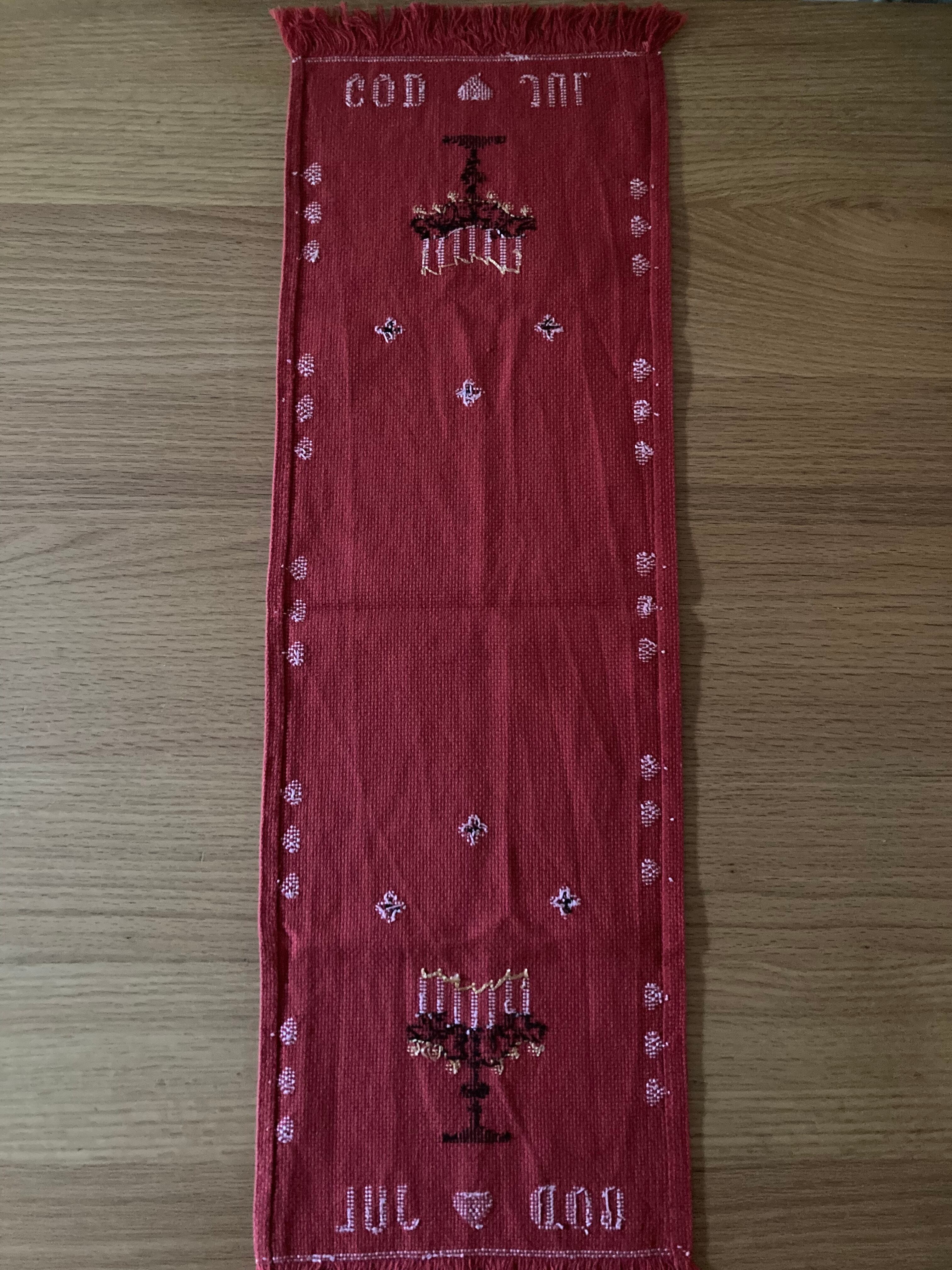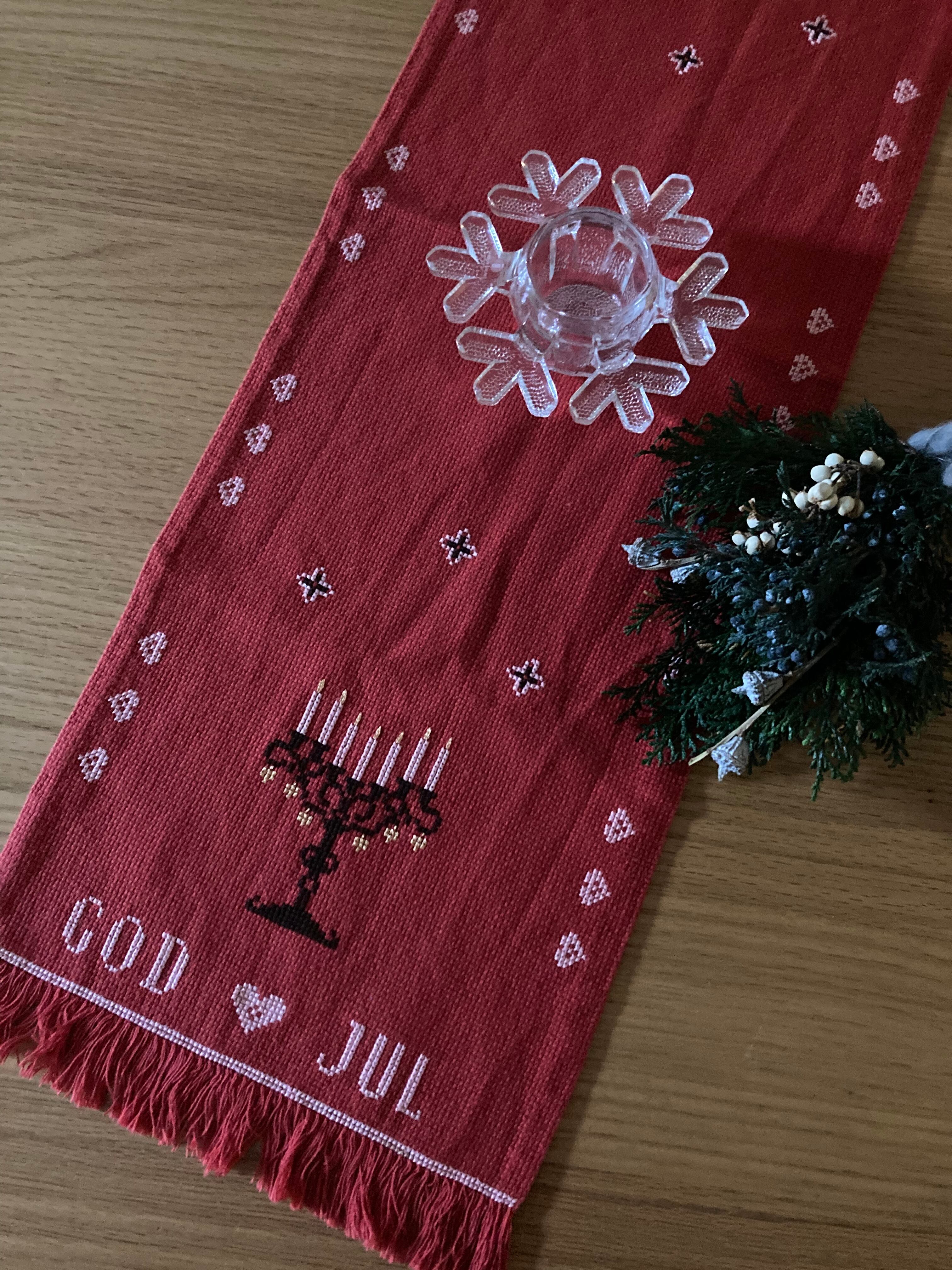 赤のコットン生地に、キャンドルと燭台の刺繍が素敵なクリスマスのロングクロス♫