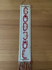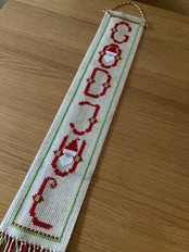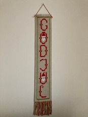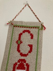 しっかりした生成色のリネン生地に、GOD JULの文字の間にサンタの顔の刺繍が、とても凝っていて可愛らしいクリスマスのタペストリーです♫