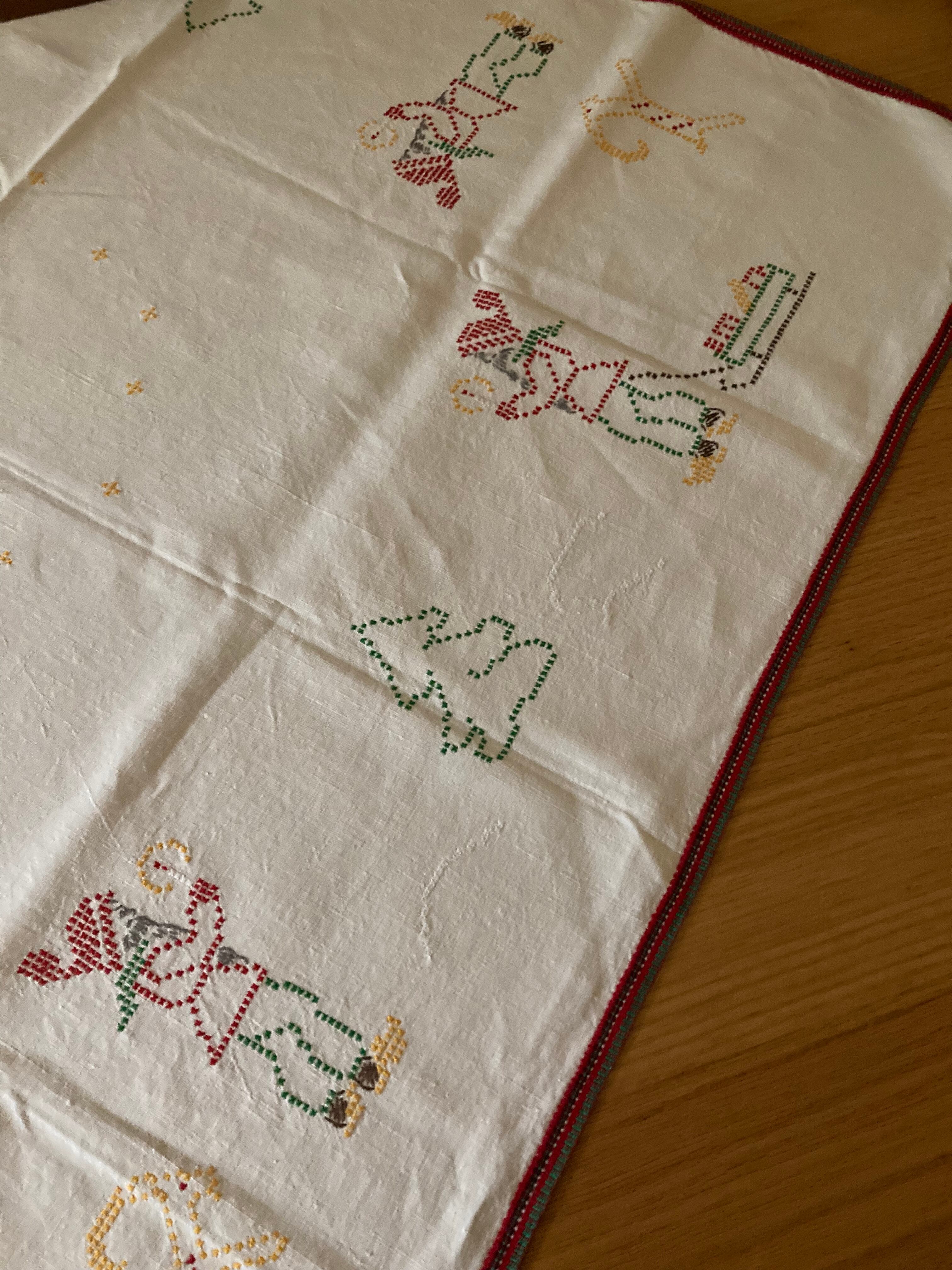 北欧 サンタとツリー刺繍のテーブルクロス ヴィンテージ