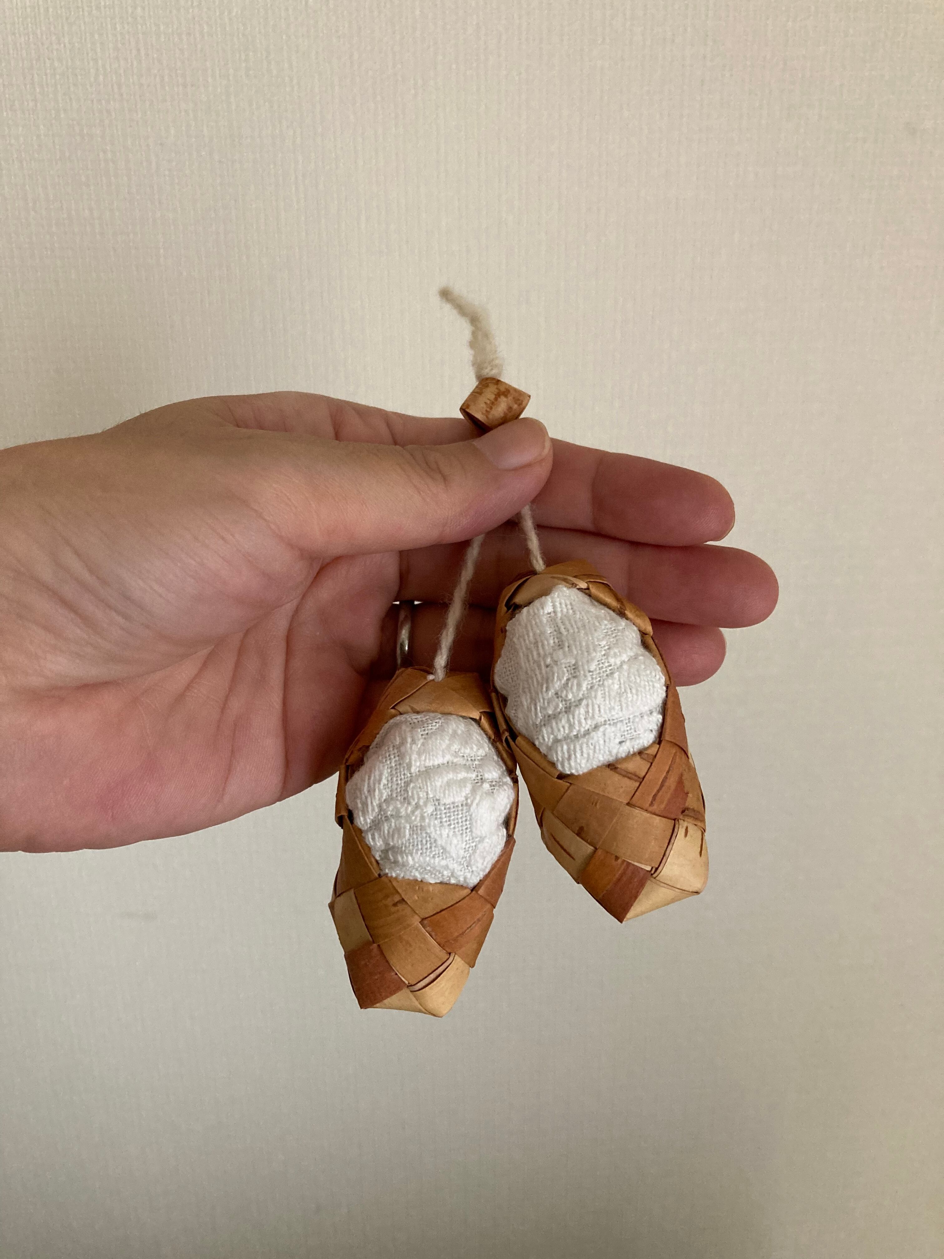 ❤︎2点セット❤︎ロシア 白樺な小人の靴のオーナメントと北欧 リネンレース編みミニサイズのドイリー ヴィンテージ