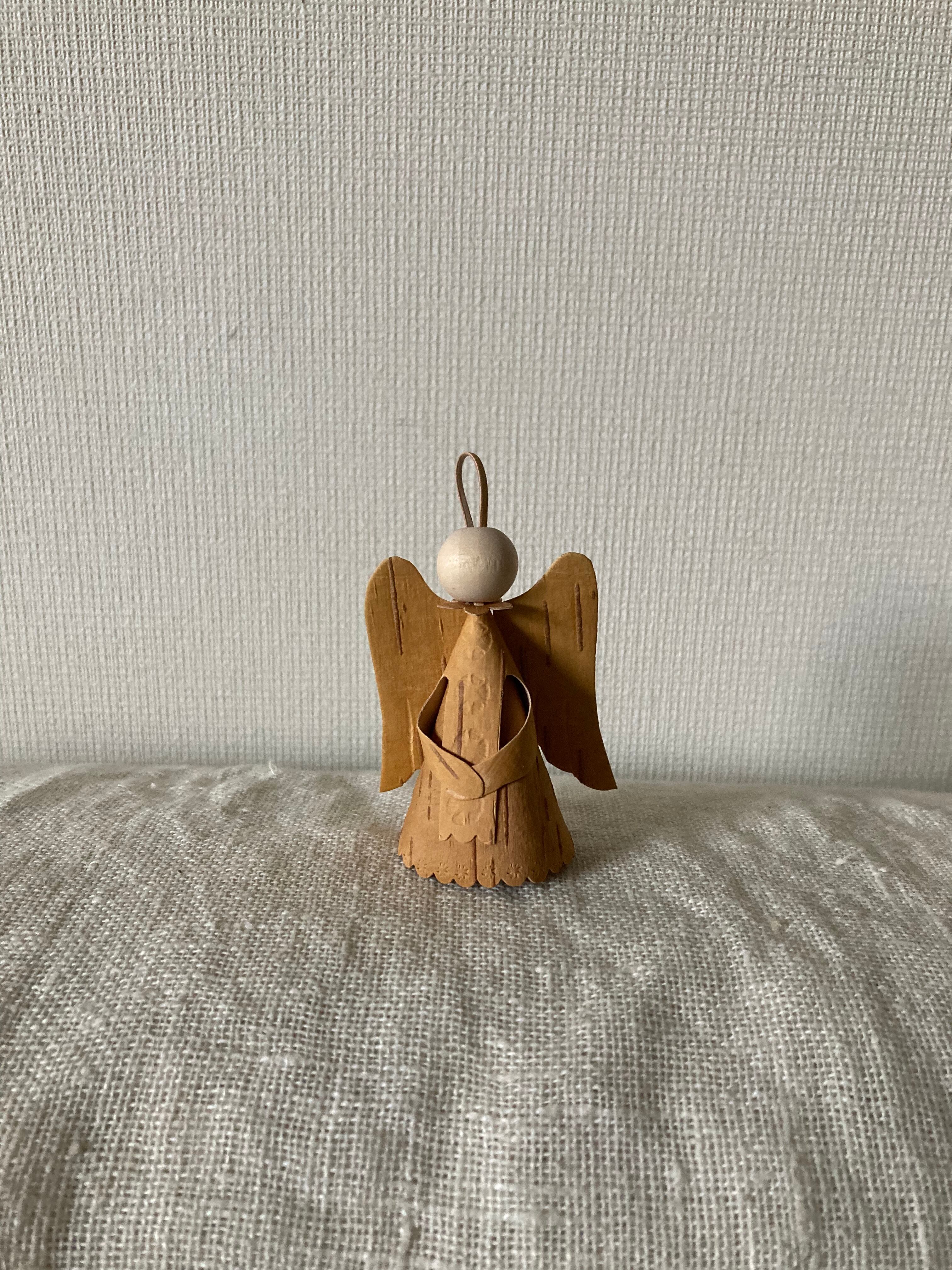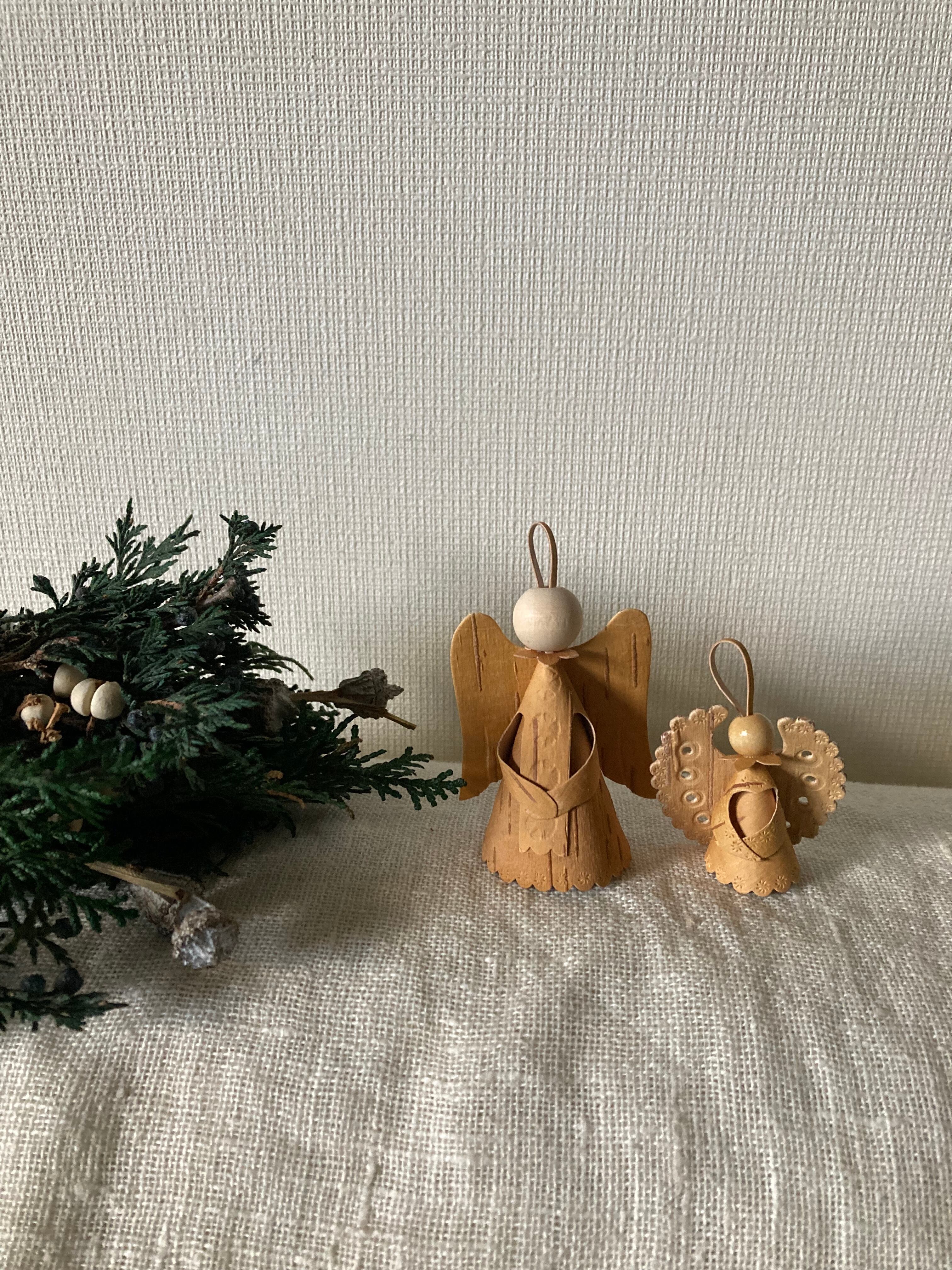 まん丸の顔がなんとも愛らしい、白樺の樹皮で作られた天使のオーナメントです。