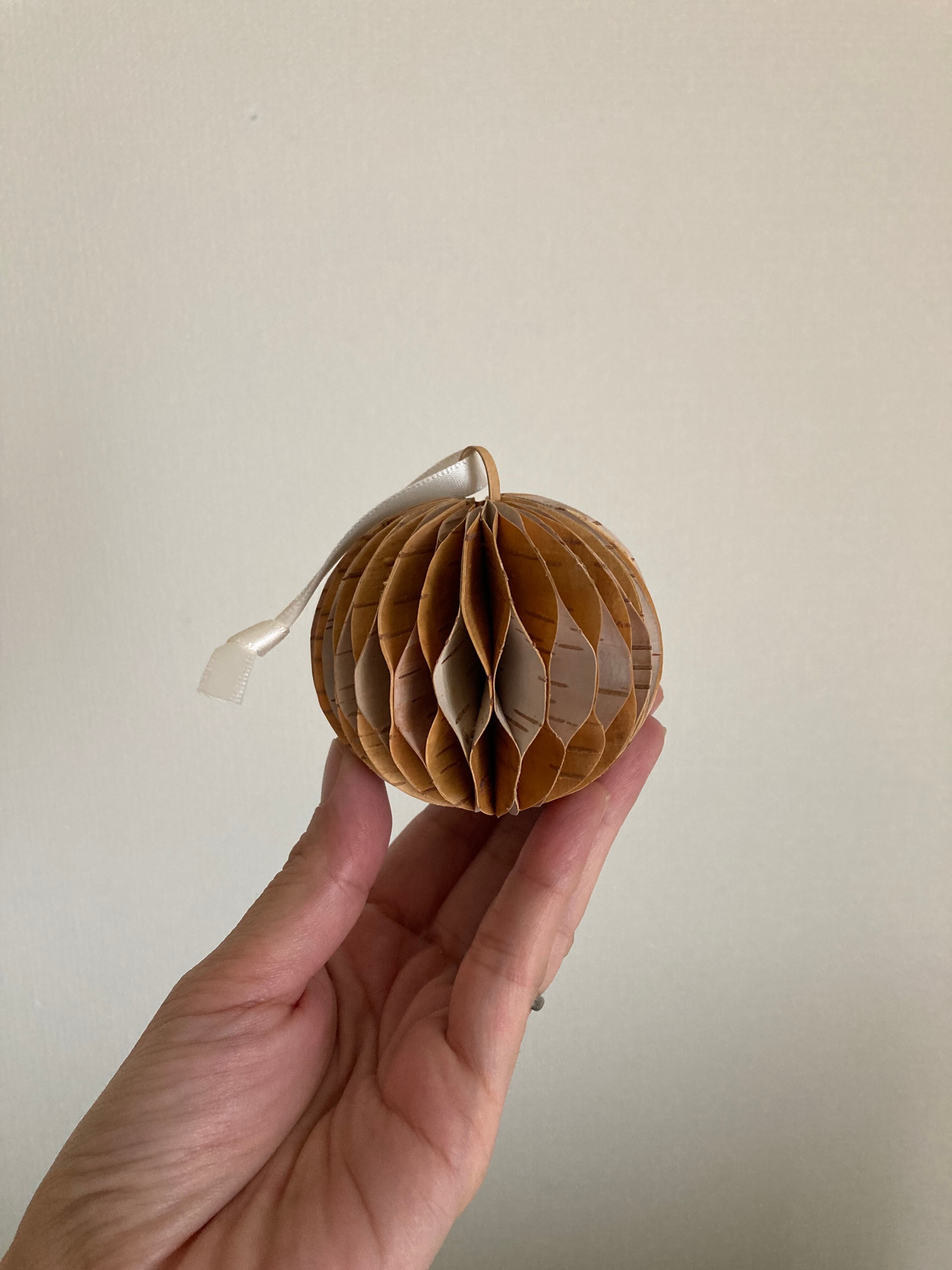 白樺の樹皮を何枚も重ねてボール状にした、とても凝った作りの白樺のオーナメントボール。